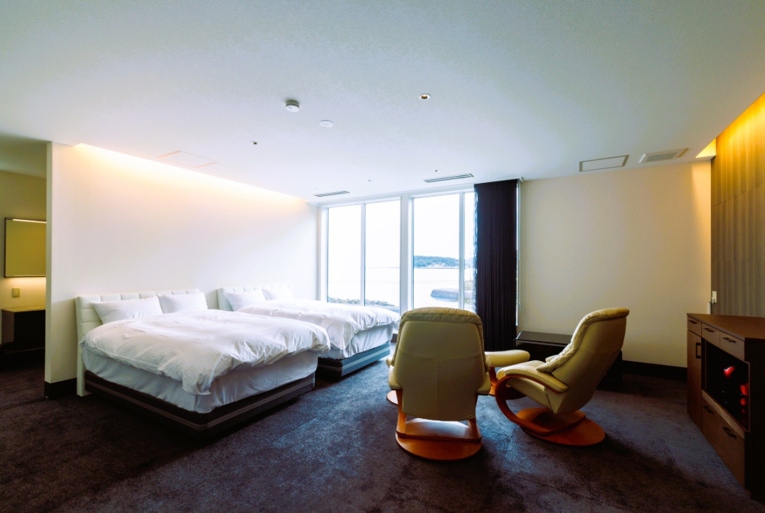 朝日が差し込むブルーを基調としたスウィートルーム。窓辺からの眺めは広く五島の海をお楽しみいただけます。