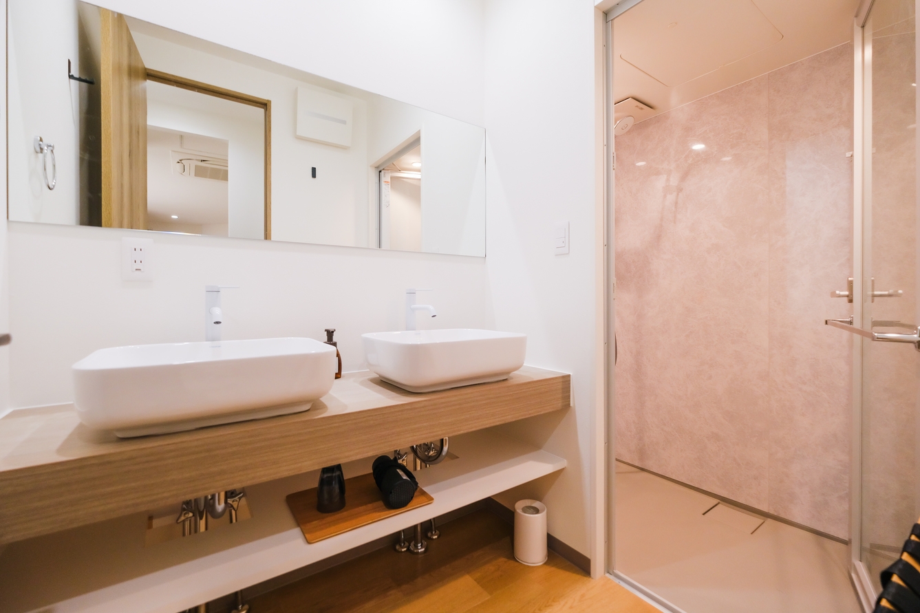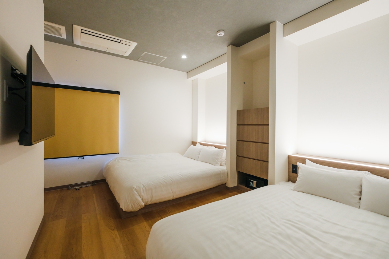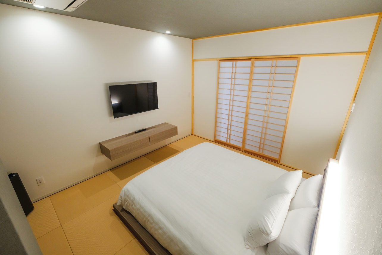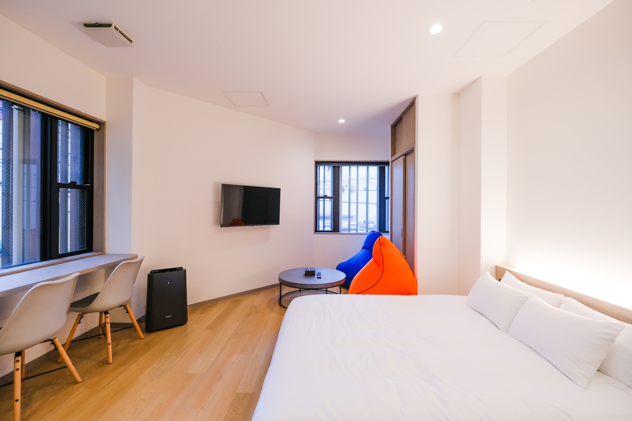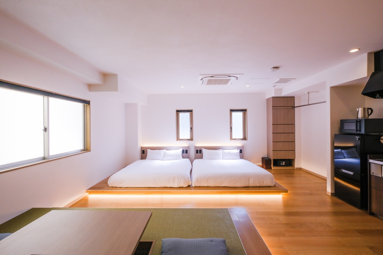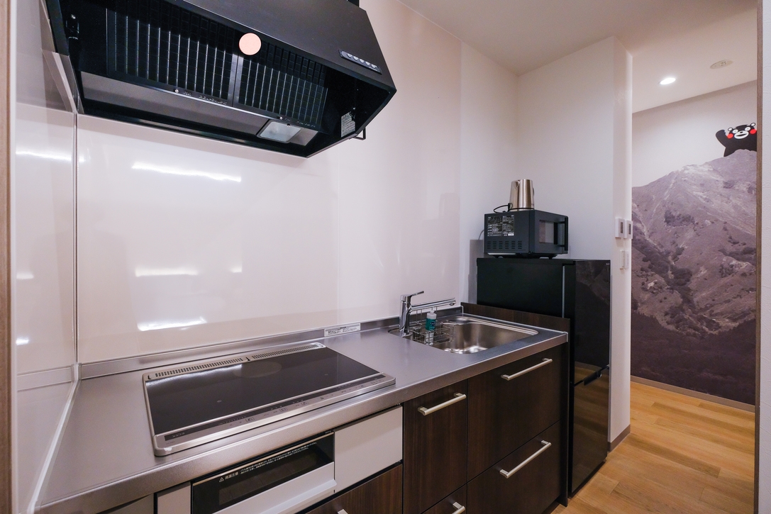 くまモンがたくさんいて、さらに47平米の大きいお部屋で、冷蔵庫、キッチン、洗濯機があります。