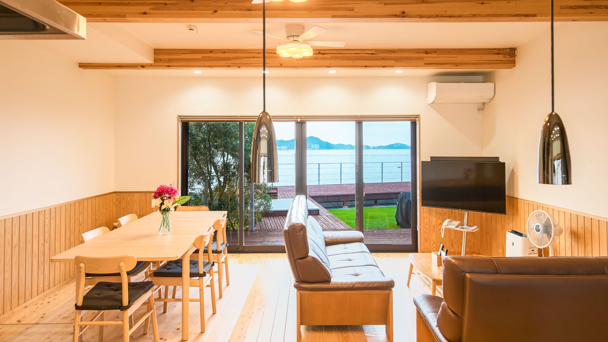 広々としたリビングルームの大きな窓からは、鳴門海峡の美しい景色を一望できます。