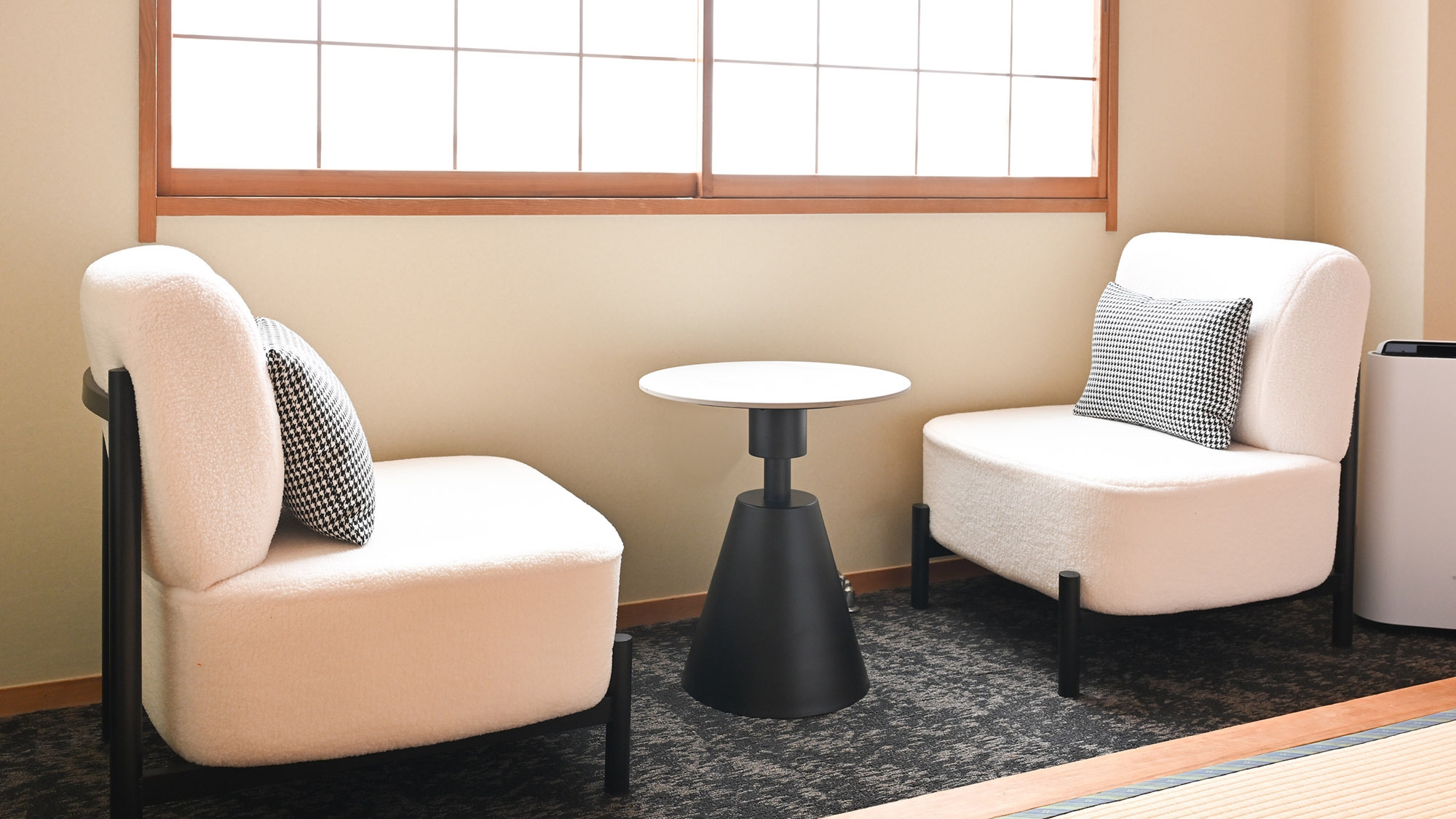 ナチュラルカラーで統一。落ち着いた雰囲気の和モダンデザインの客室。セミダブルベッド2台を設置。3名様でお泊りの場合は布団利用。客室内のお風呂は温泉ではありません