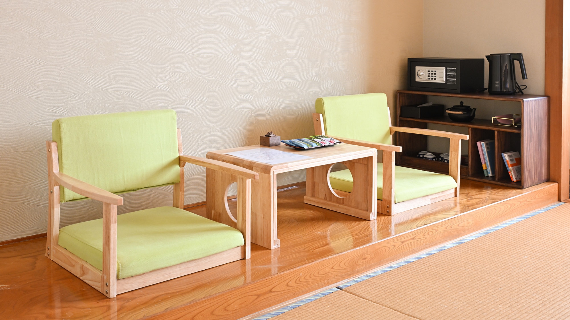 ゆったりとした眺望の良い客室。手足を伸ばしてお寛ぎください。4名様までお泊りいただけますのでご家族やグループでのご利用に最適。客室内のお風呂は温泉ではありません