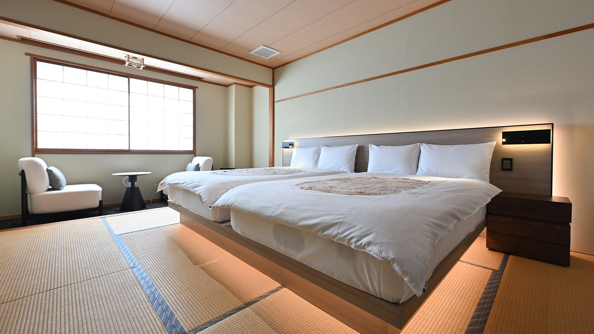 ナチュラルカラーで統一。落ち着いた雰囲気の和モダンデザインの客室。セミダブルベッド2台を設置。3名様でお泊りの場合は布団利用。お風呂は大浴場をご利用ください