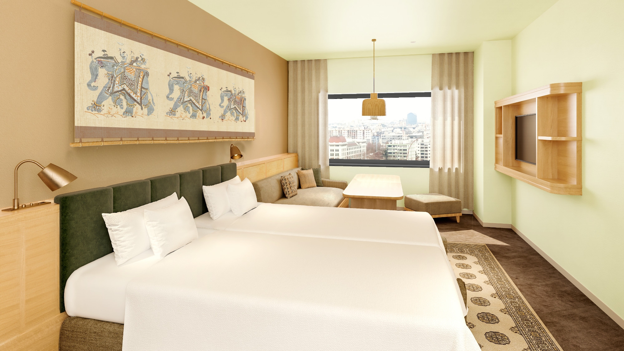 インドの街を彩るジャスミンの甘く淡い色をイメージ。インド洋をモチーフにした客室です。
