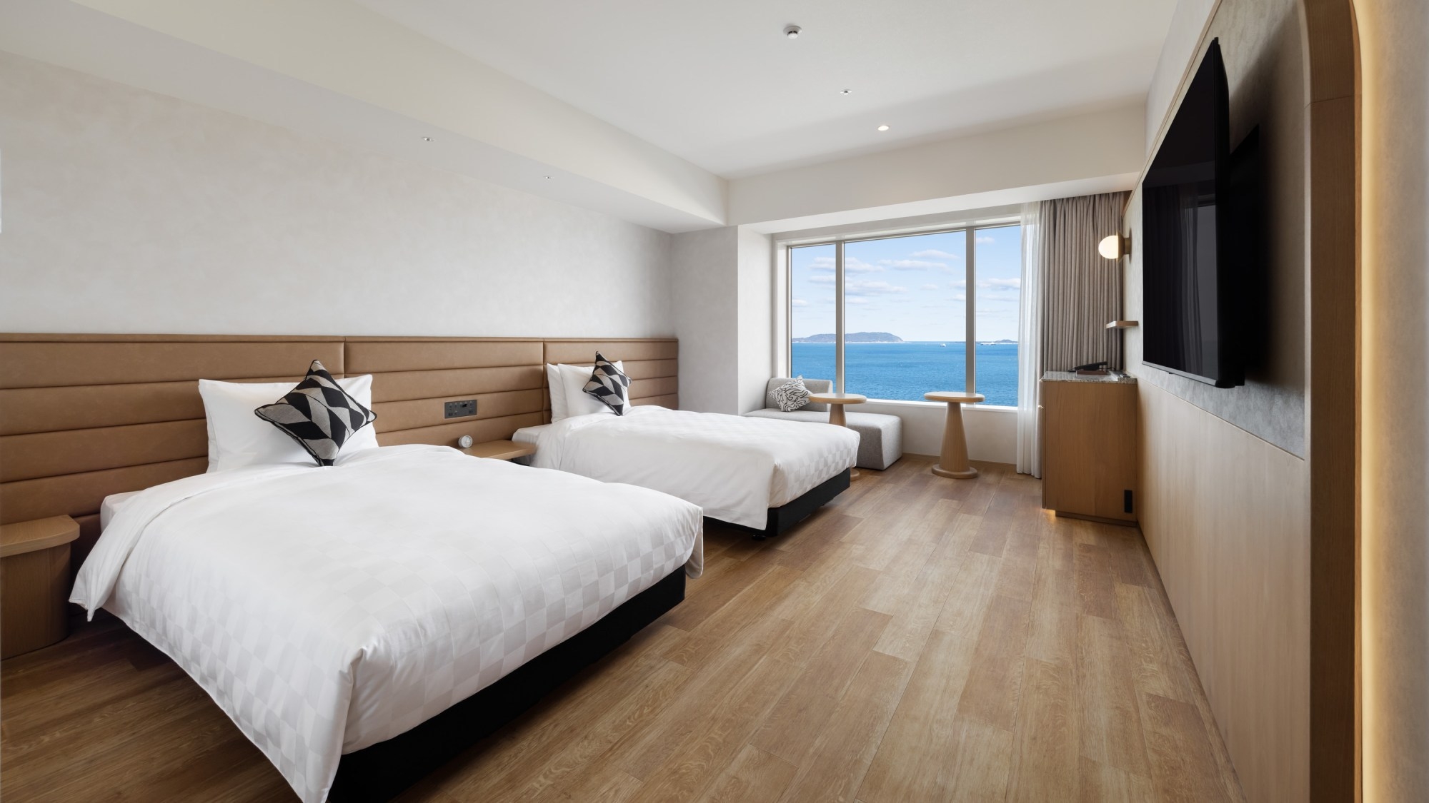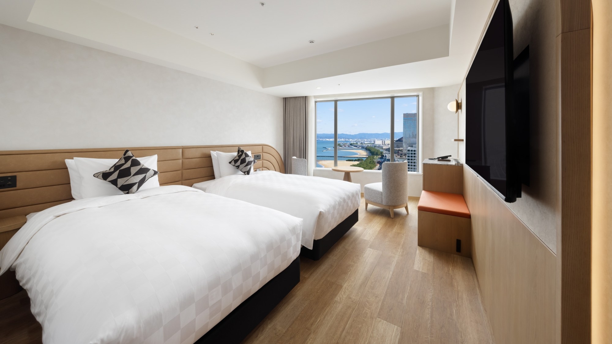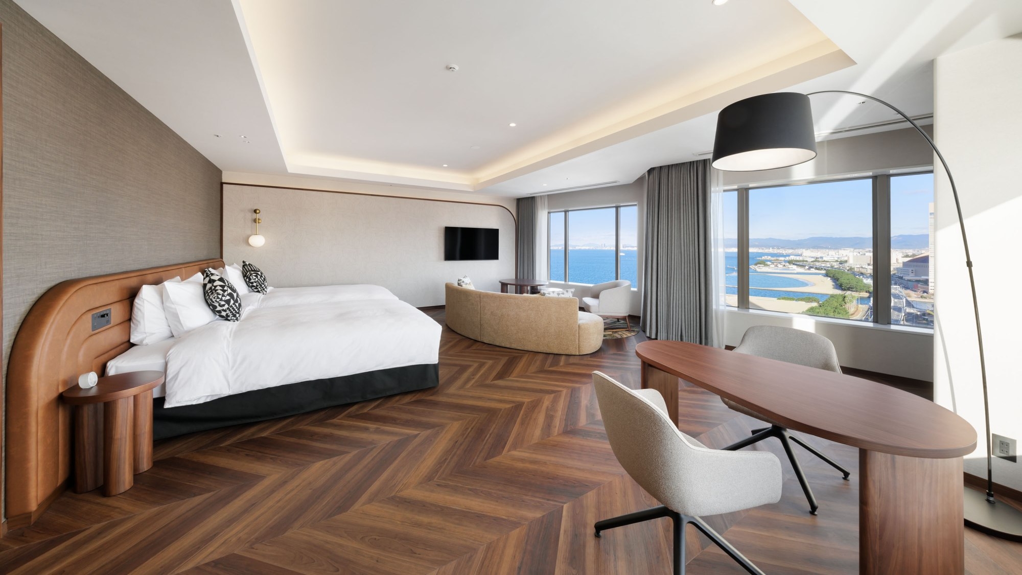 海とももち浜を望む広々客室。200cmキングベッドで特別な日の滞在に最適。