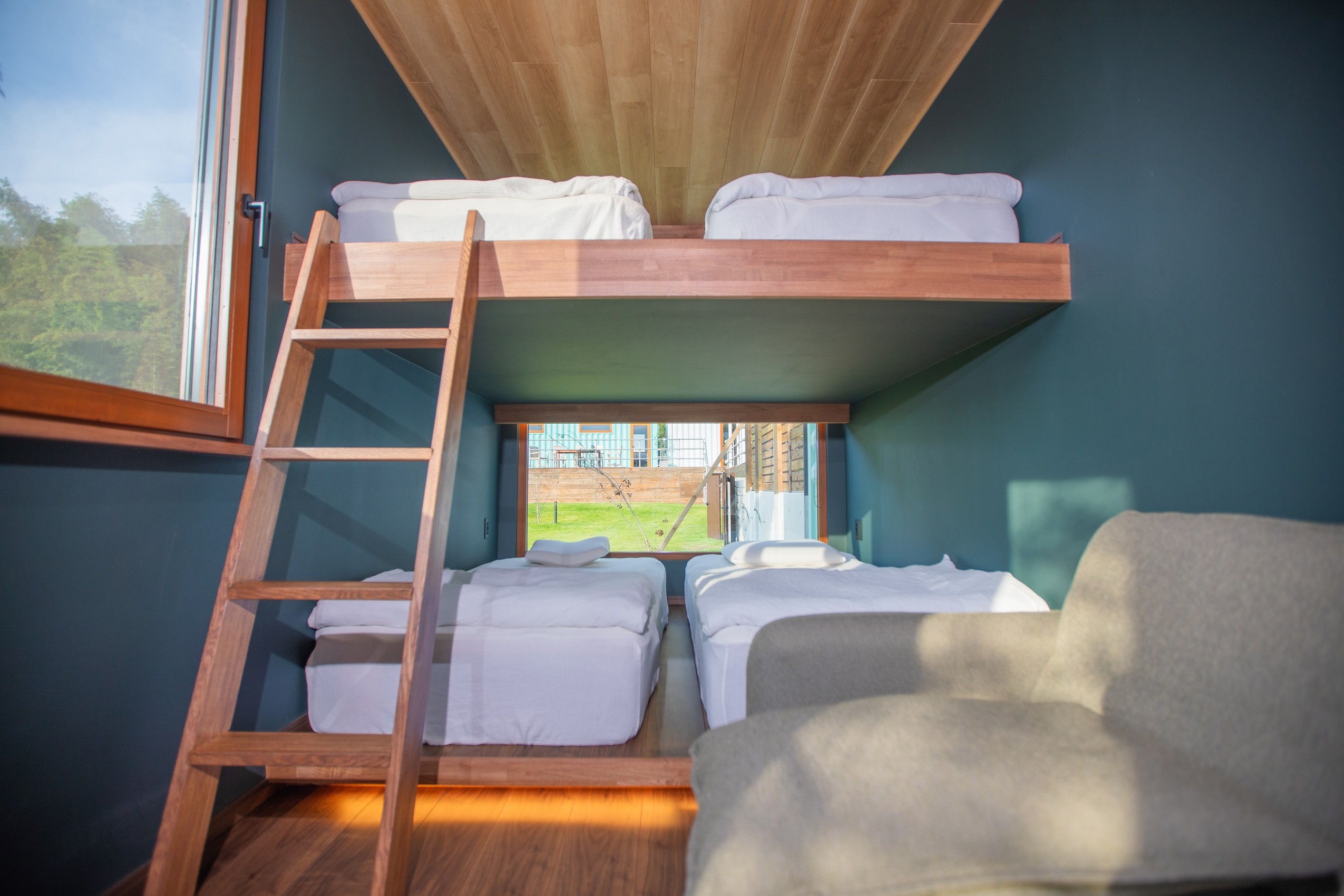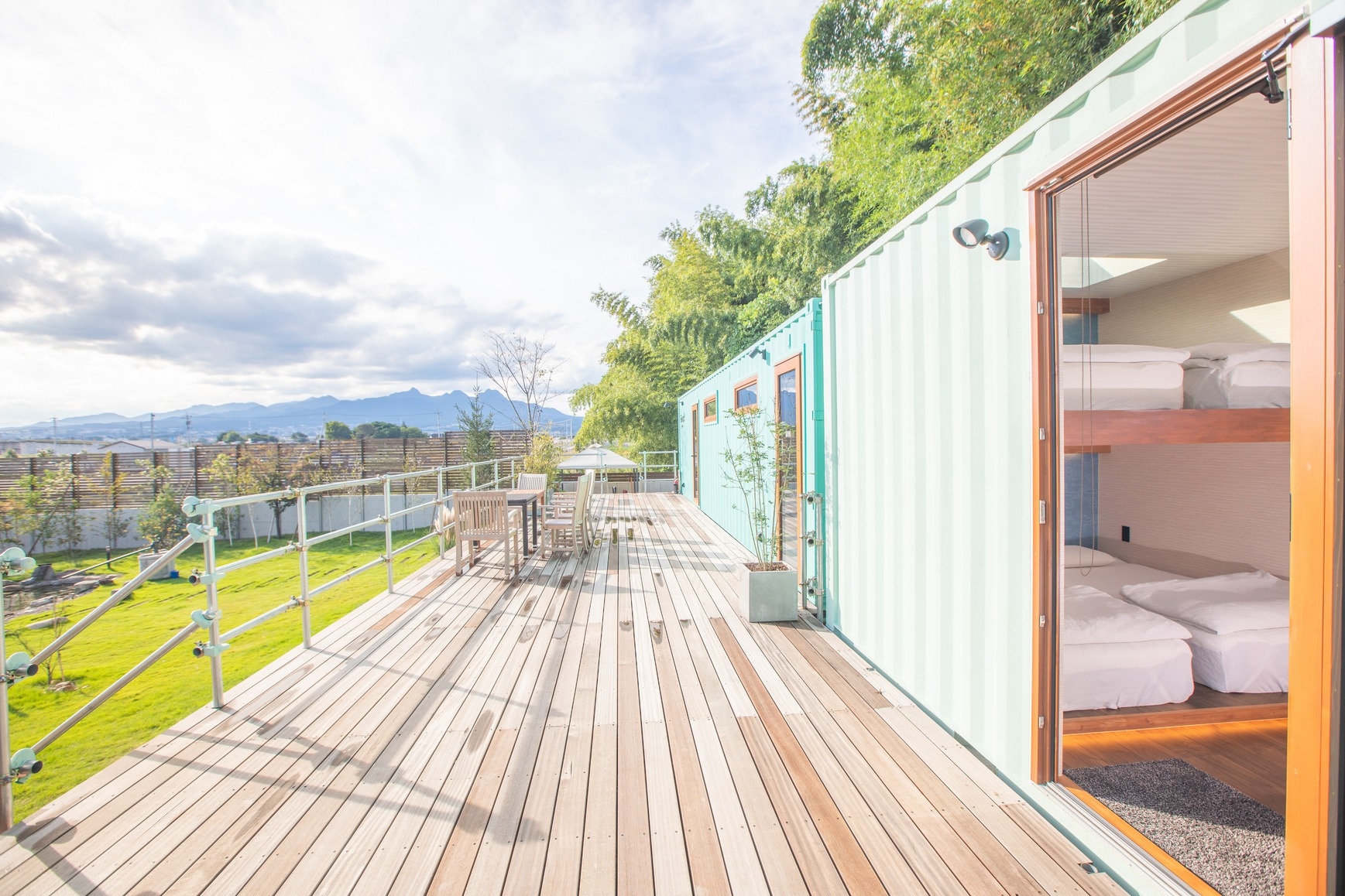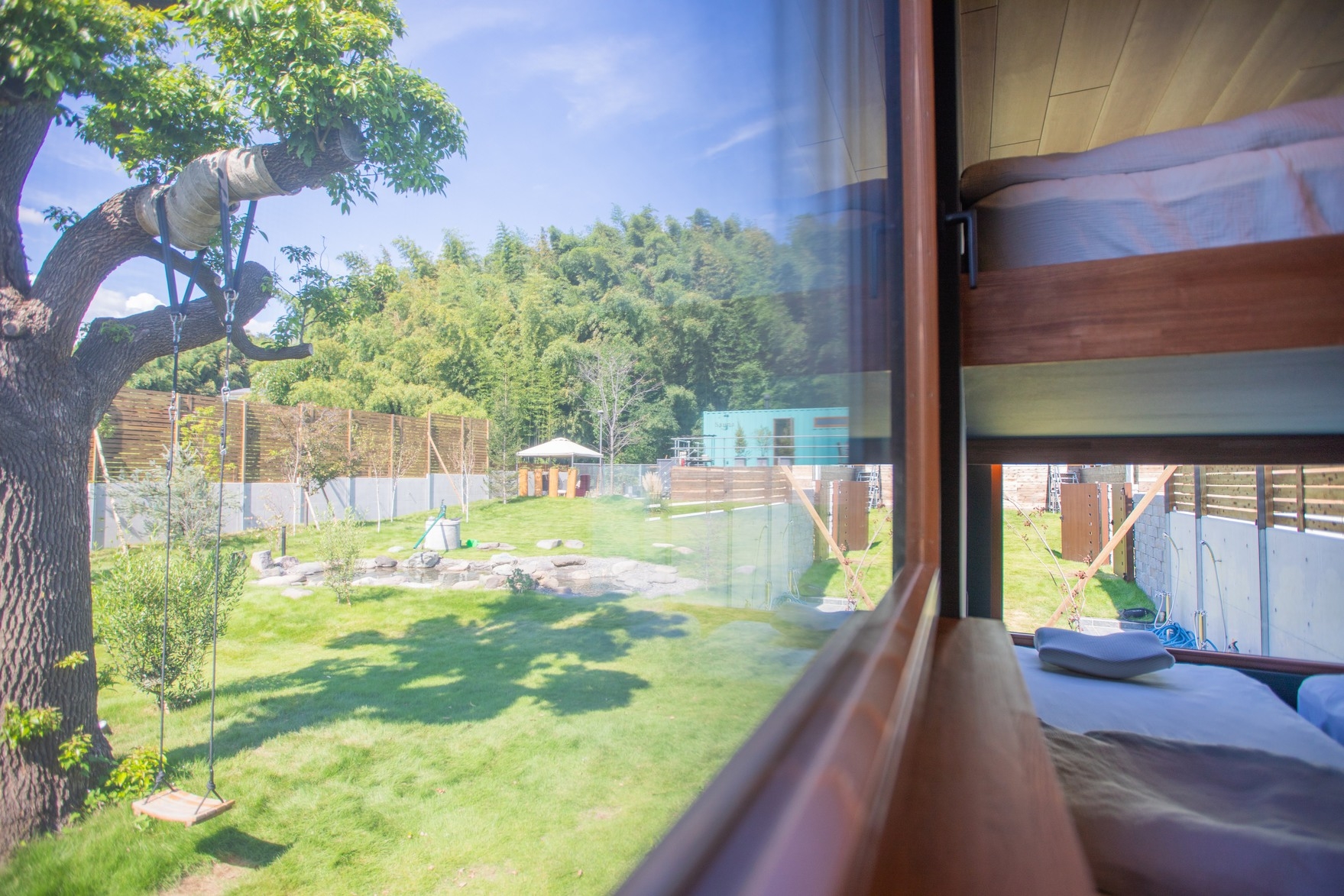 敷地面積1200平米の完全貸切のプライベートヴィラ。高さ4.5m塀に囲まれ圧倒的没入感。4台のトレーラーハウス(リビングルーム・サウナルーム・ベッドルーム2棟)