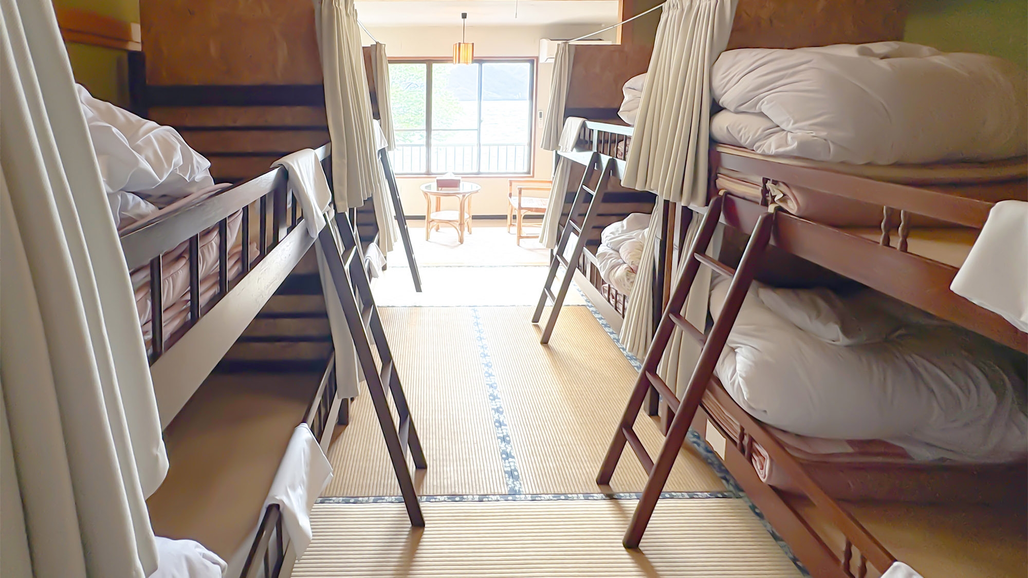 ドミトリールームの貸切部屋。団体様やお友達同士の大人数での利用、家族利用などにおすすめ。2段ベッド4台で、合計8人まで宿泊可能。お部屋からは十和田湖を一望可能。