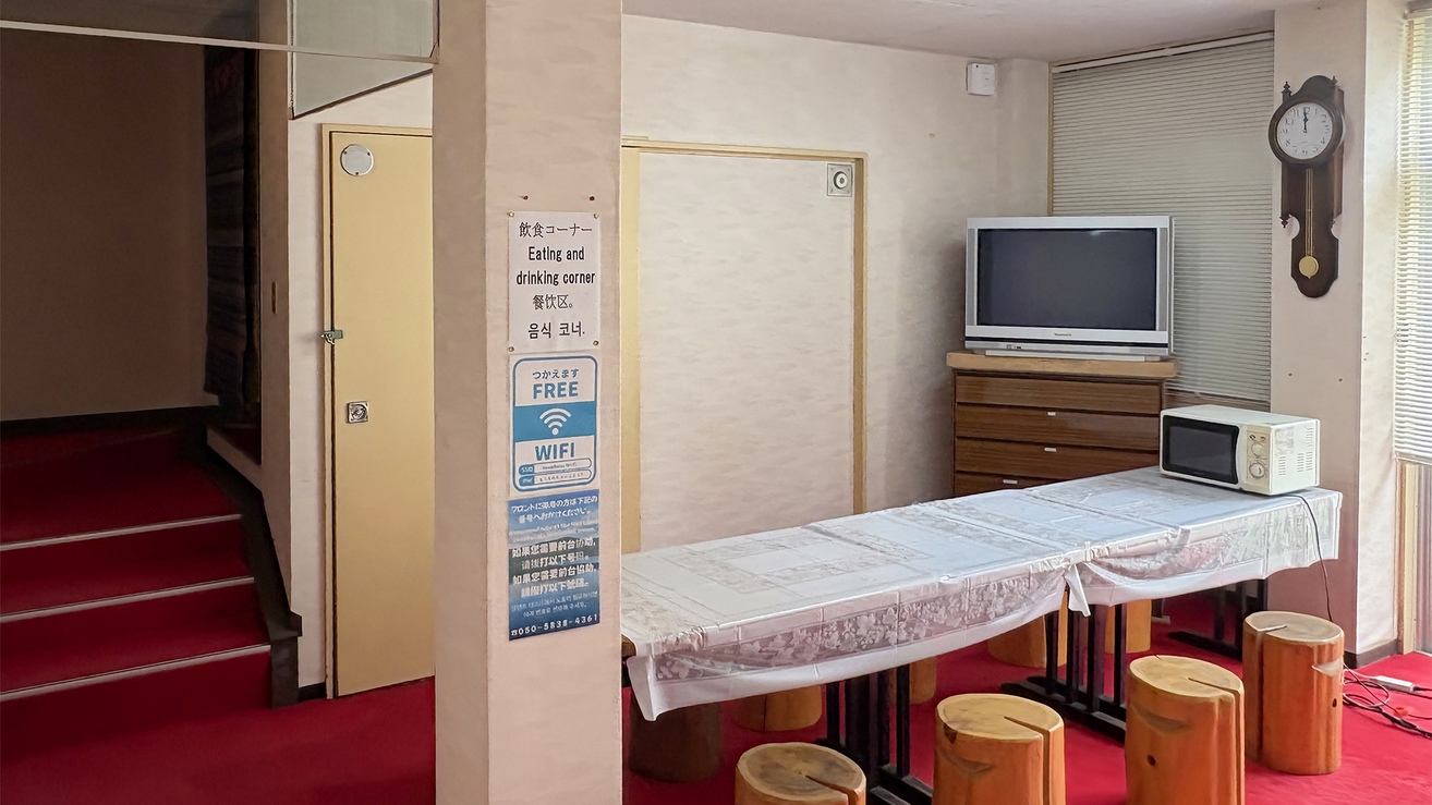 フロント、共有お食事スペース(電子レンジ、電気ポット、冷蔵庫)、喫煙スペース