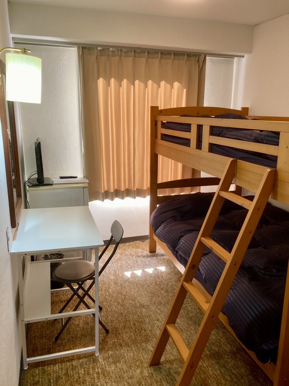 設備:2段ベッド、ユニットバス(トイレ/バス/洗面所)、テレビ、冷蔵庫、エアコン