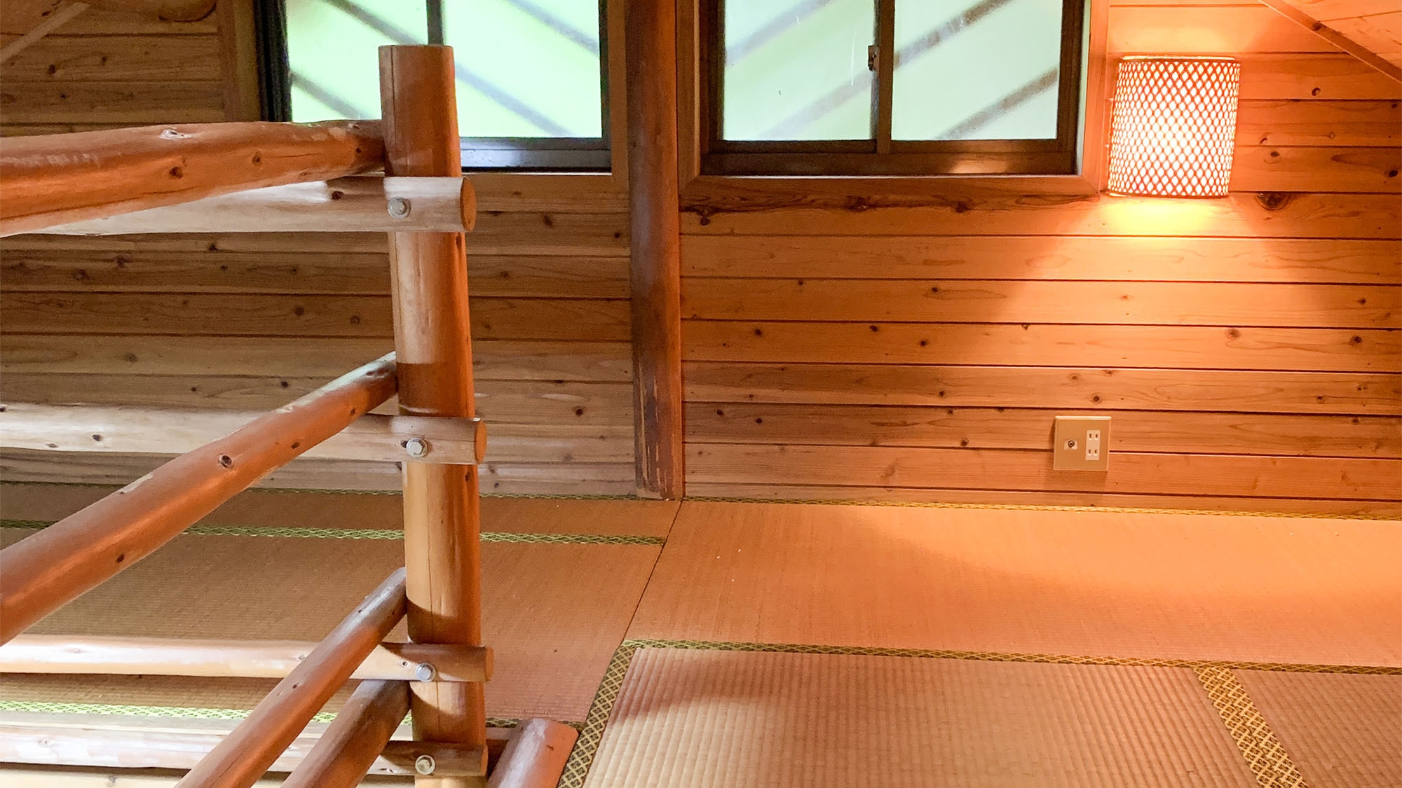 1名様から4名様までご滞在いただけるロフトスタイルの2階建コテージ。お客様自身にて布団敷きをお願いします ※3点ユニットタイプのバストイレ〔建物内禁煙〕