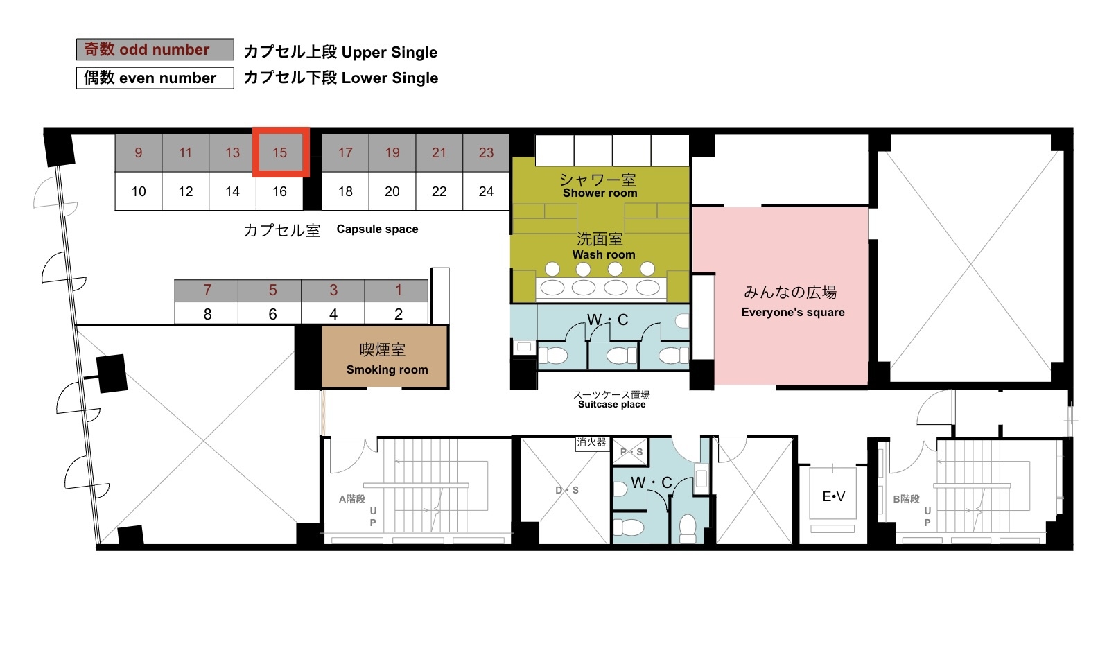 カプセル15番(上段)のお部屋です。 シャワー・トイレは共用となります