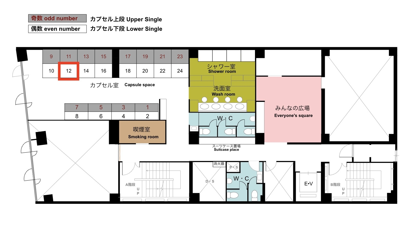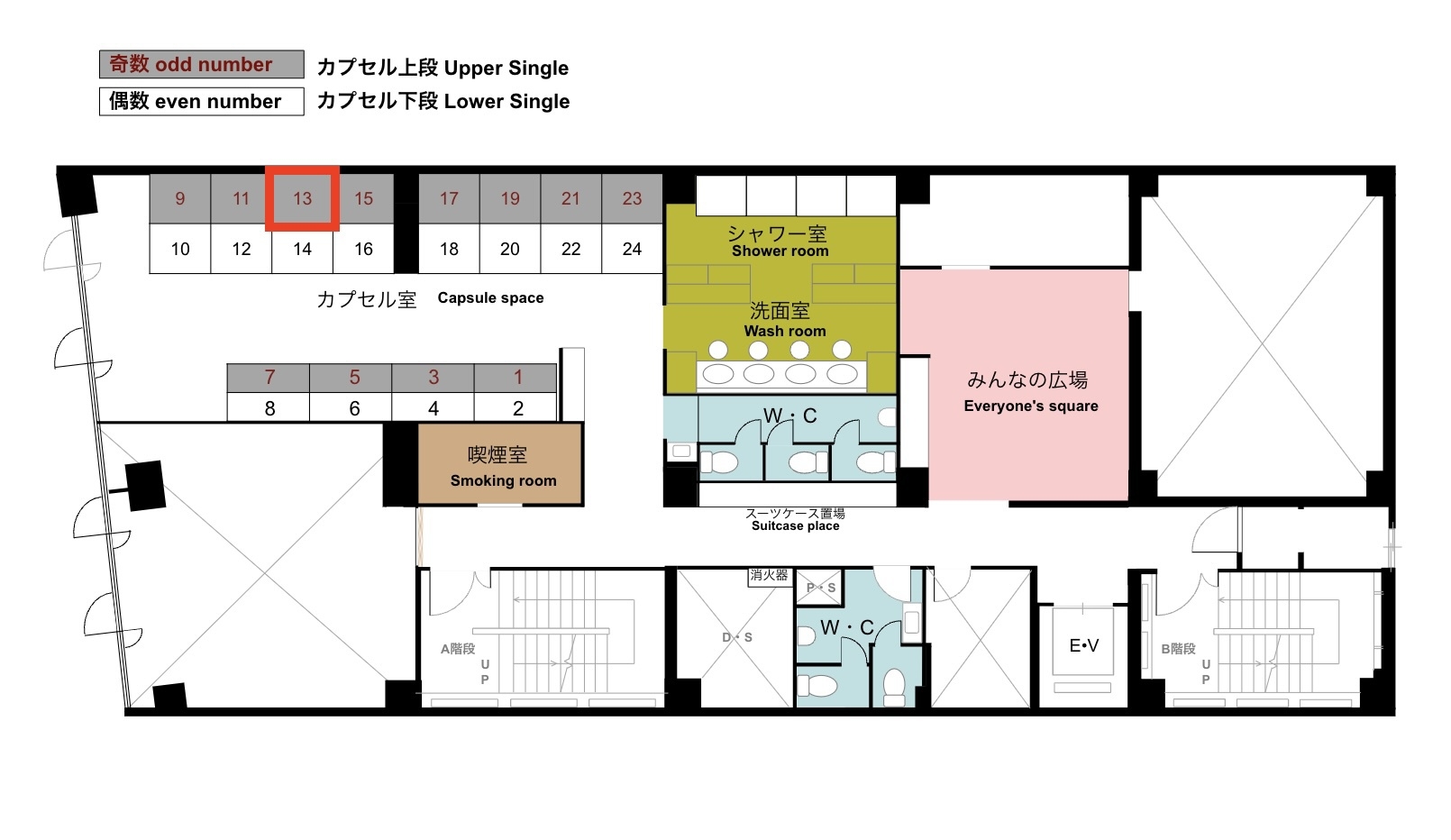 カプセル13番(上段)のお部屋です。 シャワー・トイレは共用となります