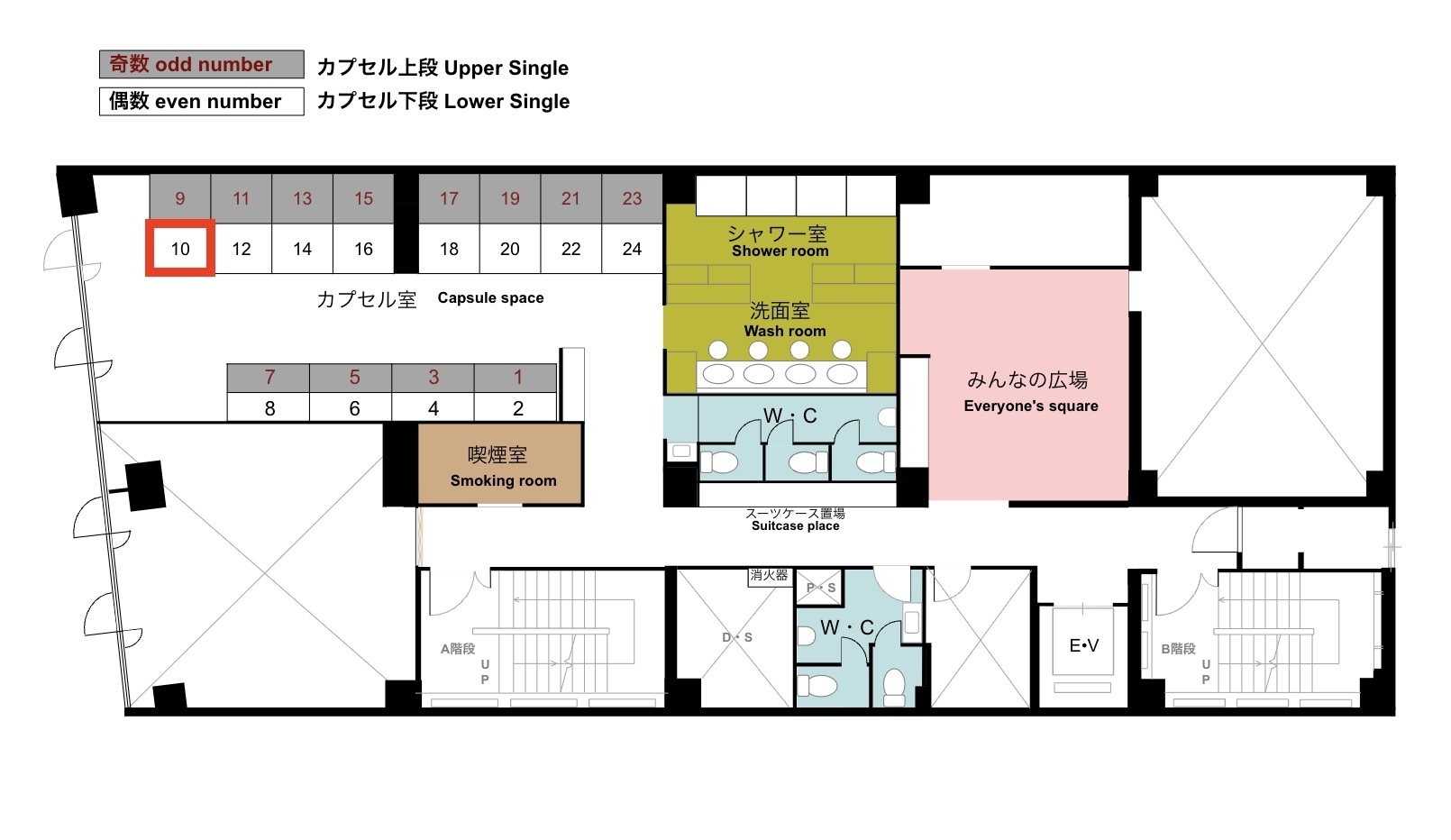 カプセル10番(下段)のお部屋です。 シャワー・トイレは共用となります。