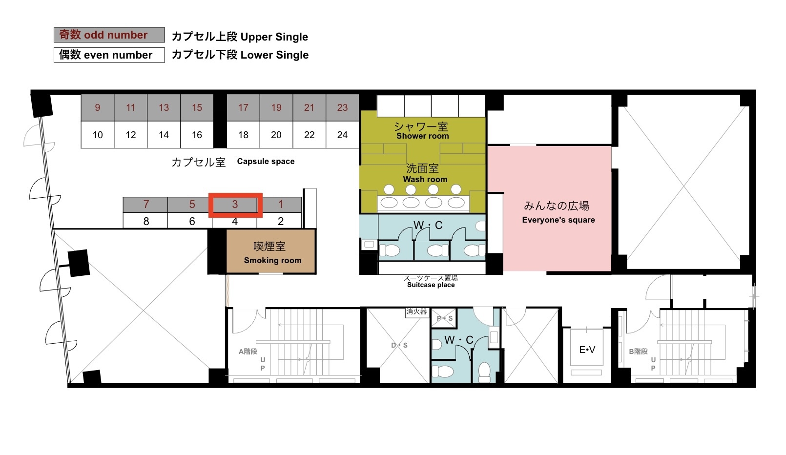 カプセル3番(上段)のお部屋です。 シャワー・トイレは共用となります