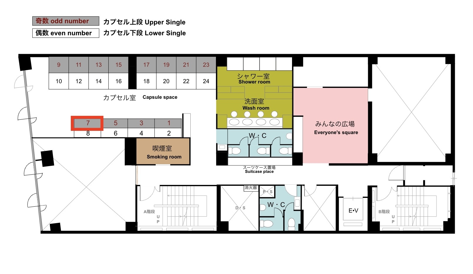 カプセル7番(上段)のお部屋です。 シャワー・トイレは共用となります