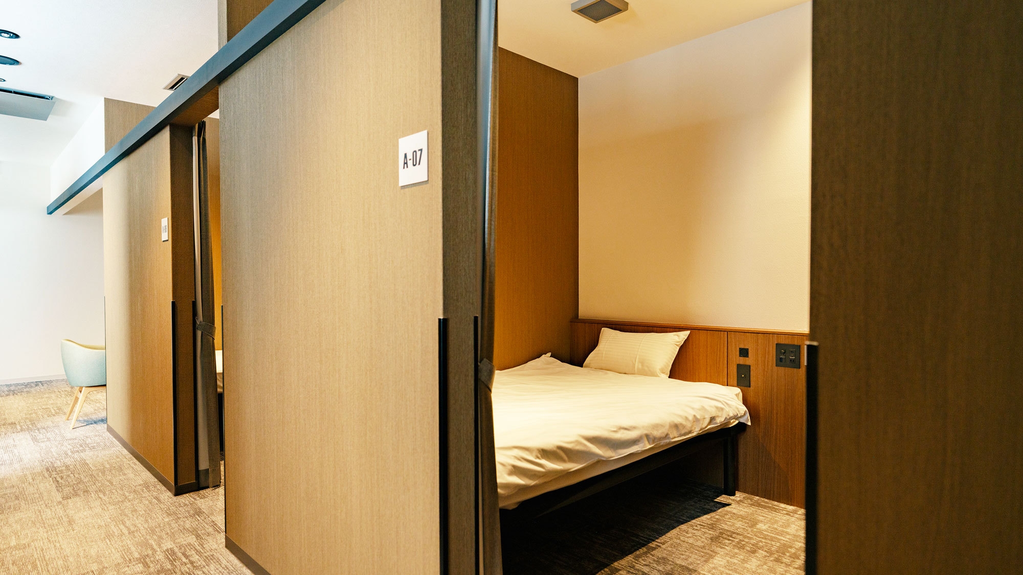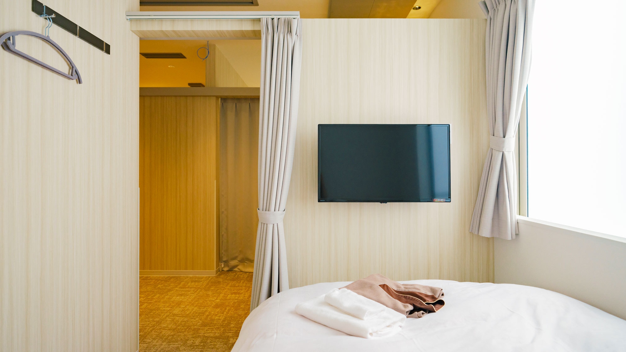 カーテンで仕切られたキャビン内はゆったりとしており、荷物を置いたり、着替え・身支度も楽々♪施錠不可/トイレ共用/お風呂は「最高の湯」をご利用ください。