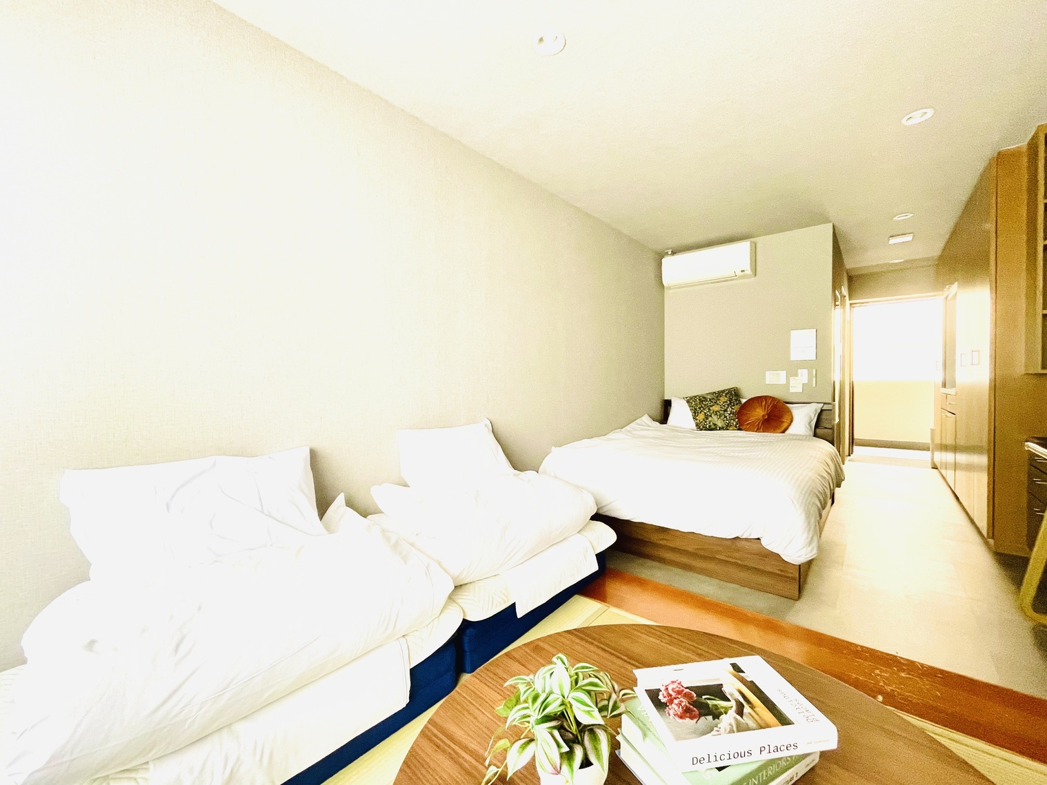 ダブルベッド1台と敷布団2セットの和洋室!冷蔵庫・電子レンジ・電気ケトル付