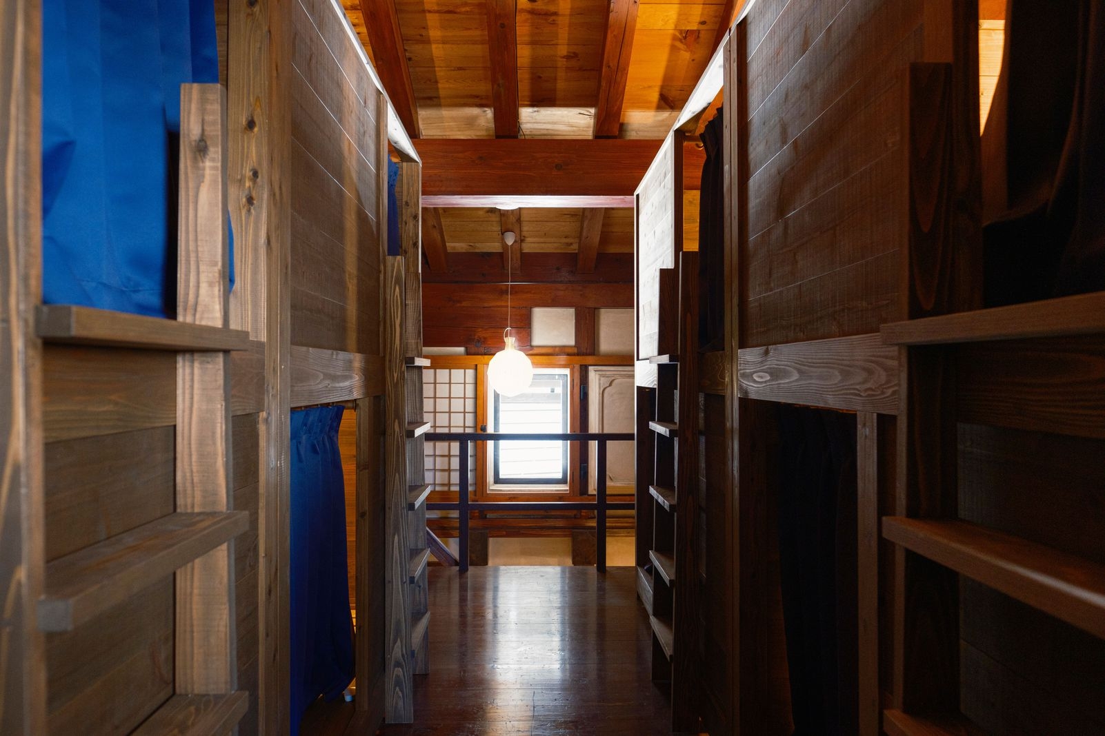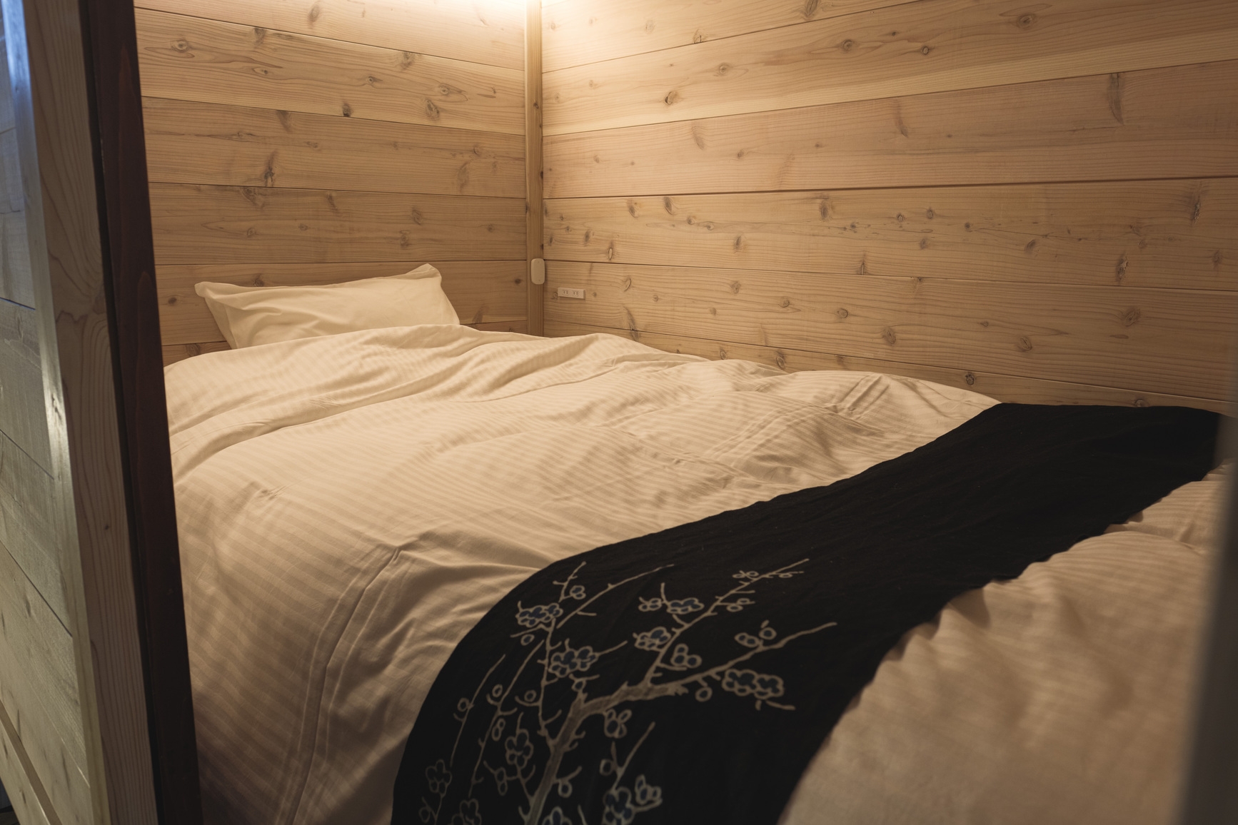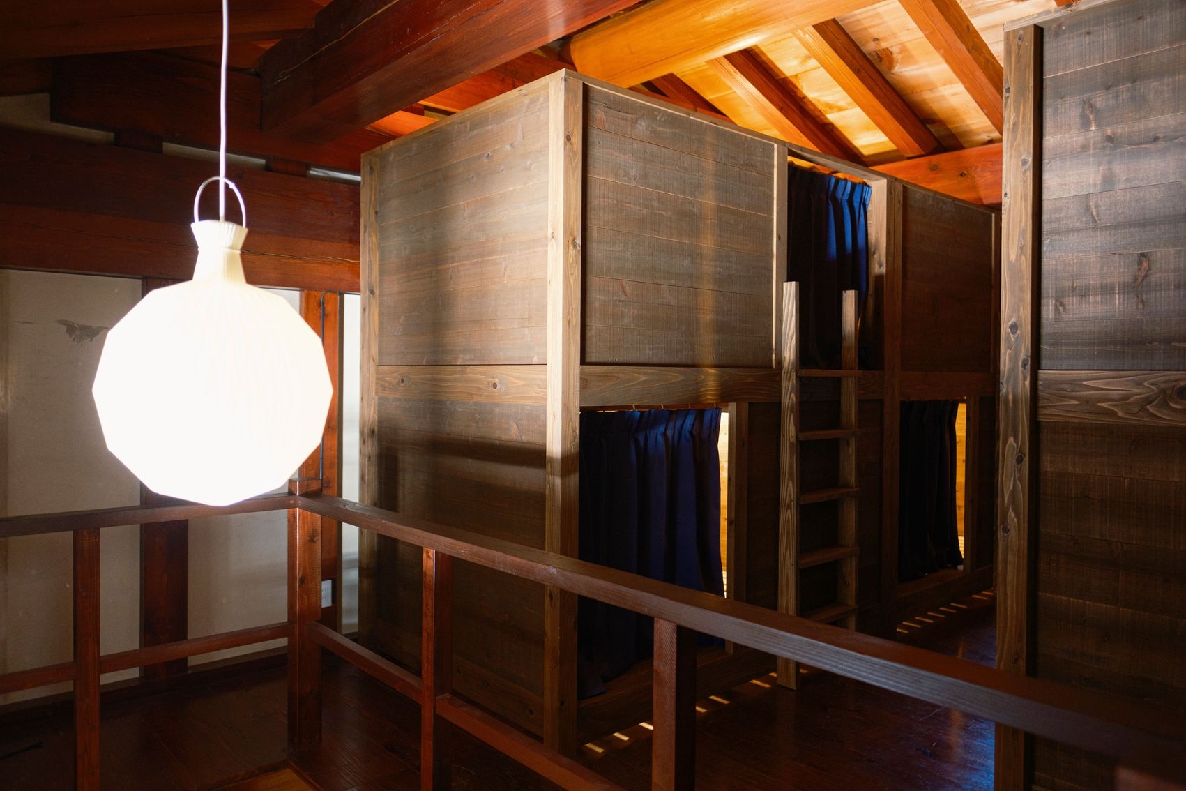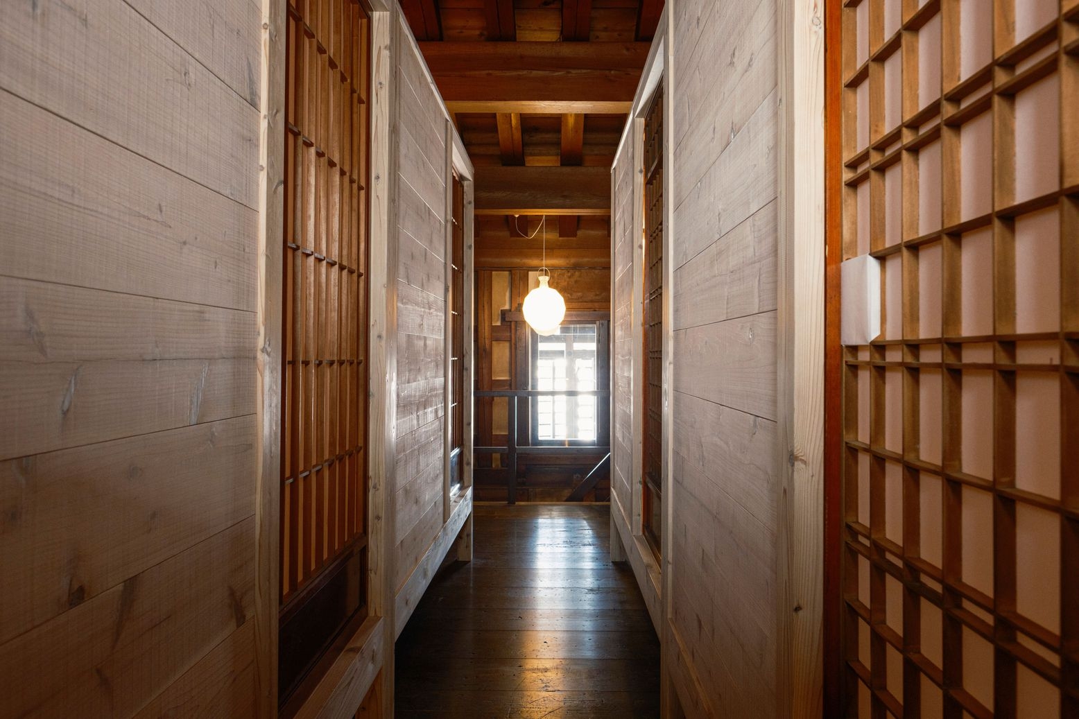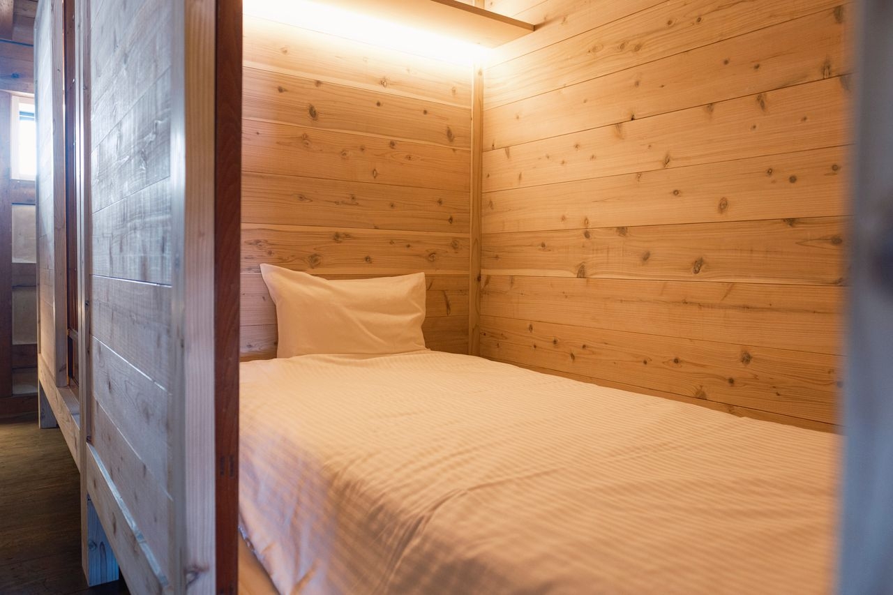 かつて柴与家の別荘に滞在した放浪の画人「蓑虫山人」のトレードマークである「笈(おい)」から着想を得て、秋田杉の板倉構法で組み上げた2タイプのドミトリールーム。