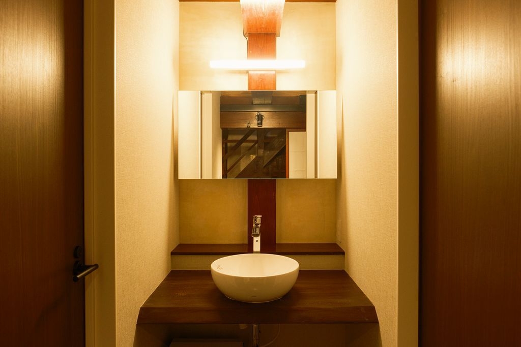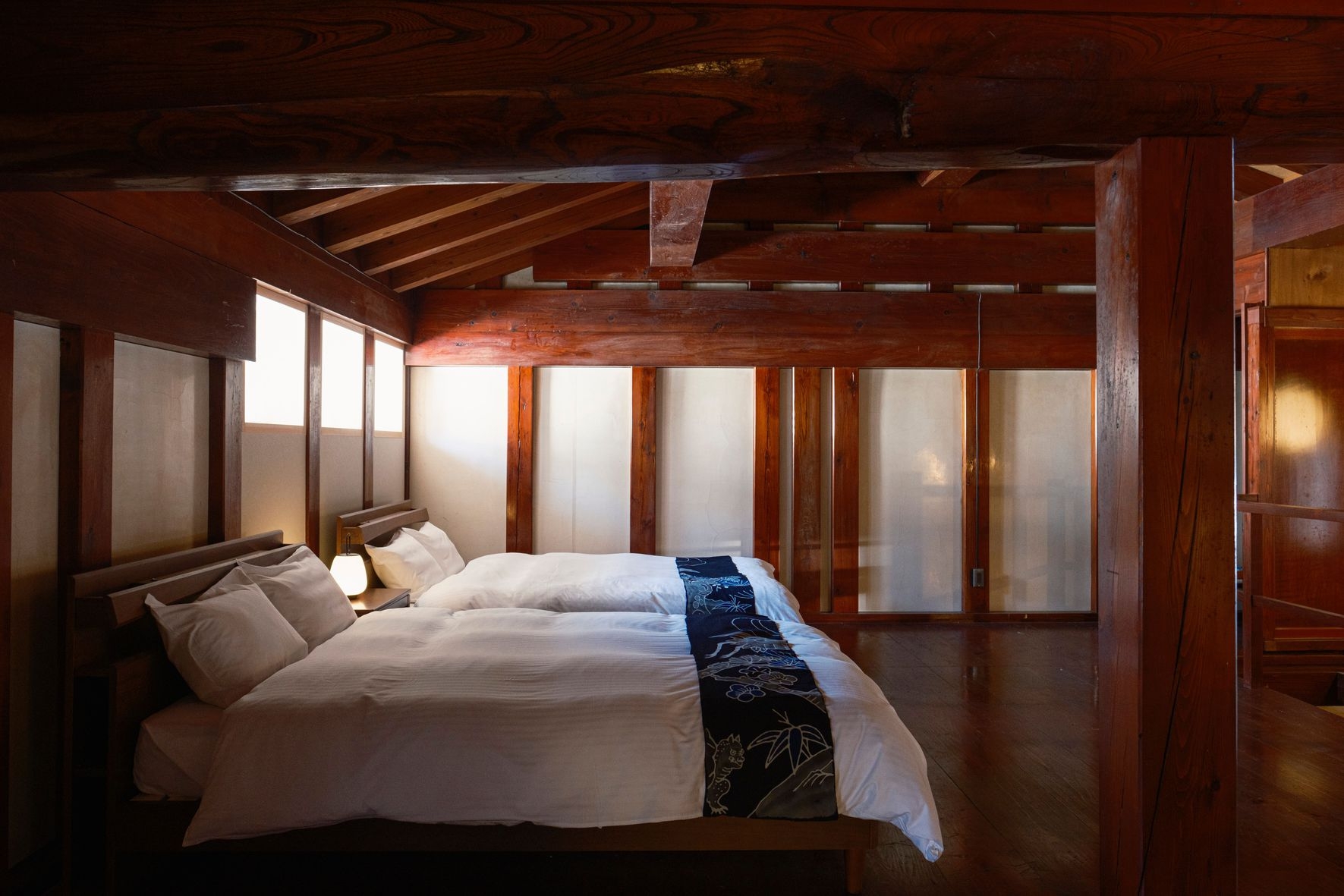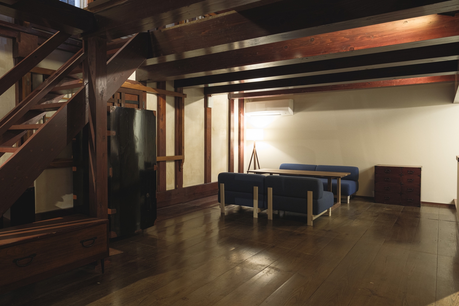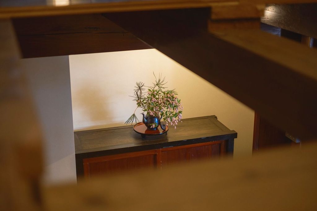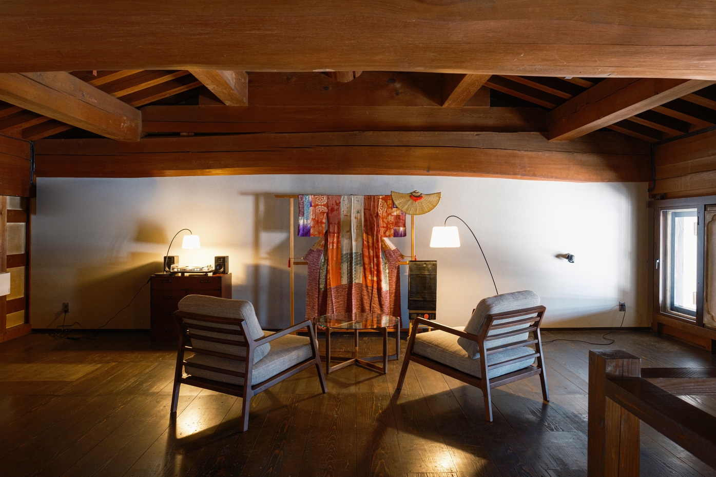 1階にはミニキッチン付きのダイニングとバスルーム、梁を臨む2階の寝室には端縫い衣装とレコードプレイヤーを設え、盆踊りとともに刻まれてきた歴史を体感いただけます。
