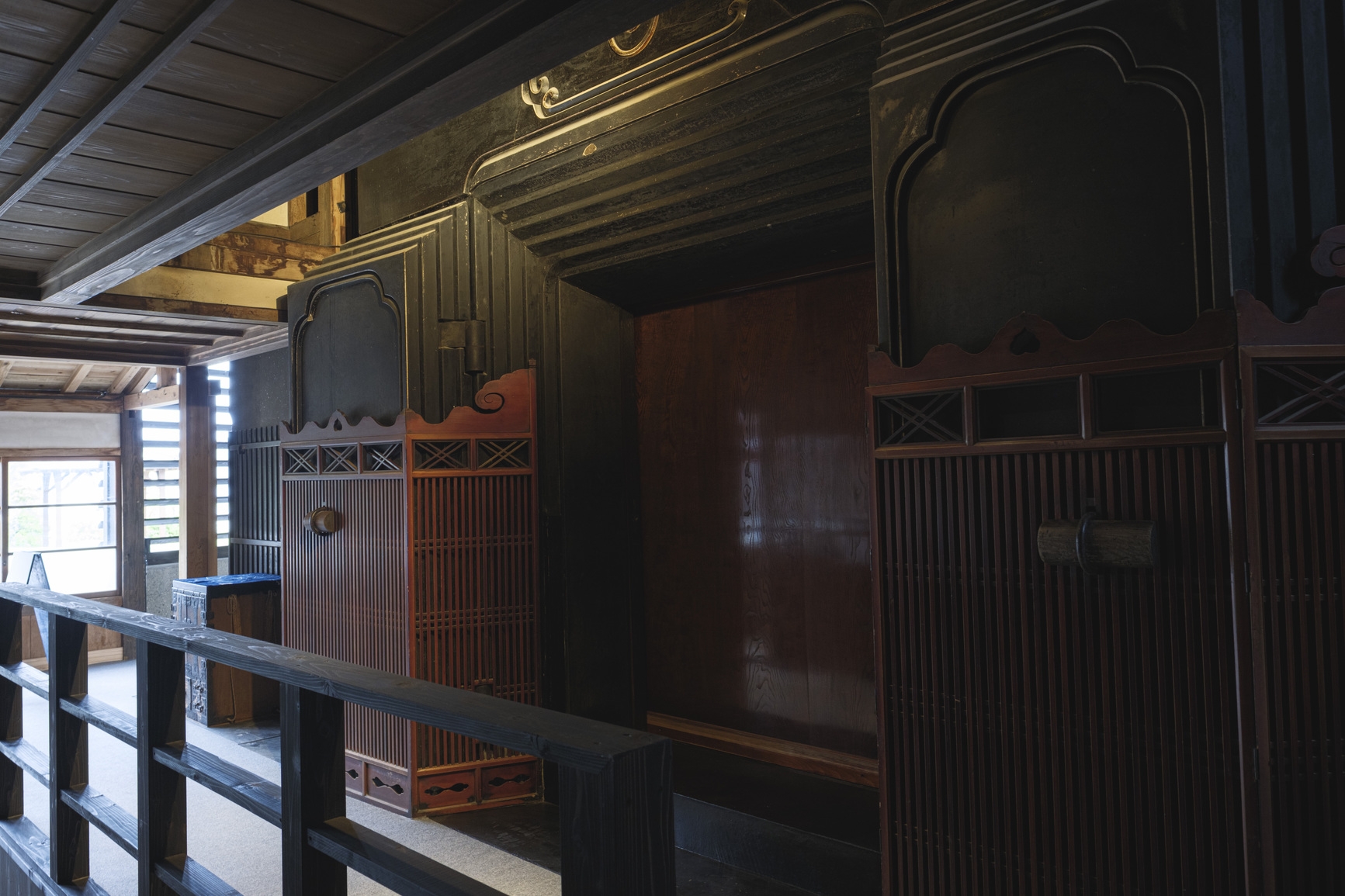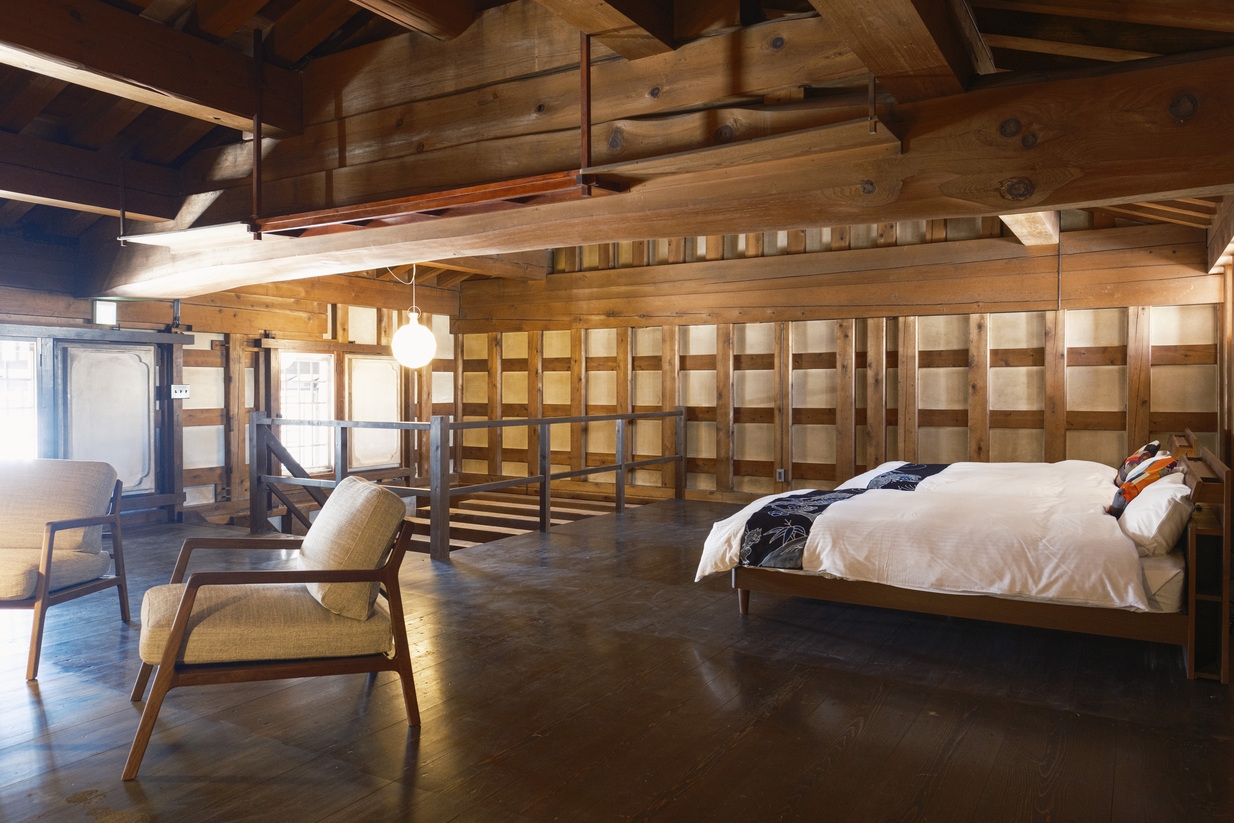 かつて柴与家の別荘に滞在した放浪の画人「蓑虫山人」のトレードマークである「笈(おい)」から着想を得て、秋田杉の板倉構法で組み上げた2タイプのドミトリールームのお好きなタイプを貸切でご宿泊いただけます。