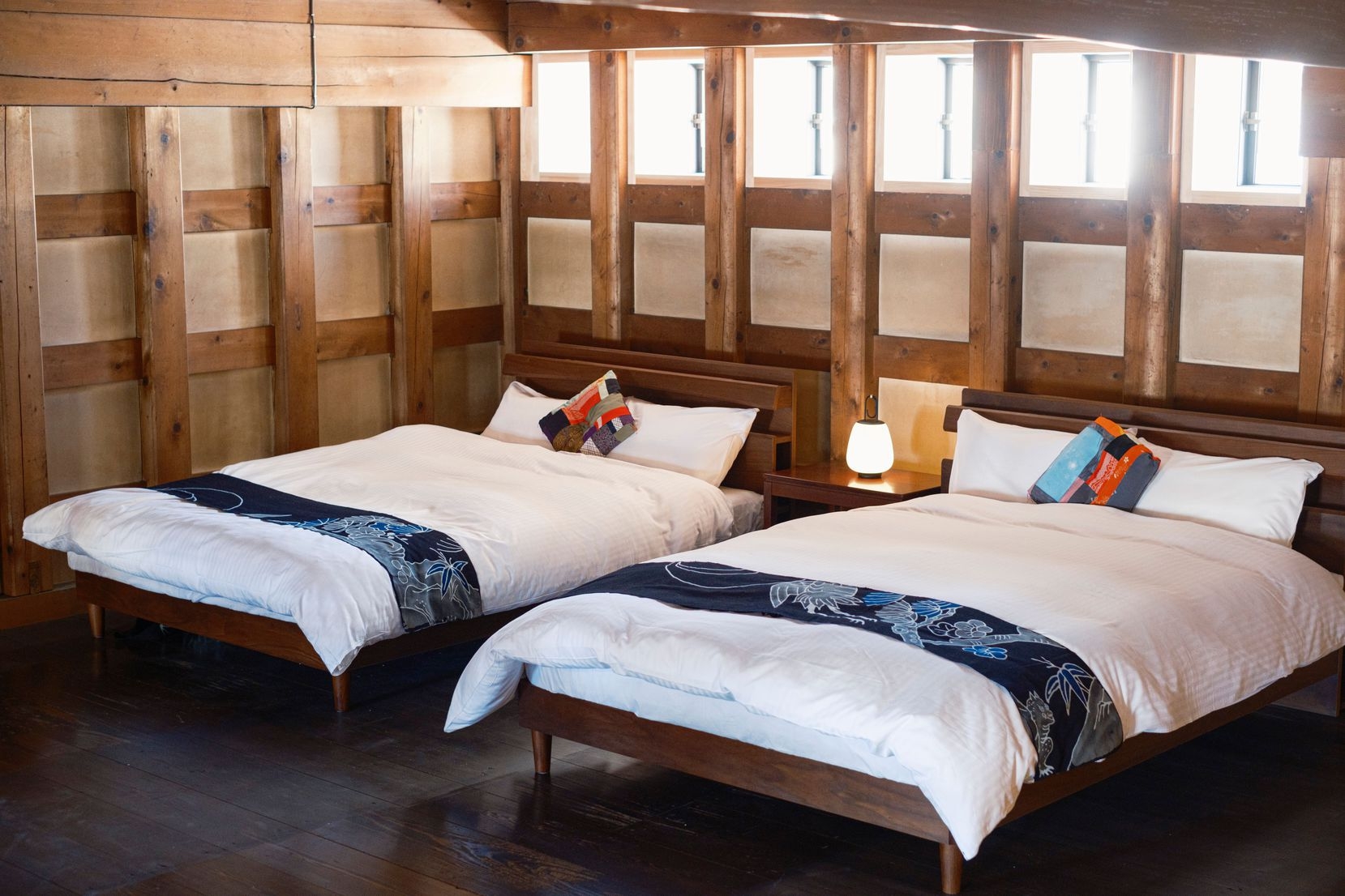 かつて柴与家の別荘に滞在した放浪の画人「蓑虫山人」のトレードマークである「笈(おい)」から着想を得て、秋田杉の板倉構法で組み上げた2タイプのドミトリールームにご宿泊いただけます。