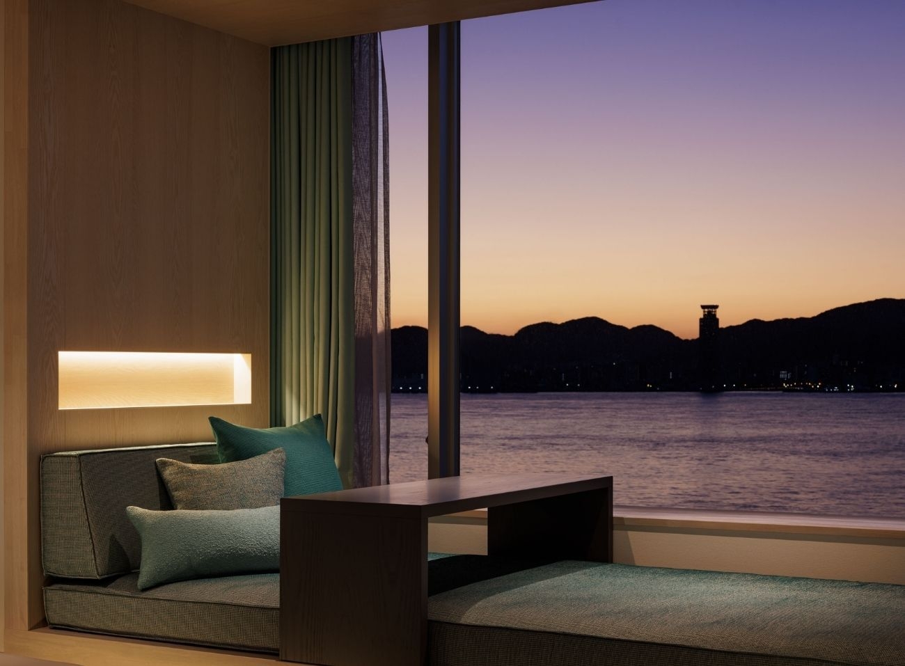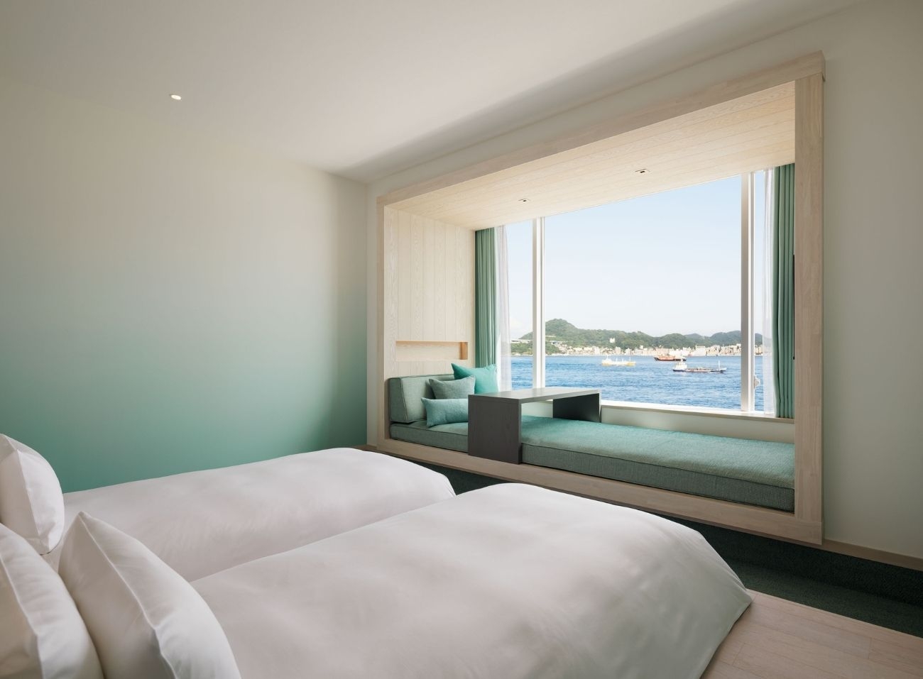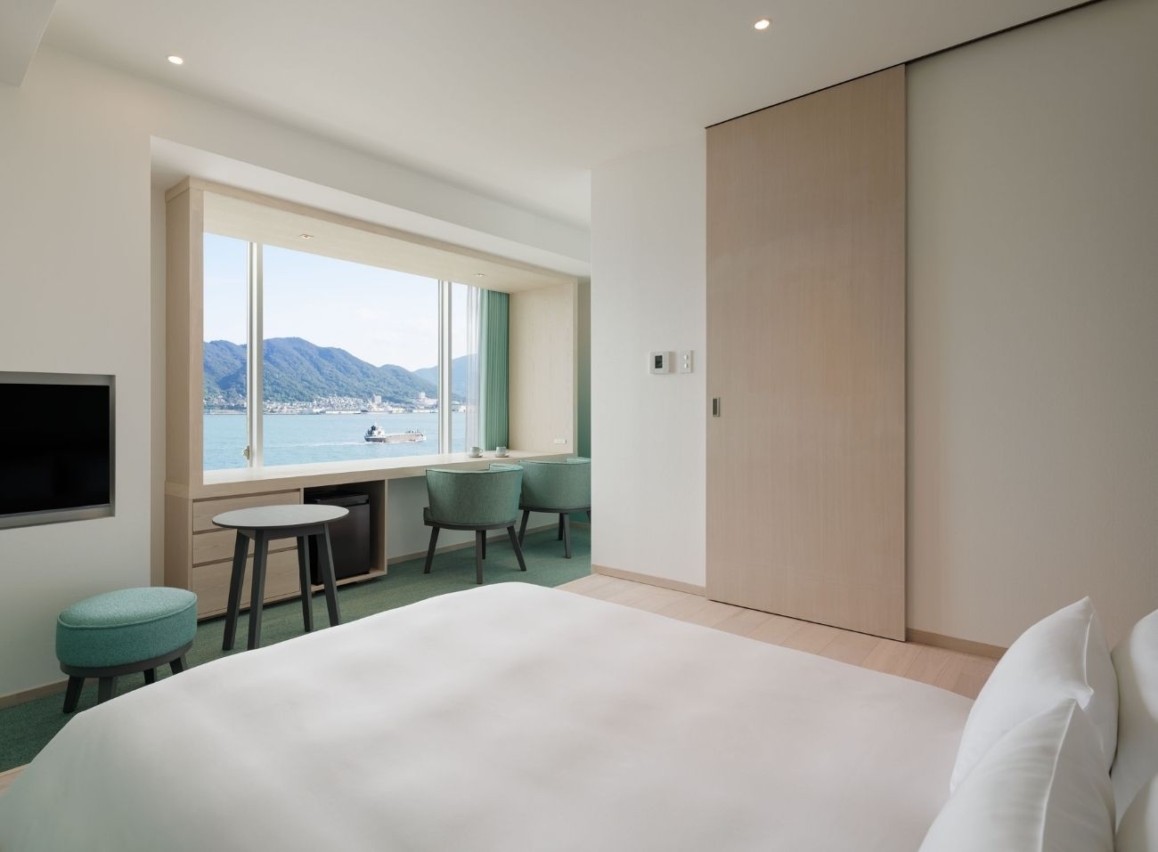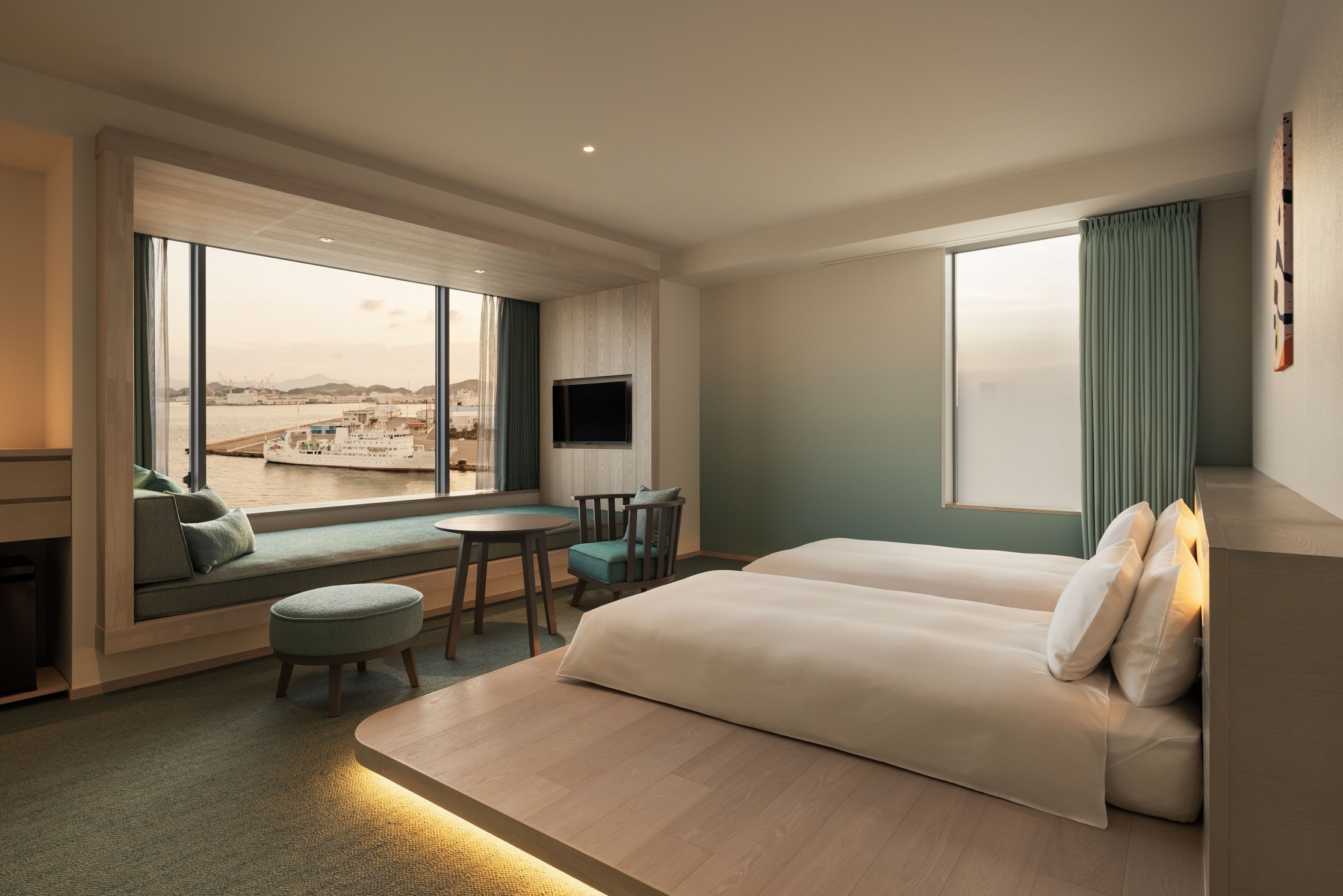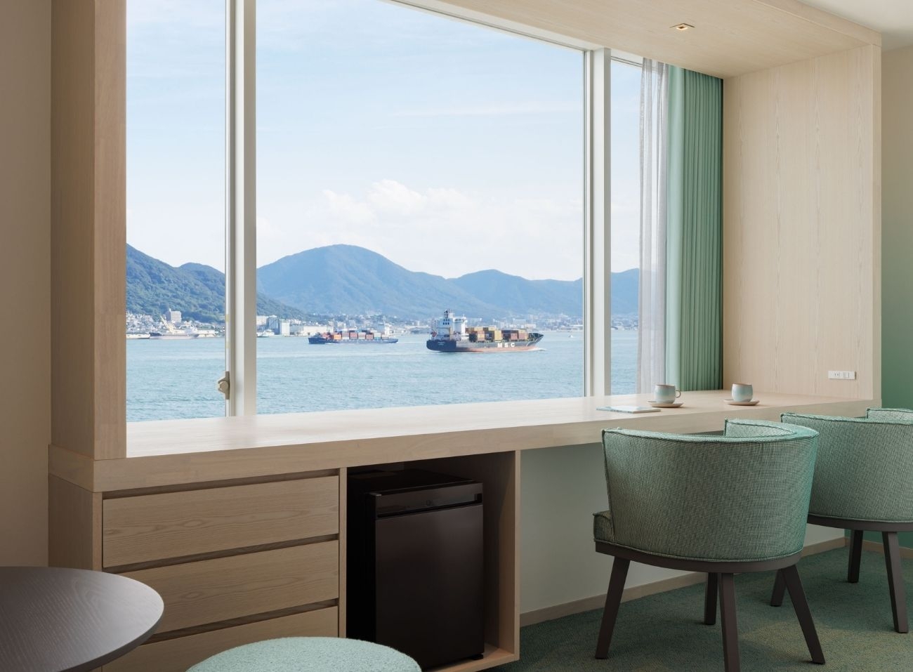 ホテルの角に位置する43平米のコーナールーム。2方向に広がる窓越しに、関門海峡のダイナミックな景色と下関の街並みをご覧いただけます。