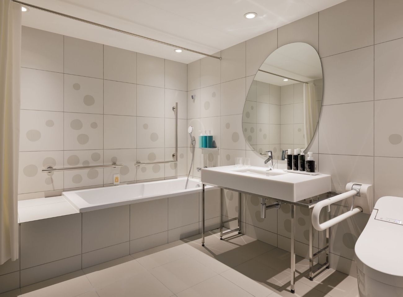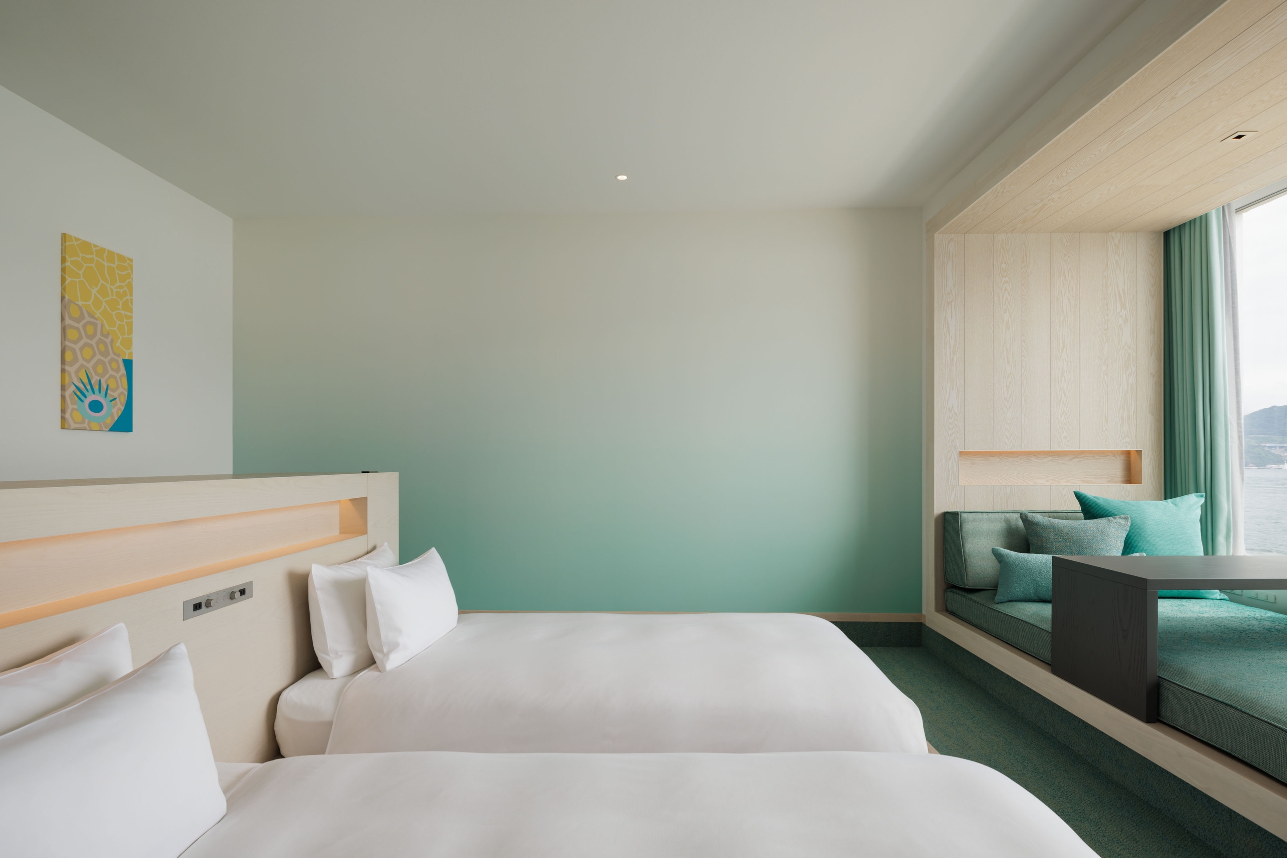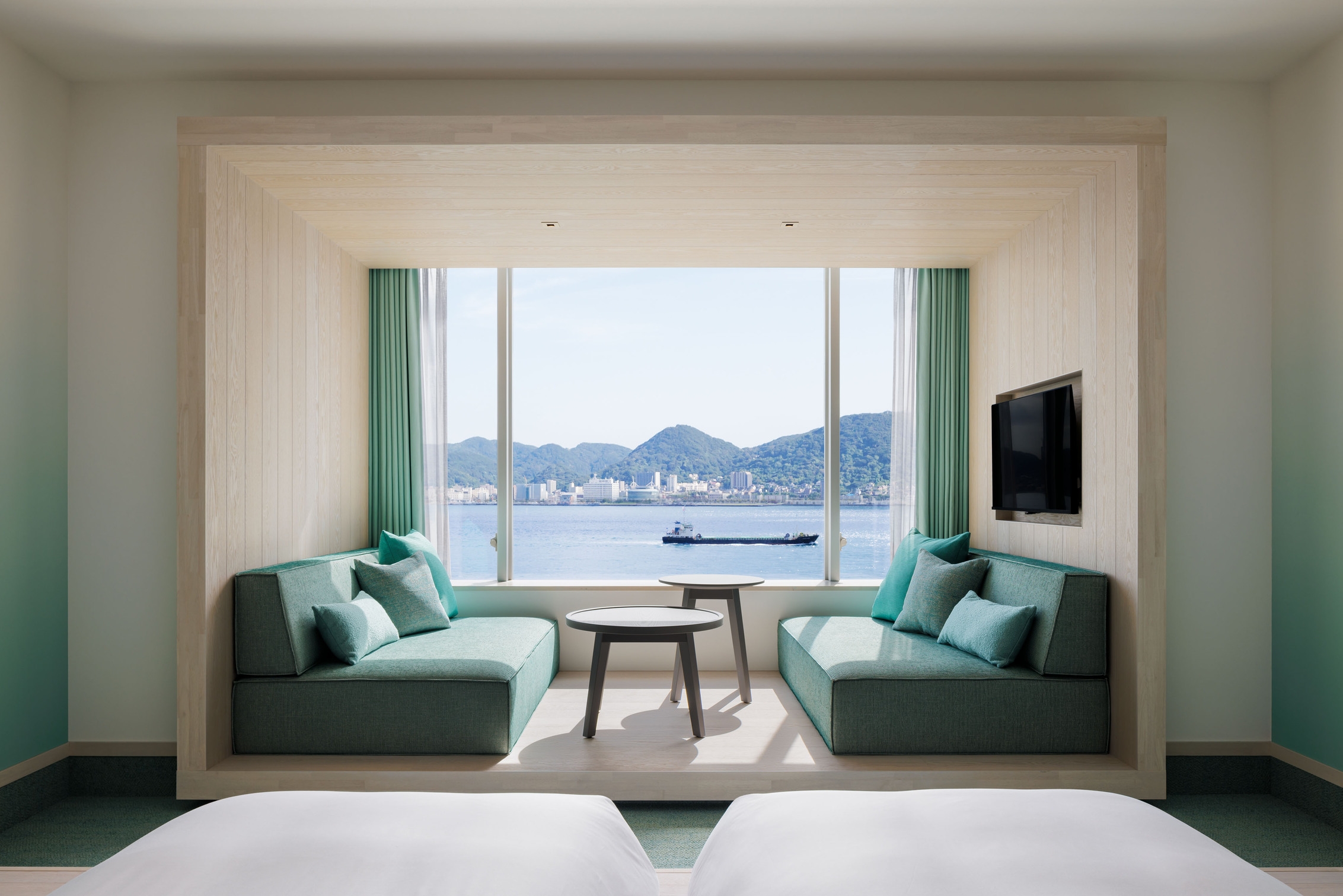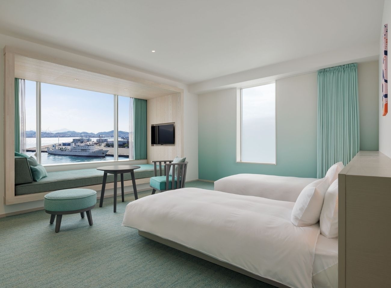ユニバーサル仕様の広さ43平米のコーナールームです。2方向に広がる窓越しに、関門海峡のダイナミックな景色と下関の街並みをご覧いただけます。