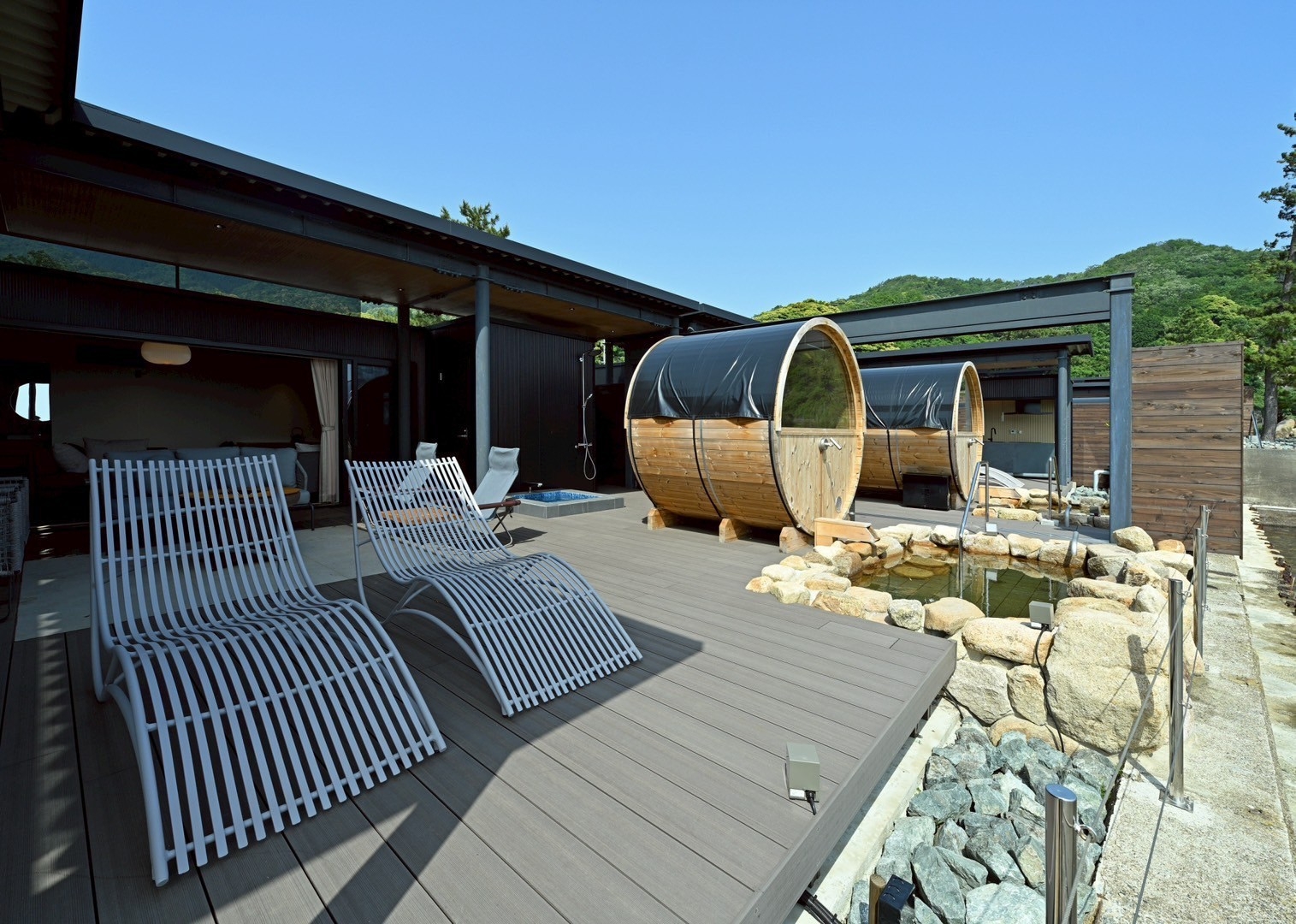 バレルサウナと露天岩風呂付き。キングサイズベッドの客室が2室各2名様ずつの合計4名様でのご宿泊が可能。