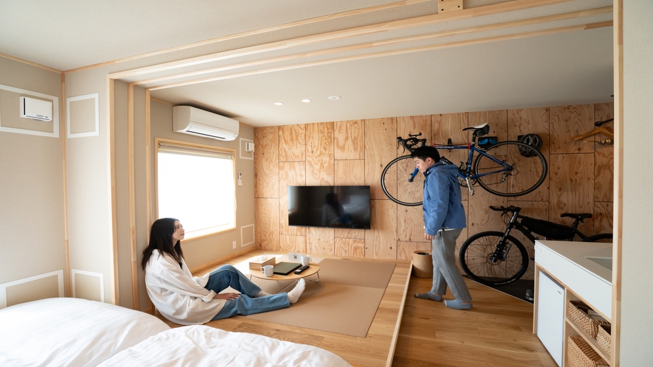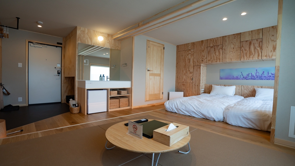 \2025年5月オープン/北海道の真ん中、雄大な自然に囲まれた富良野に、四季折々の景色とアクティビティが楽しめる、2階建て無人ホテルが誕生しました!JR富良野駅までは約1km。目の前にはコンビニがあり、急な買い物にも便利!ナチュラルモダンで木のぬくもりが感じられる落ち着いた雰囲気のお部屋です。最大4名様までご宿泊可能。自転車ラックやスキー・スノーボードラックを備えており、お気に入りのギア(相棒)と一緒にご宿泊いただけます!夏はサイクリング、冬はスノーアクティビティの拠点としてぜひご活用ください。(スキーやスノーボード以外にも、「熱気球体験」や「スノーモービル」などのアクティビティを楽しむことが可能です!)北海道旅行にもおススメの宿泊先です!【宿泊先】玄関、リビング:リビングテーブル、布団2組ベッドルームエリア:シングルベッド2台洗面台、冷蔵庫(冷凍庫なし)、脱衣所、お手洗い、お風呂(シャワーのみ)※布団は玄関横の収納にございます。畳のスペースに敷いてお休みください。新築で、水回りも家電も新品!エアコンや空気清浄機も完備しており、快適にお過ごしいただけます。畳の小上がりスペースがございますので、小さいお子様連れのご旅行に便利です。お部屋の窓から見える、桜、紅葉、雪景色など、四季折々の風景と美しいマウンテンビューをぜひお楽しみください!■室内設備〇自転車ラック×2台、スキー/スノーボードラック×2台(ヘルメットも掛けられ、自転車用の簡易工具キットやポンプも完備。)〇ベッドの枕元に充電ポートあり。(USBポートも設置しております)〇リビングには、 50インチの壁掛けTVを設置。Netflixやprime videoなども高画質でお楽しみいただけます。※お部屋にキッチン設備、調理器具はございません。冷蔵庫とケトル、グラス・マグのみご用意しております。※共用部に電子レンジ、洗濯機・乾燥機(業務用コイン式、キャッシュレス可)、掃除機を設置しております。【無料でお使いいただけるもの】タオル、歯ブラシ、シャンプー、コンディショナー、ボディーソープ、消臭剤、ハンドソープ、室内用スリッパ、Wifiなど