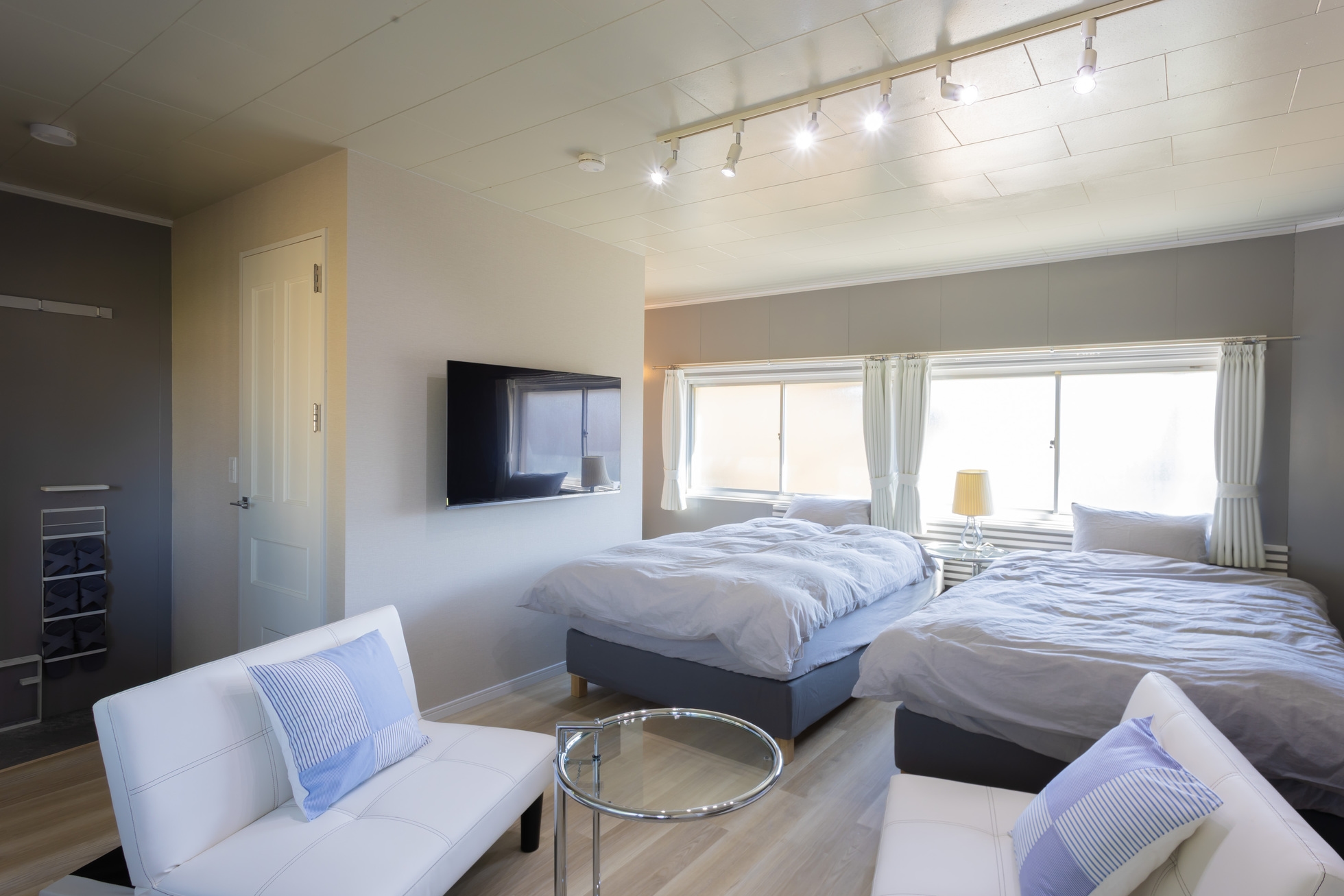 寝具2名様分はセミダブルベッド、3名様利用の場合の、もう1つの寝具は、ソファベッド(シングルサイズ/長さ1.8m)