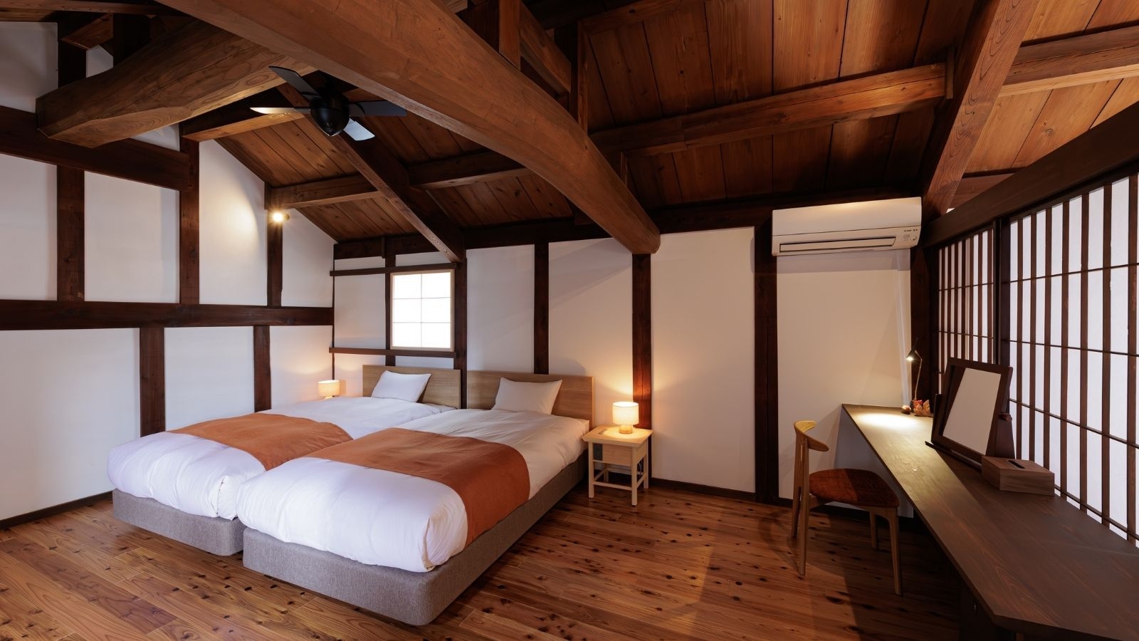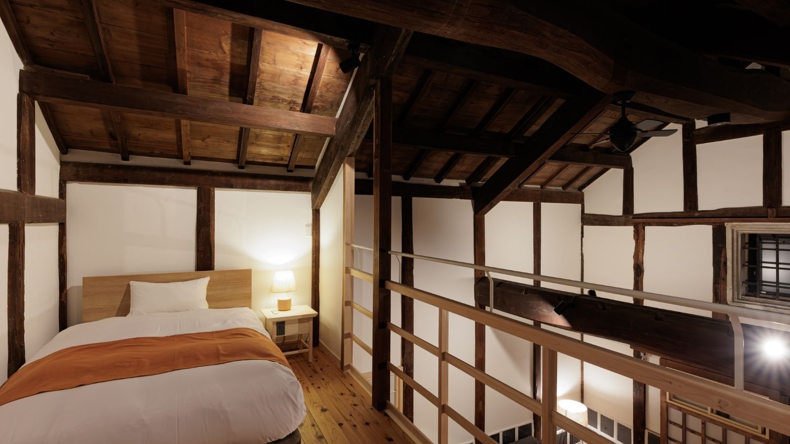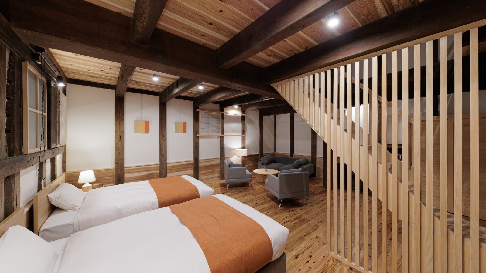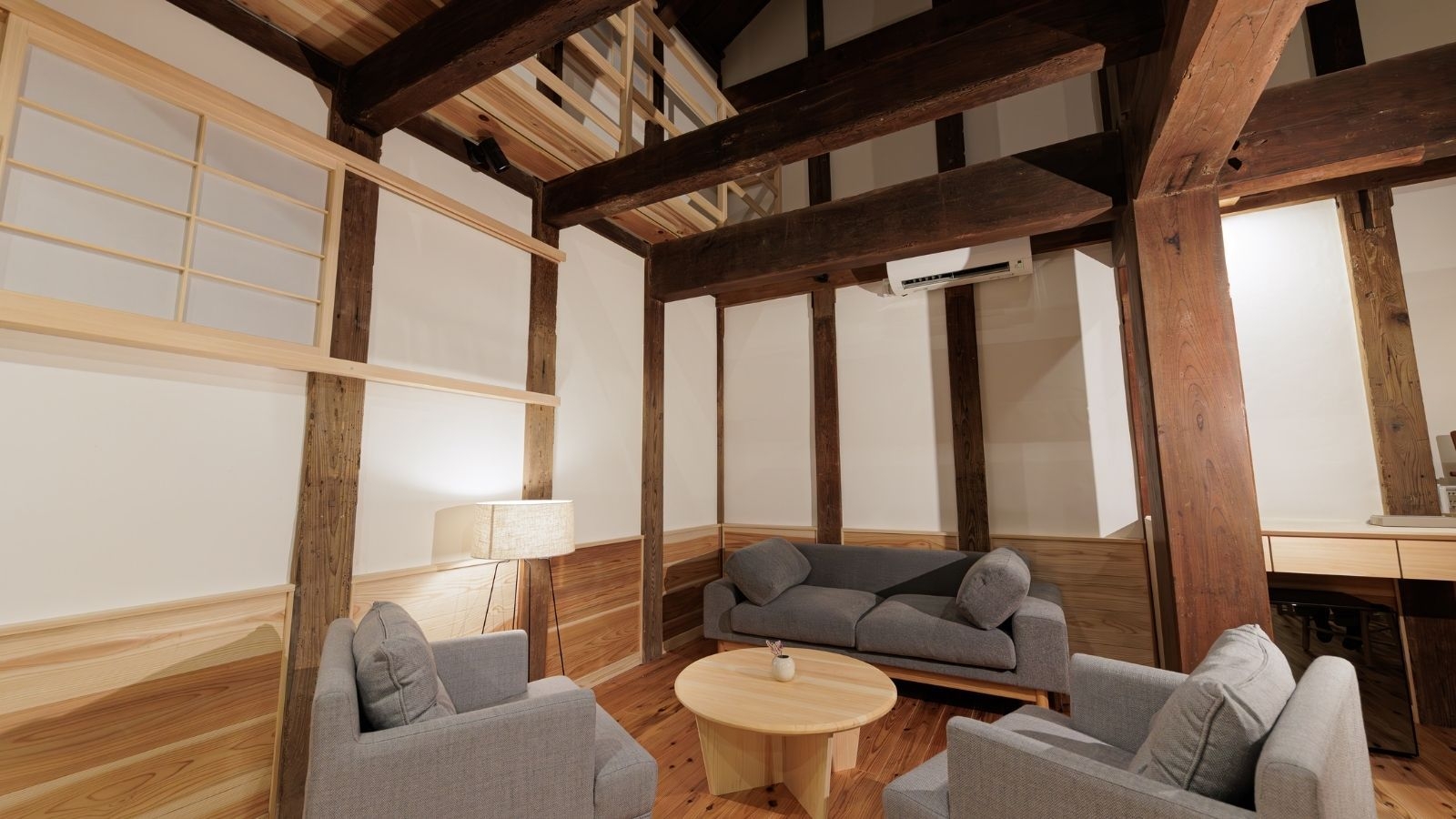 明治初期に建てられた蔵をまるごと活用したお部屋。2階はロフトタイプで、吹き抜けの天井や梁から蔵ならではの重厚感をお楽しみいただけます。
