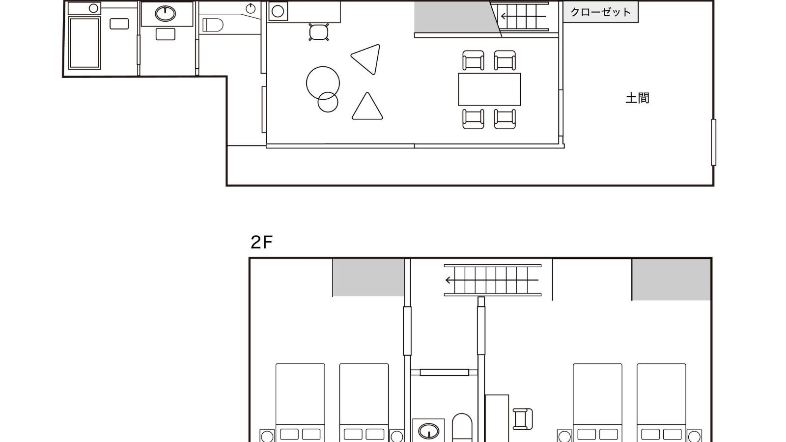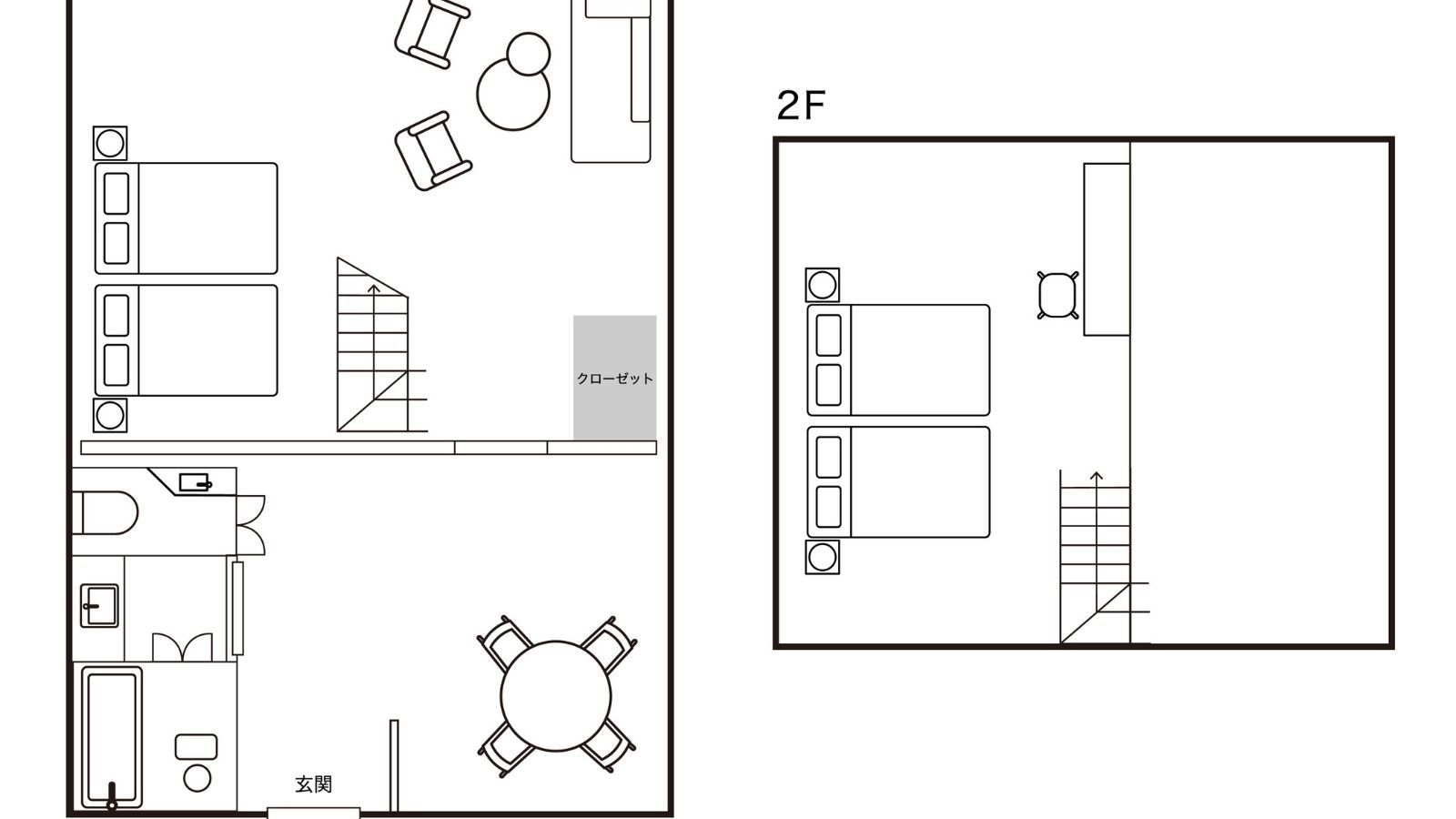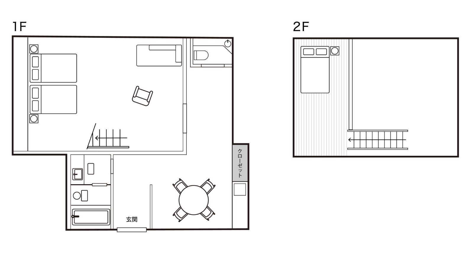 1階には広々としたリビングルームが広がり、奥には檜風呂をご用意。ベッドルームは2階に2室あり、家族利用・グループ利用におすすめのお部屋です。