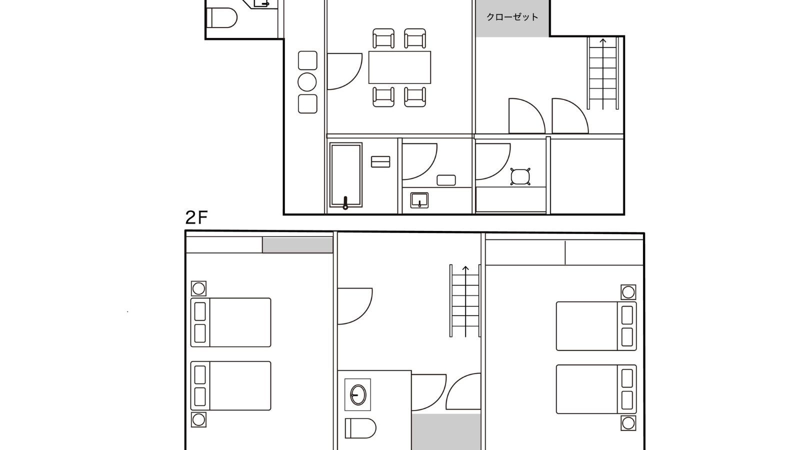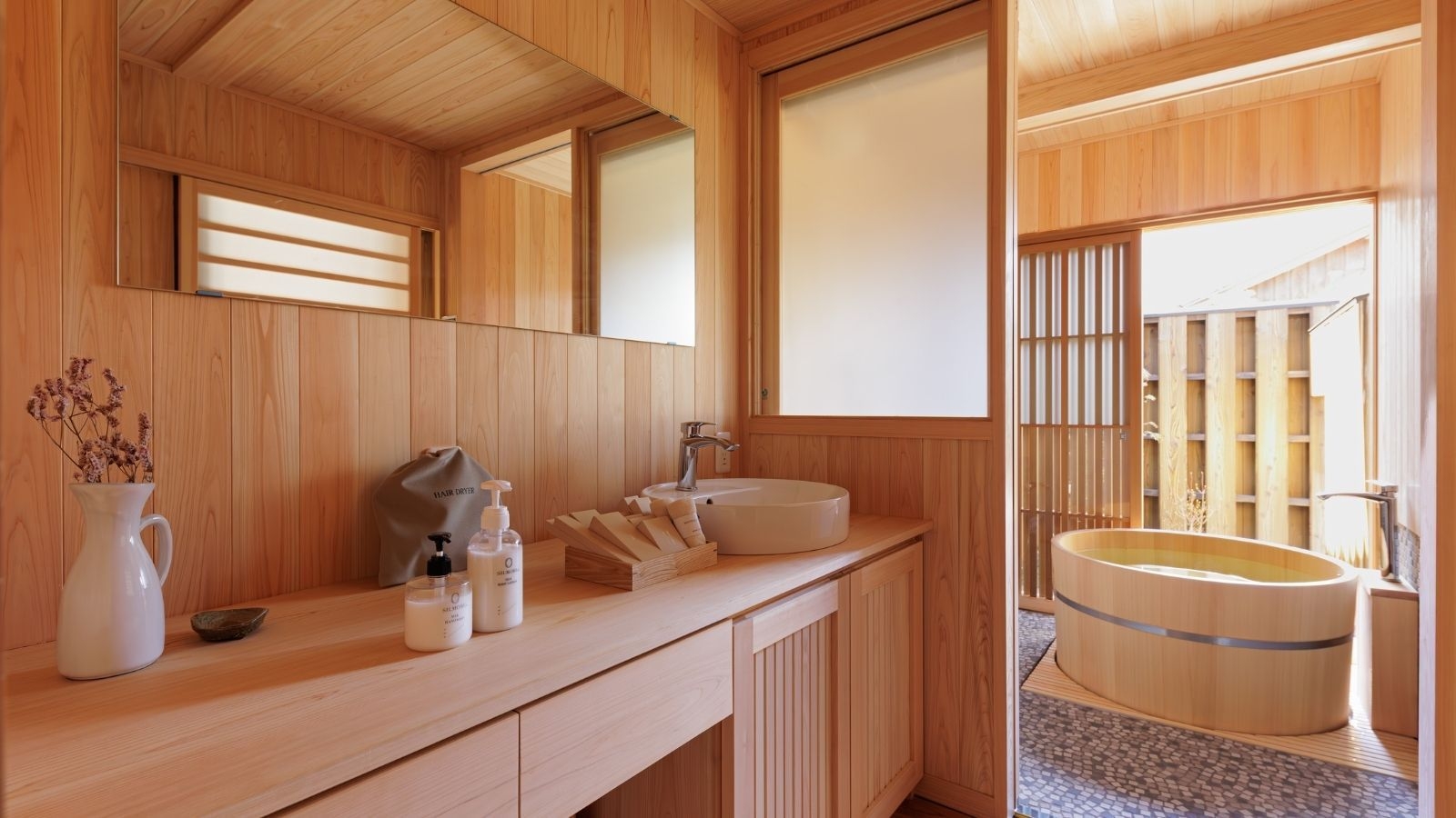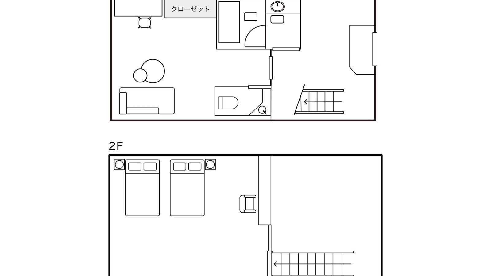 1階には広々としたリビングルームが広がり、奥には檜風呂をご用意。ベッドルームは2階に2室あり、家族利用・グループ利用におすすめのお部屋です。