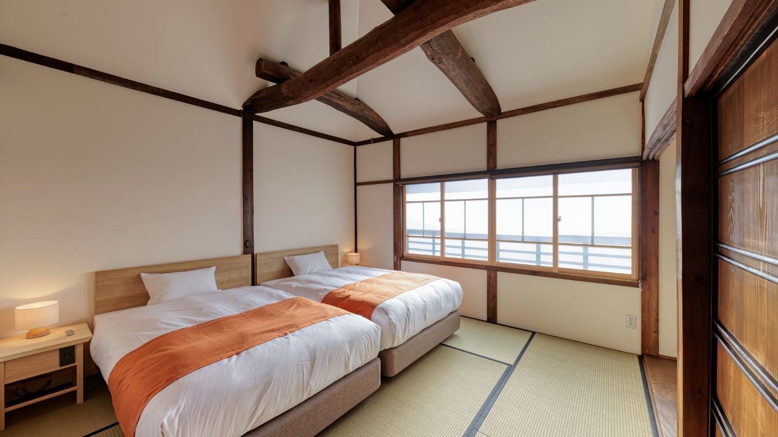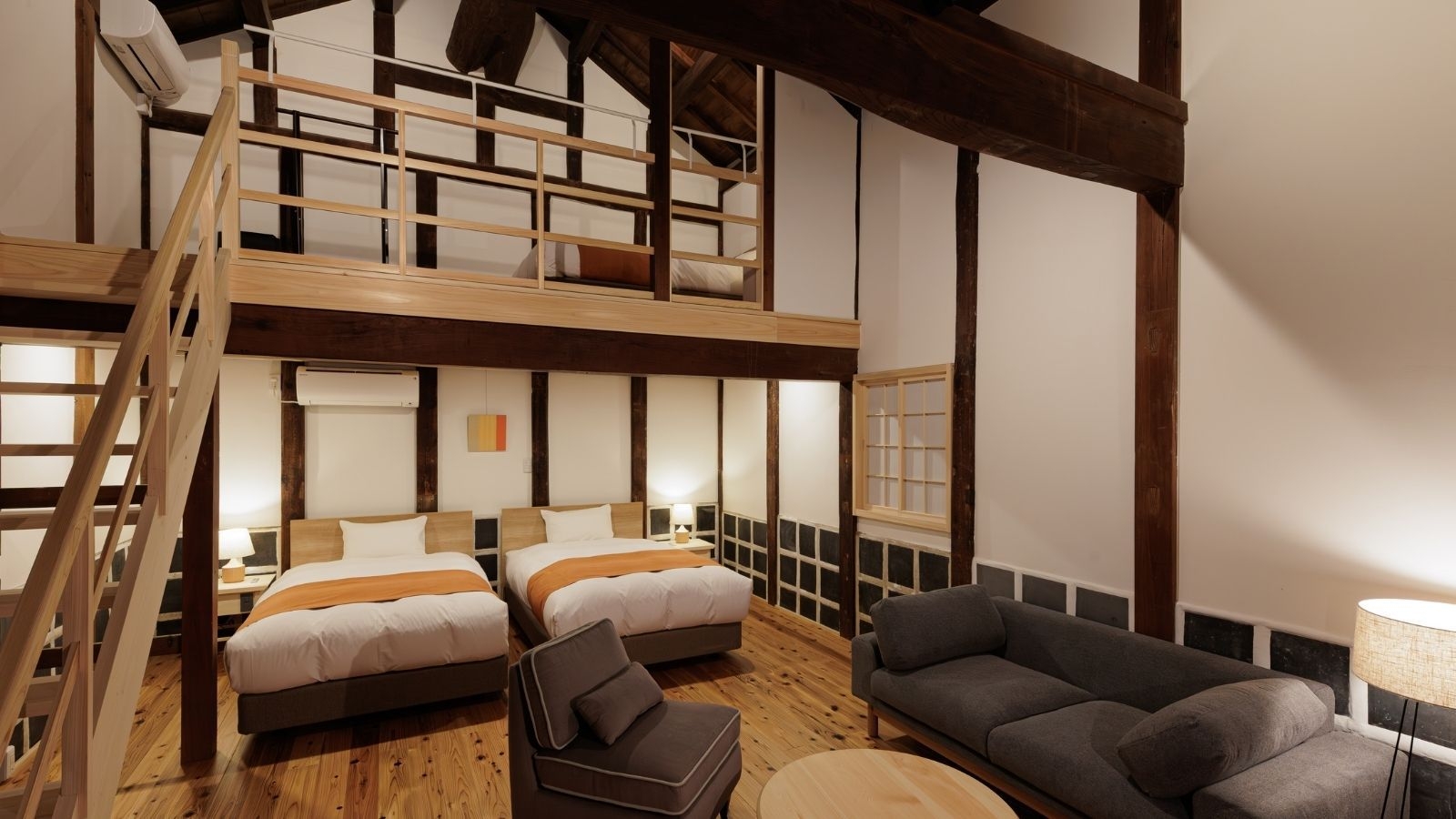 蔵をまるごと活用し、蔵の外に増設したスペースも含めて貸切でご利用いただけます。 蔵の中はロフトタイプで、ベッドは1階に2台と、2階にもう1台ご用意。