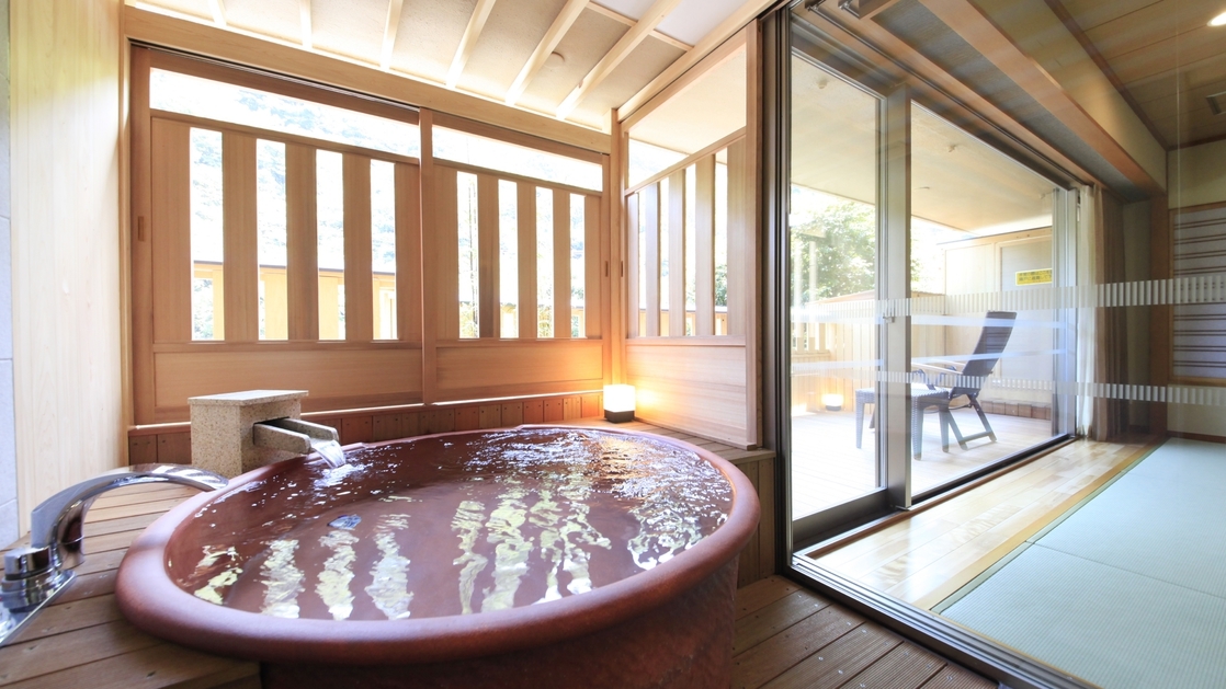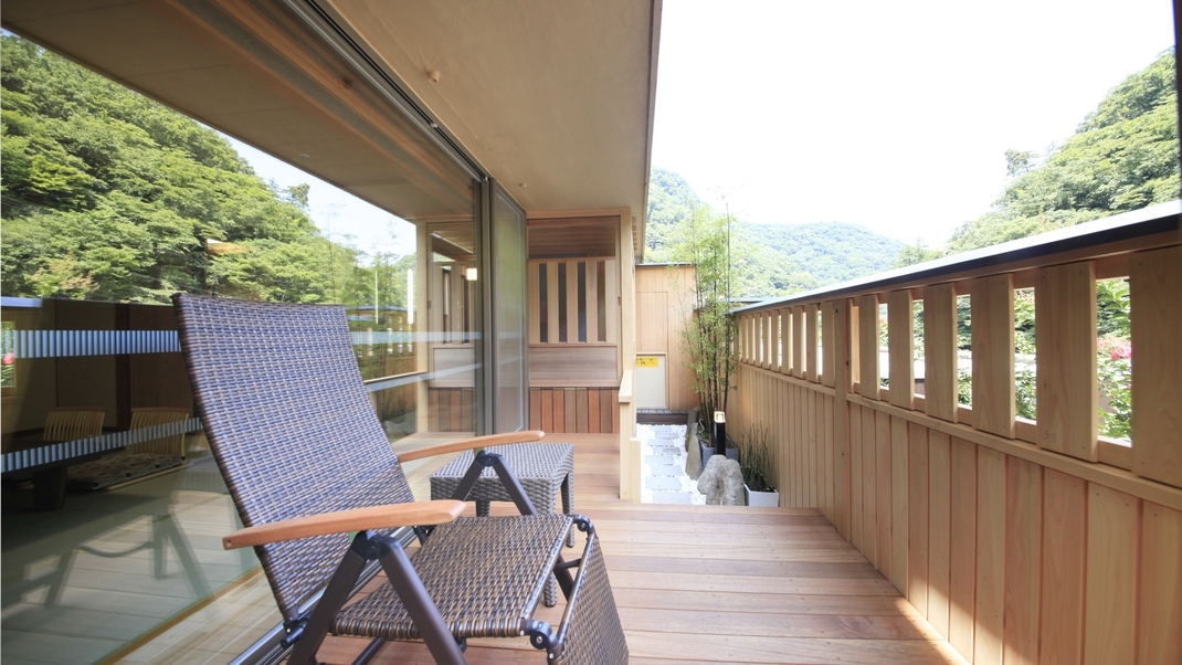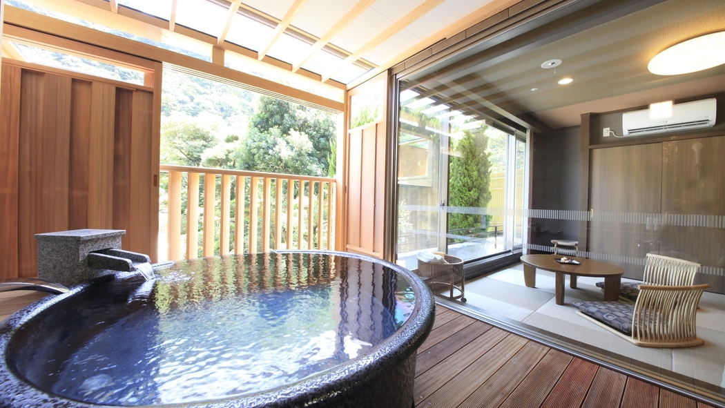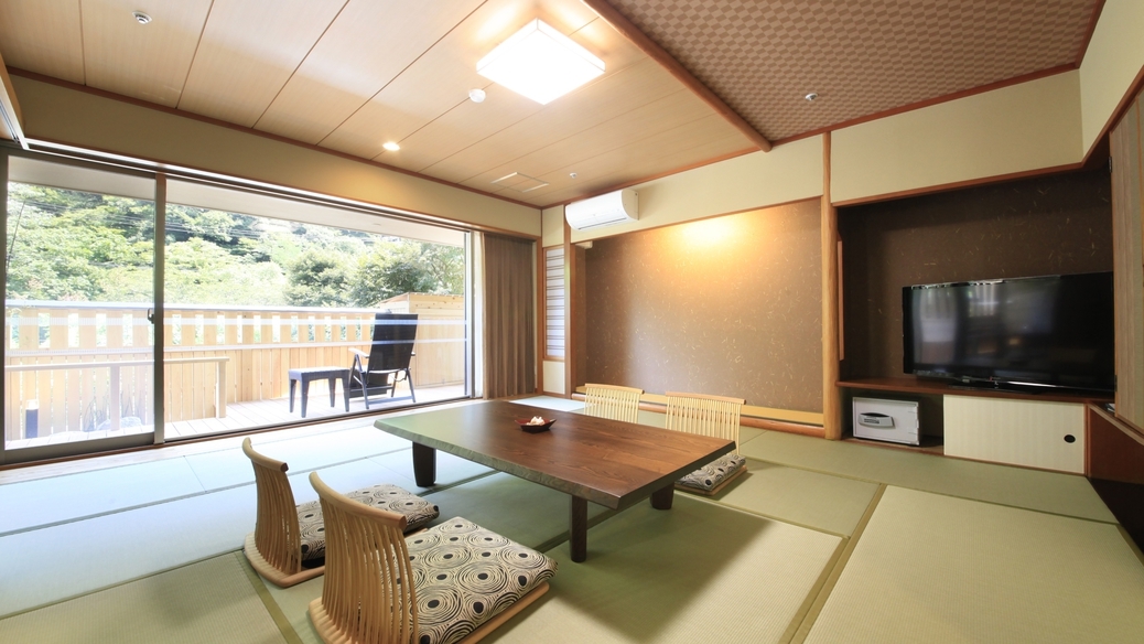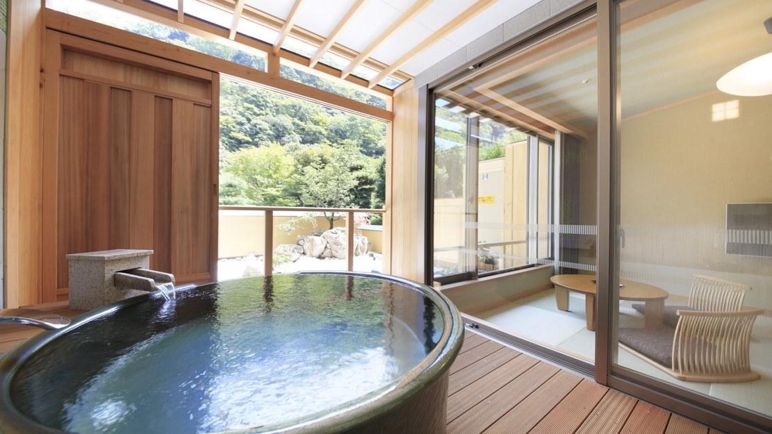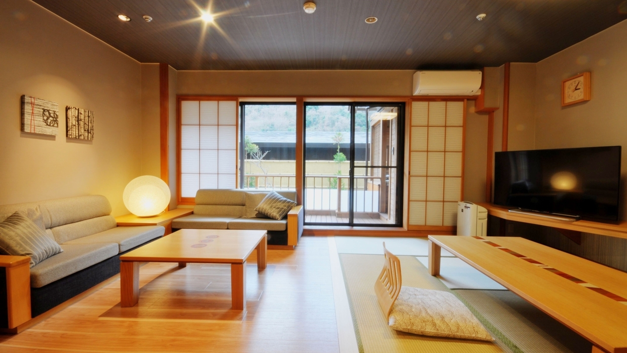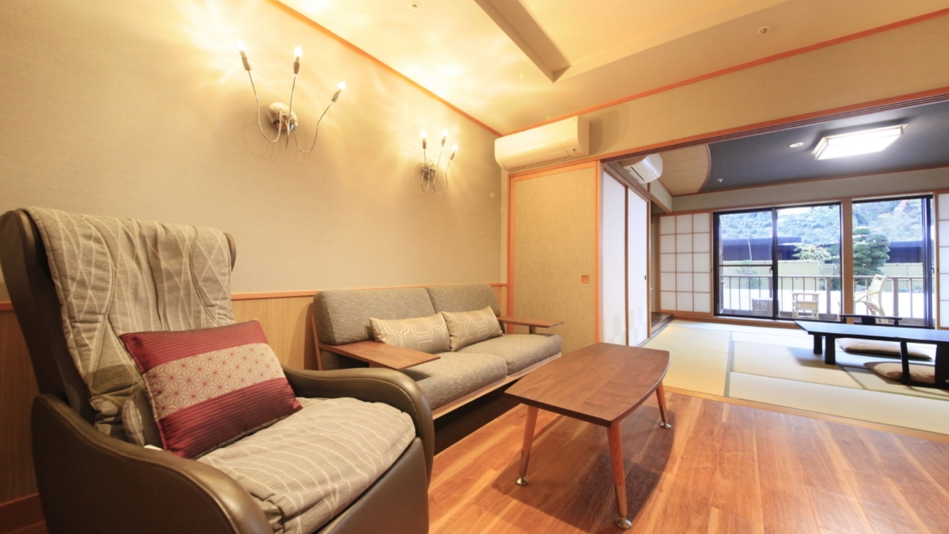 露天風呂付き客室。12畳の和室にマッサージチェア付のリビングがついています。 ※禁煙室
