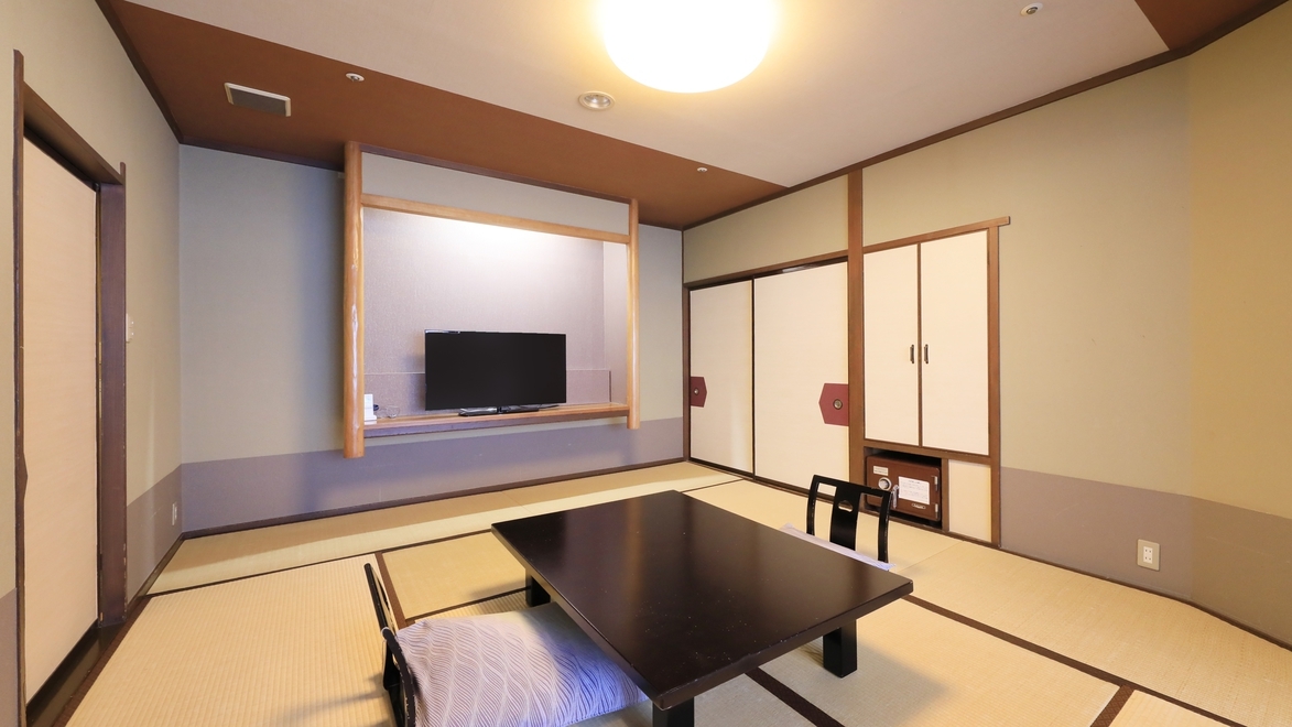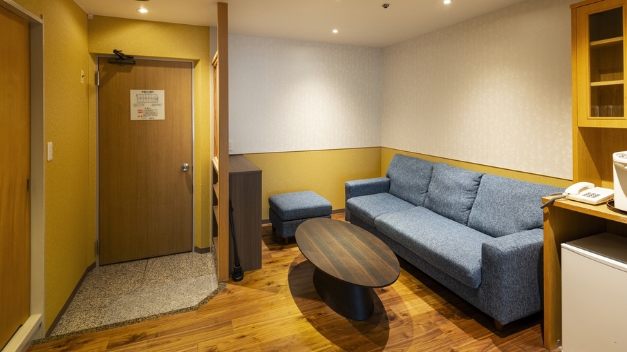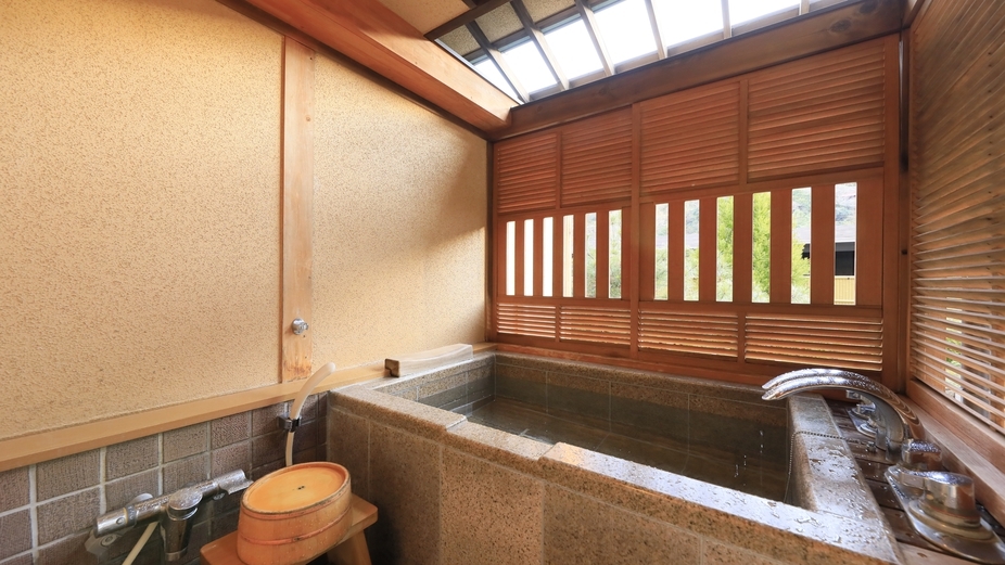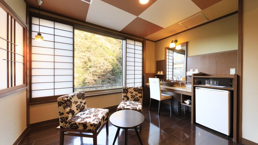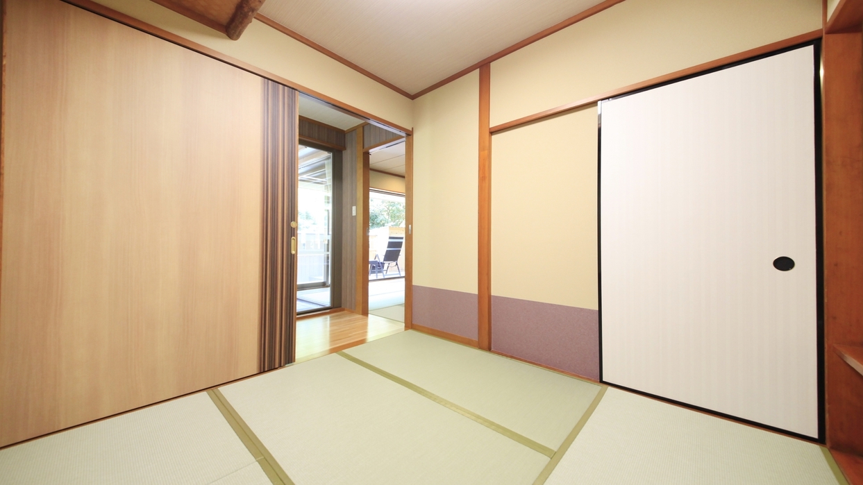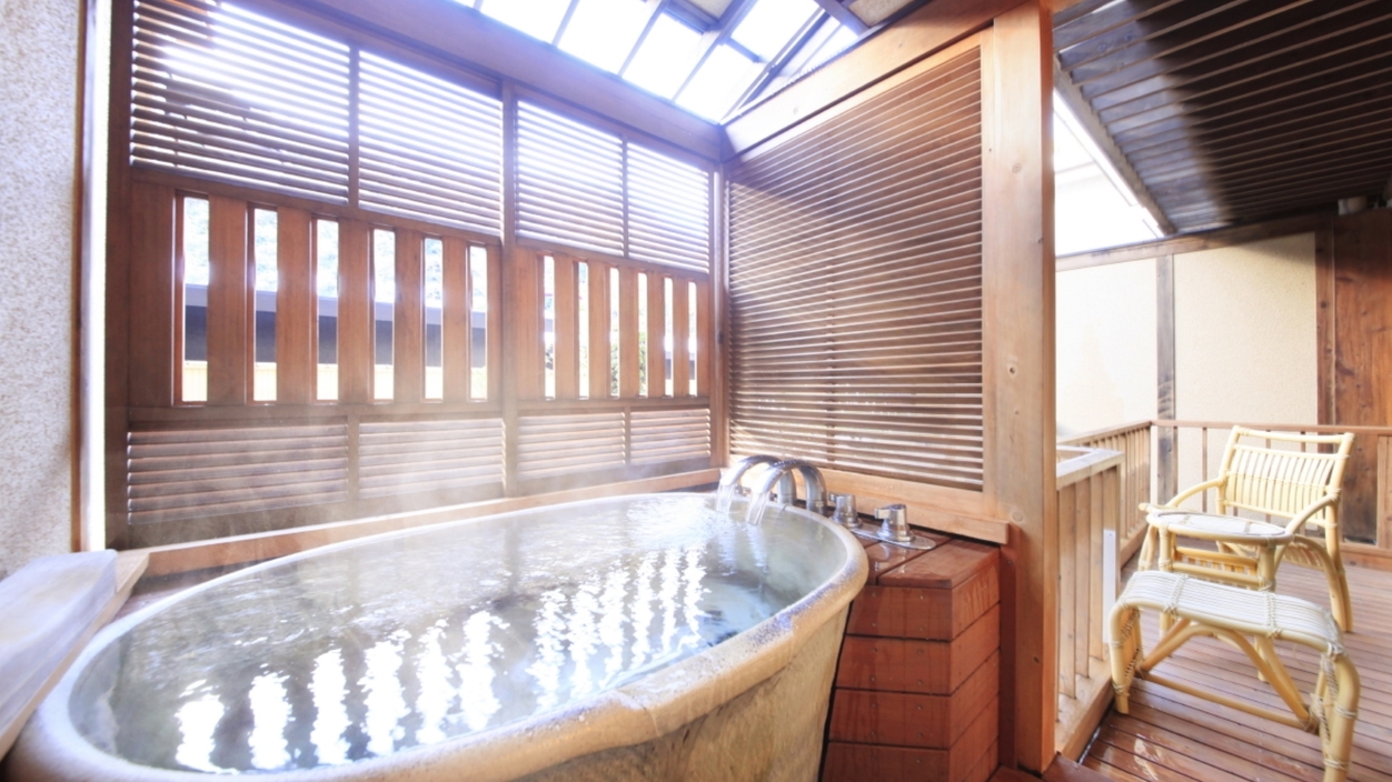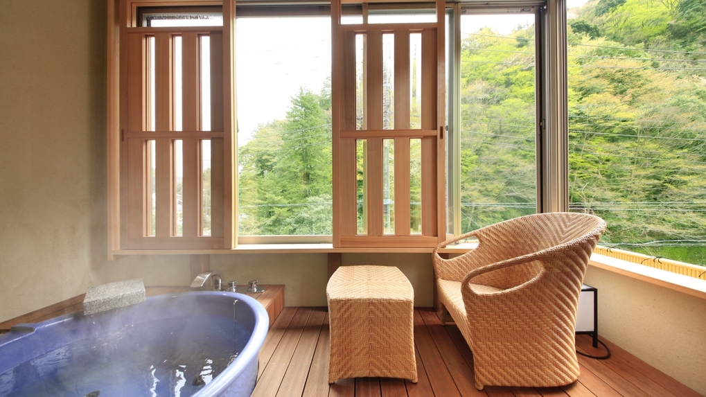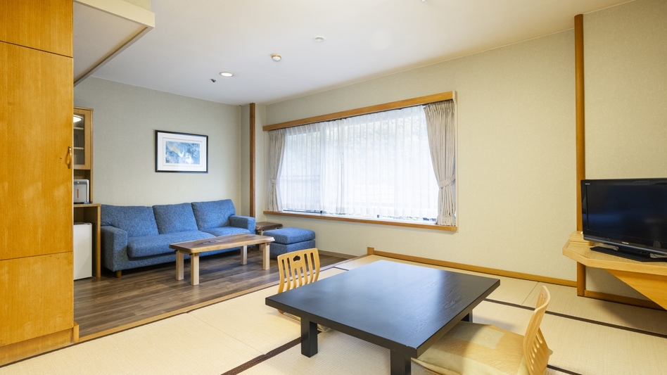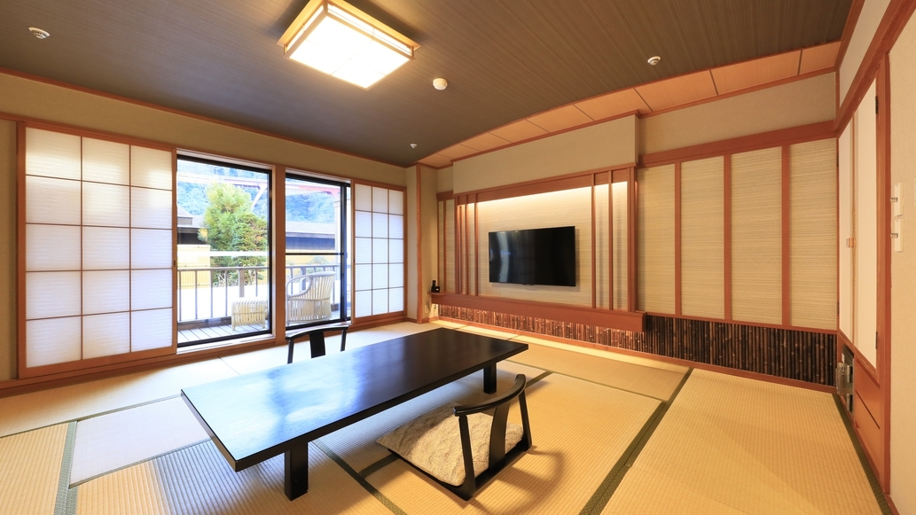 露天風呂付き客室。12畳の和室にマッサージチェア付のリビングがついています。 ※禁煙室