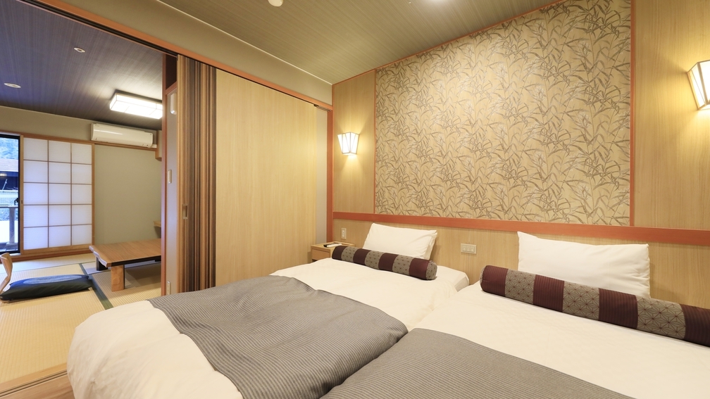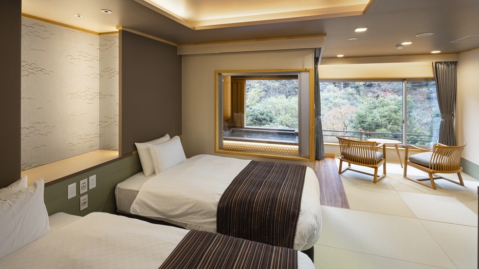 24年10月リニューアル当館最上階、 広々とした和室にツインベッドを配置した温泉露天風呂付き客室です。 【禁煙】