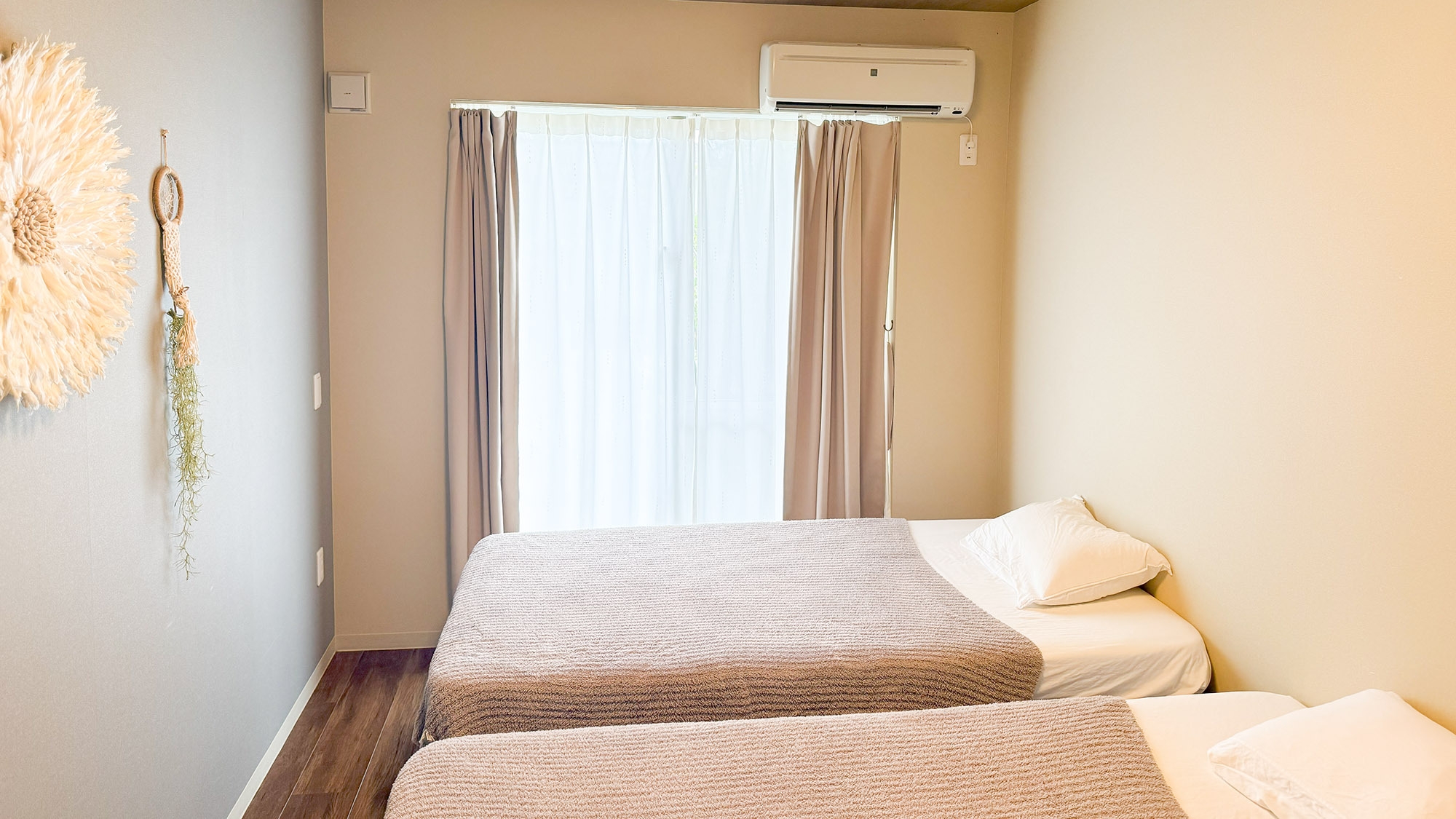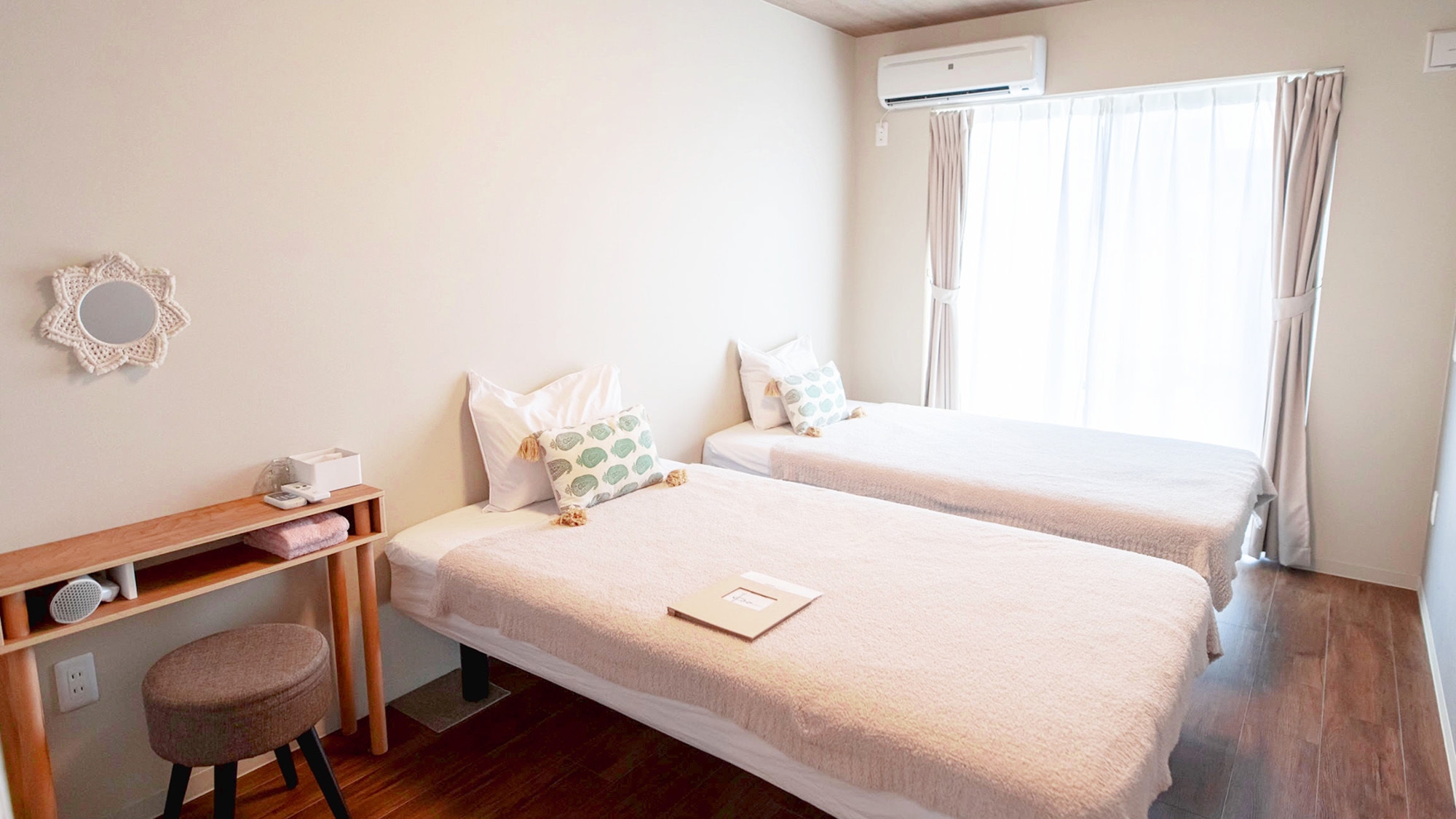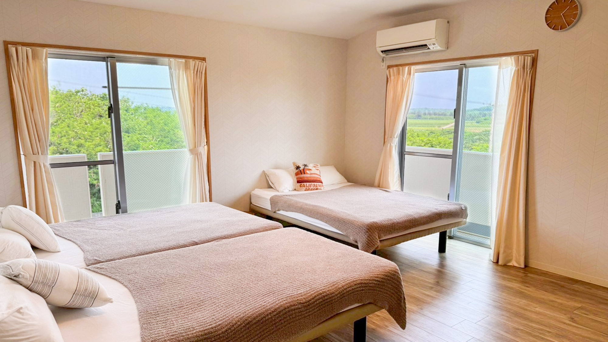 寝室2部屋。シングルベッド4台、ダブルベッド2台を設置。リビング、キッチン、テレビ、バスルーム、洗面台、洗濯機、乾燥機、温水洗浄便座付トイレ、無料Wi-Fi
