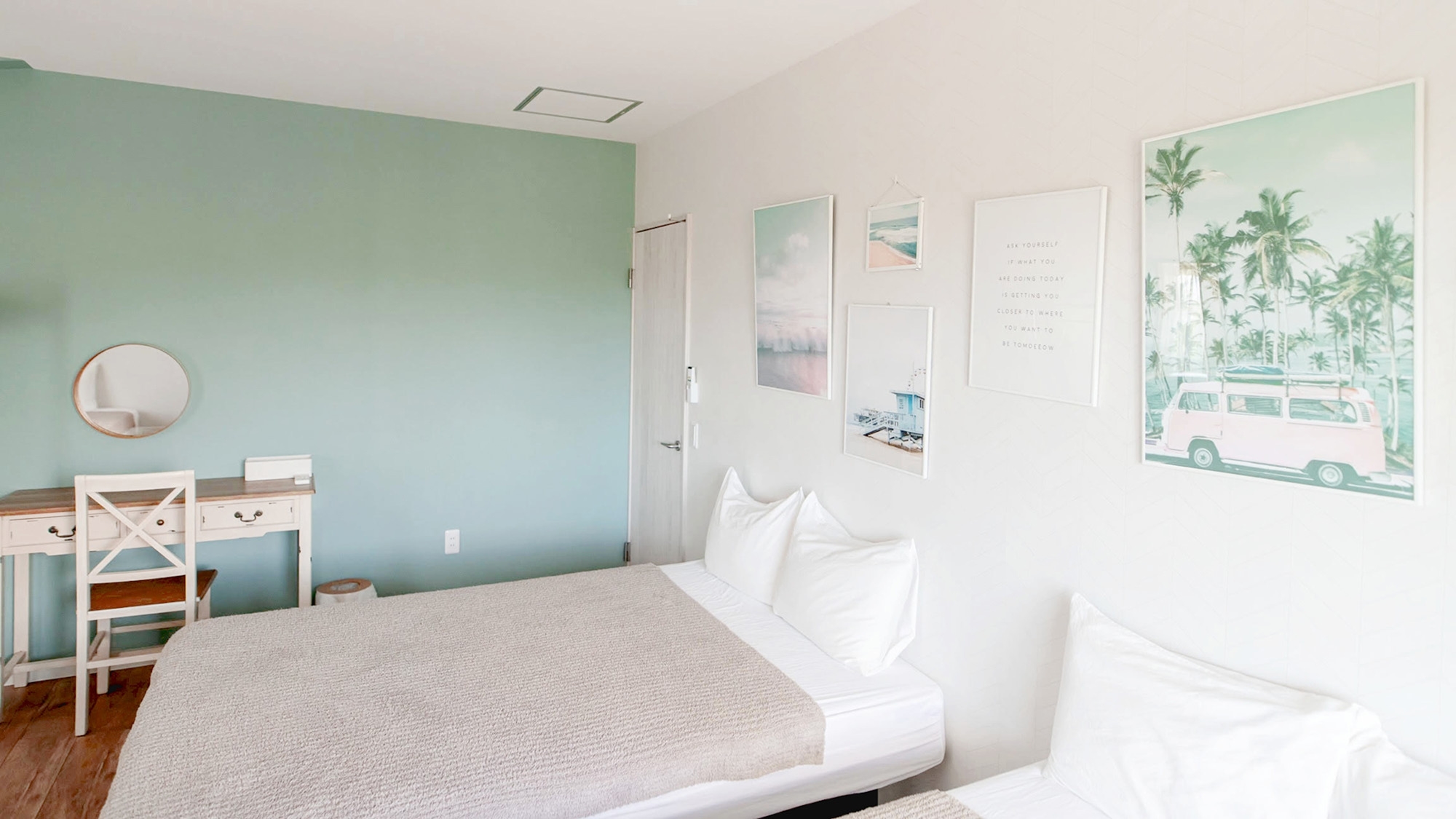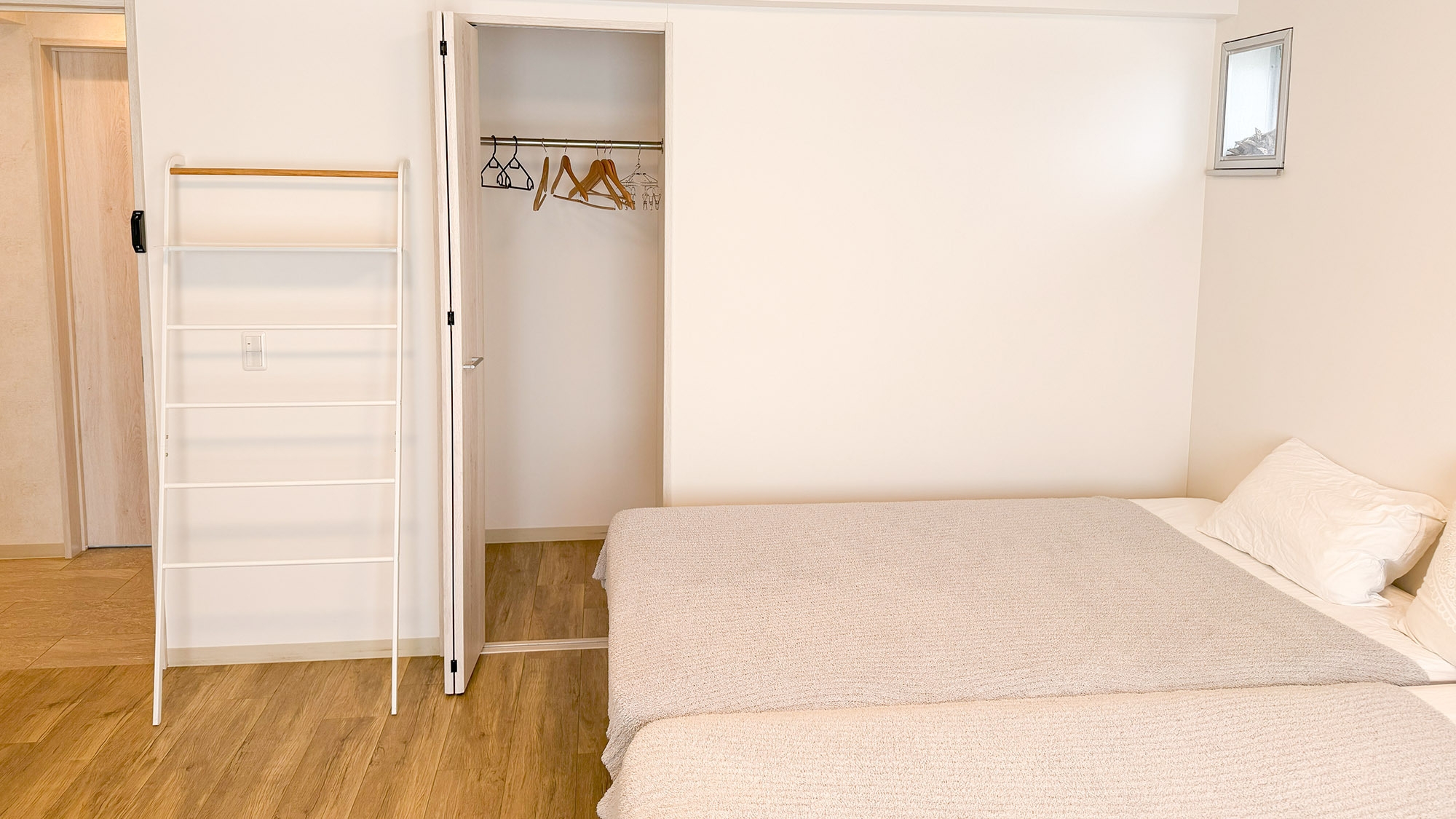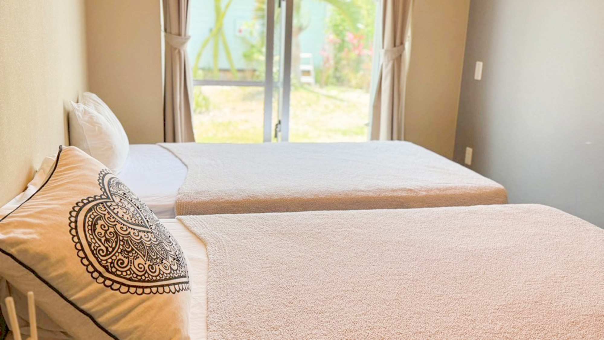 寝室2部屋。シングルベッド4台、ダブルベッド2台を設置。リビング、キッチン、テレビ、バスルーム、洗面台、洗濯機、乾燥機、温水洗浄便座付トイレ、無料Wi-Fi