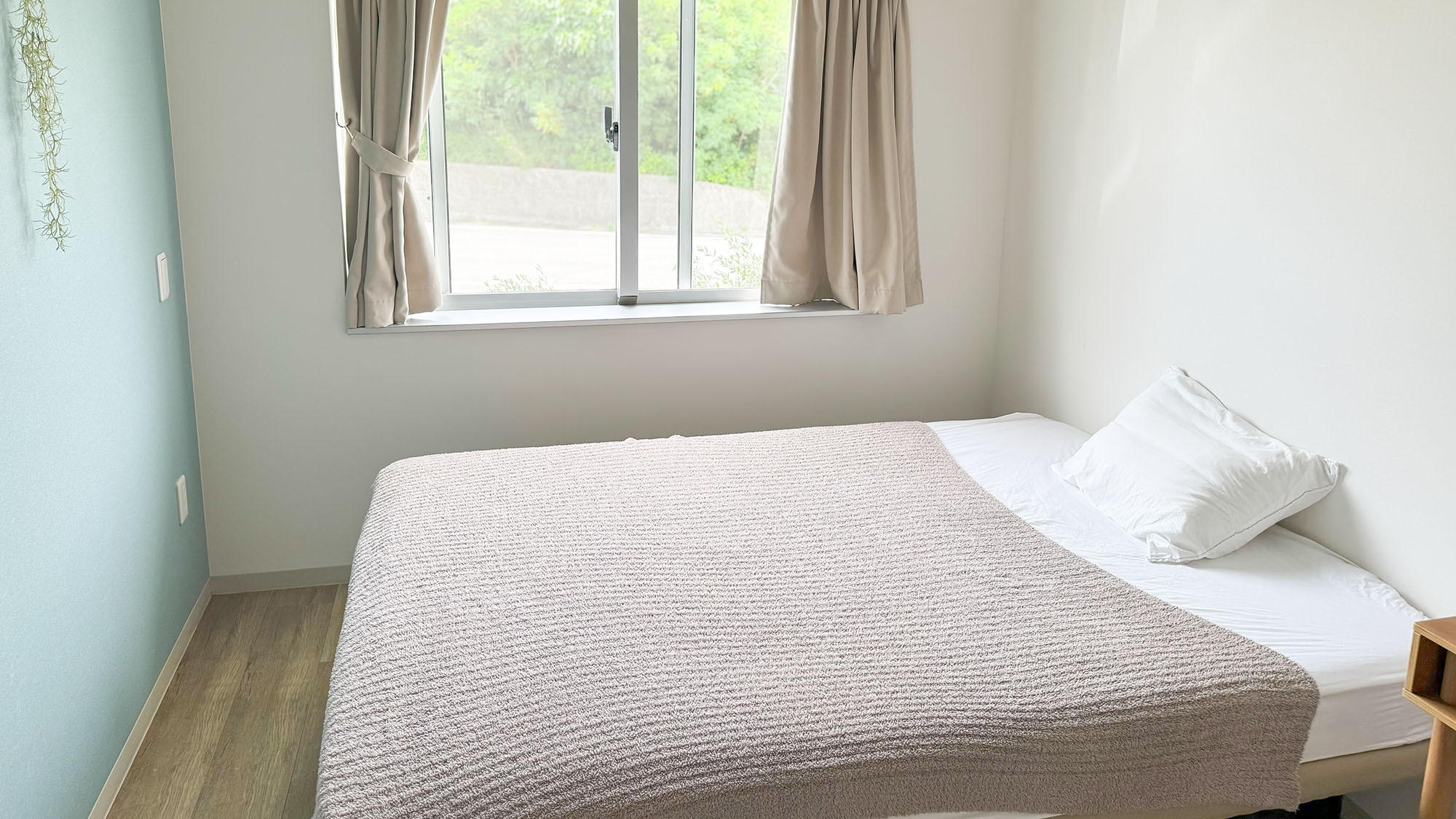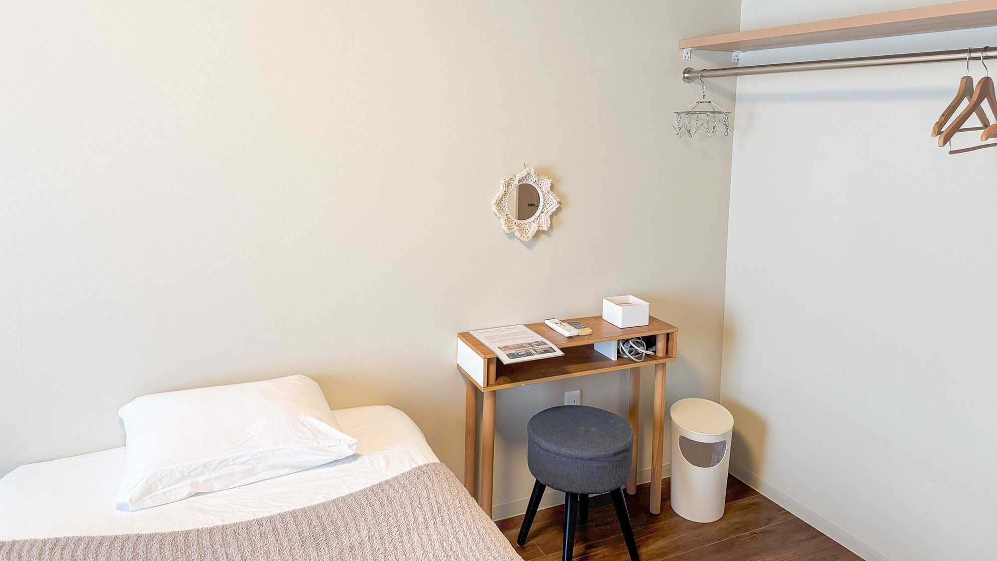 ダブルベッド1台。室内設備:椅子、机、ラック、個別空調、無料Wi-Fi。共用設備:リビング(ソファ、テーブル、テレビ)、キッチン、シャワールーム、トイレ