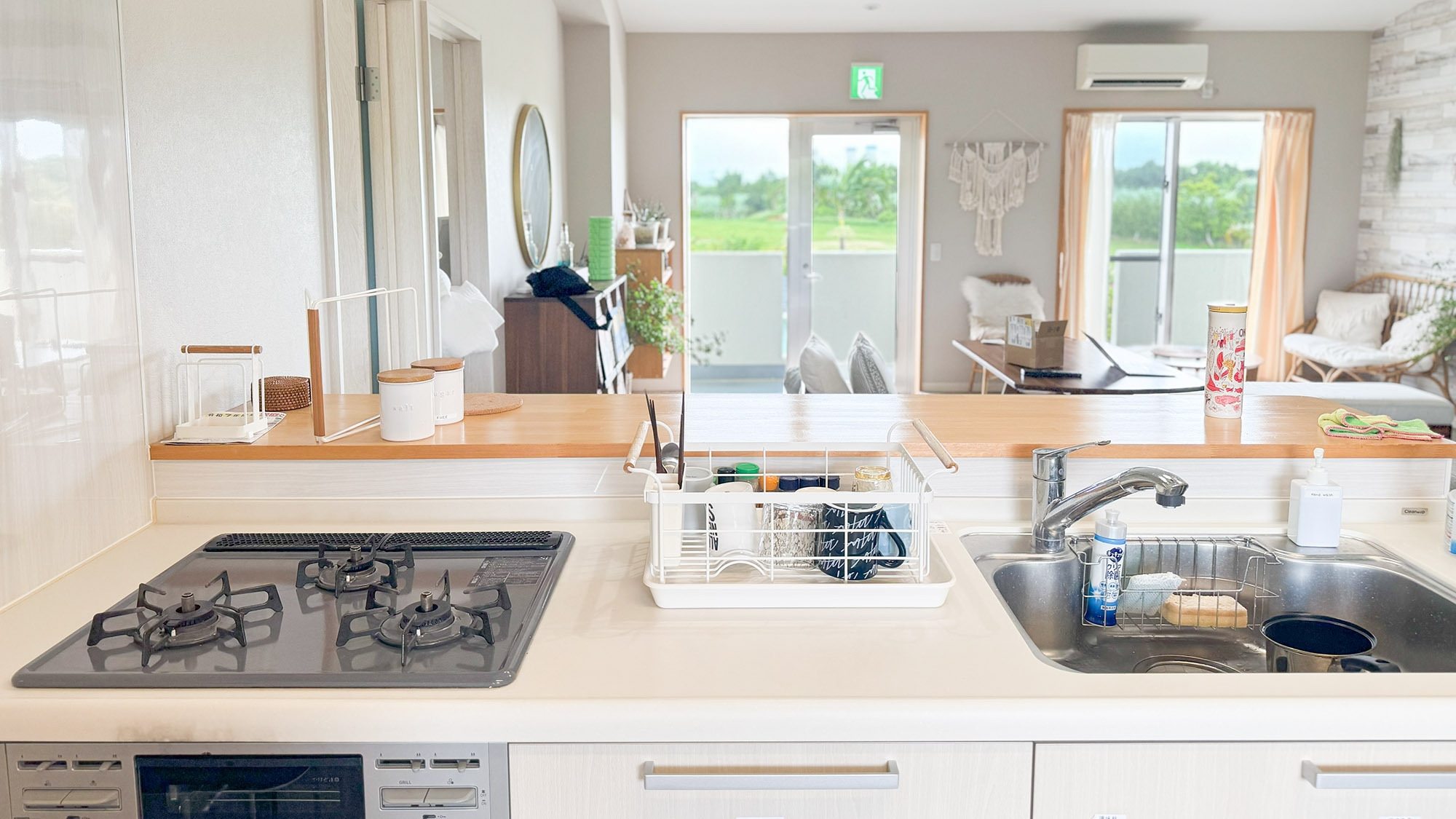 ・キッチン:ガスコンロ、調理器具、調味料、冷蔵庫、電子レンジ、カトラリー類、お皿、ウォーターサーバー