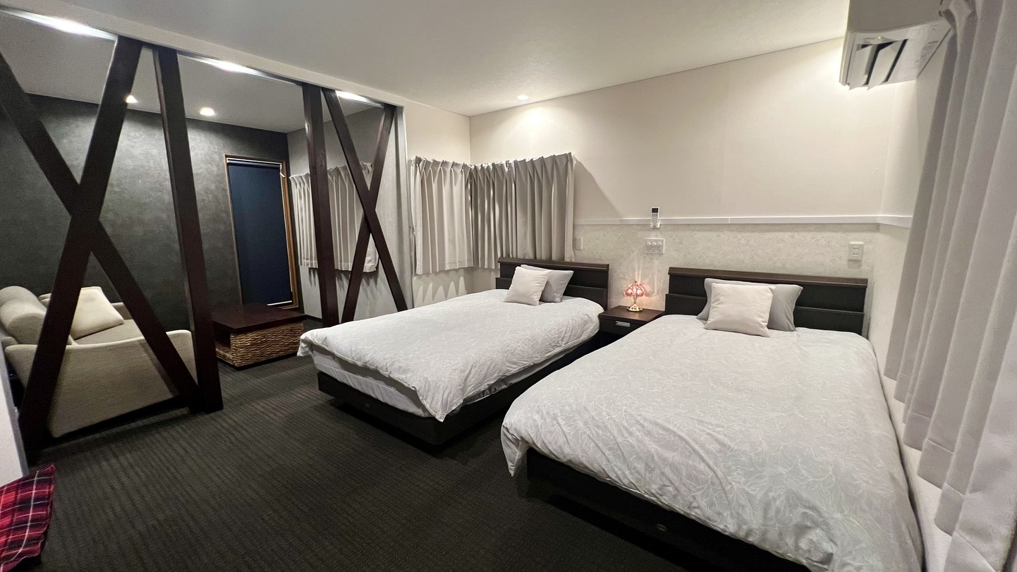 《素泊まり》1階リビングルーム、和室16畳(布団4セット)、バスルーム、トイレ/2階:寝室A(セミダブルベット2台)、寝室B(シングルベッド2台)、トイレ