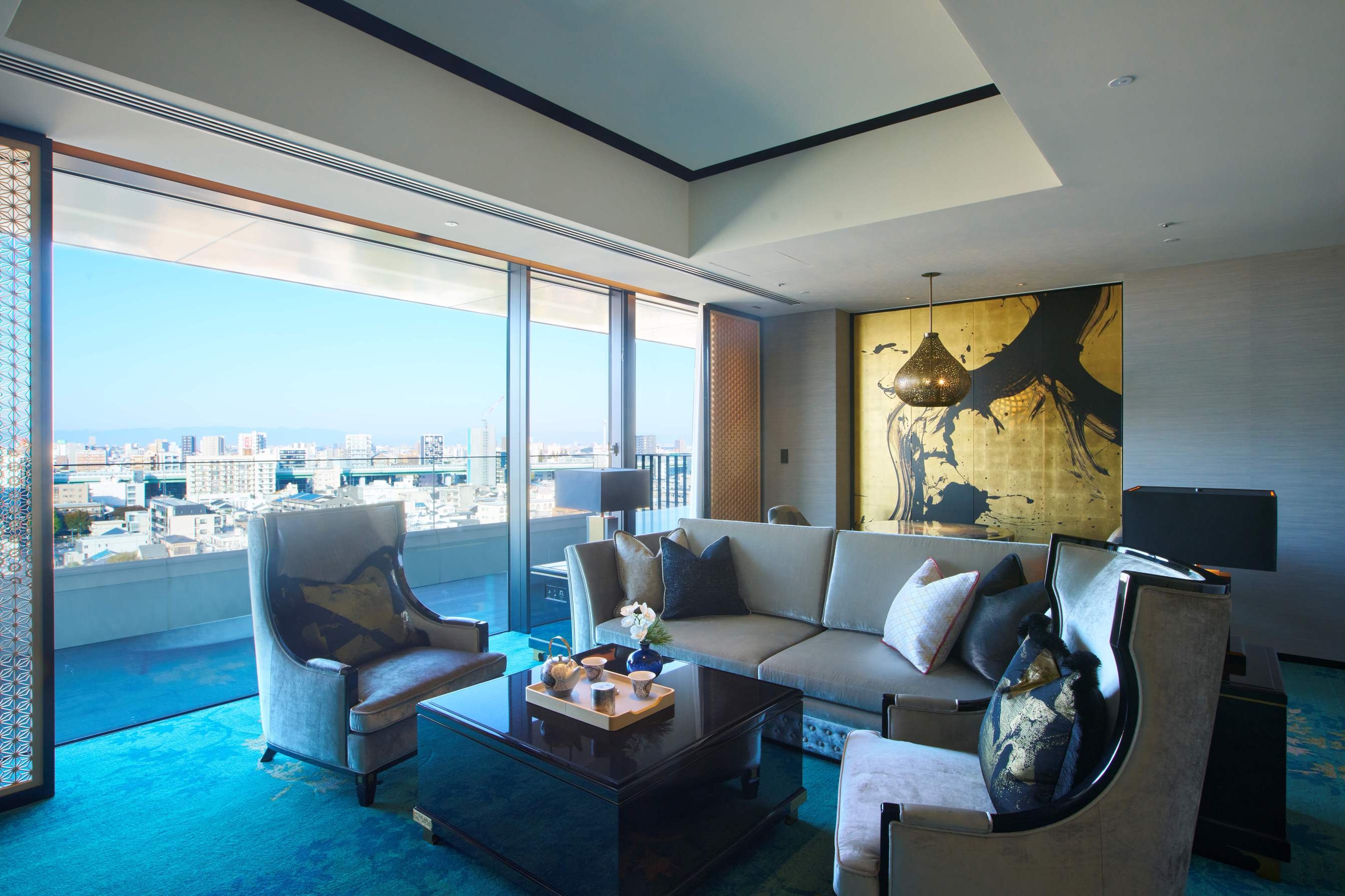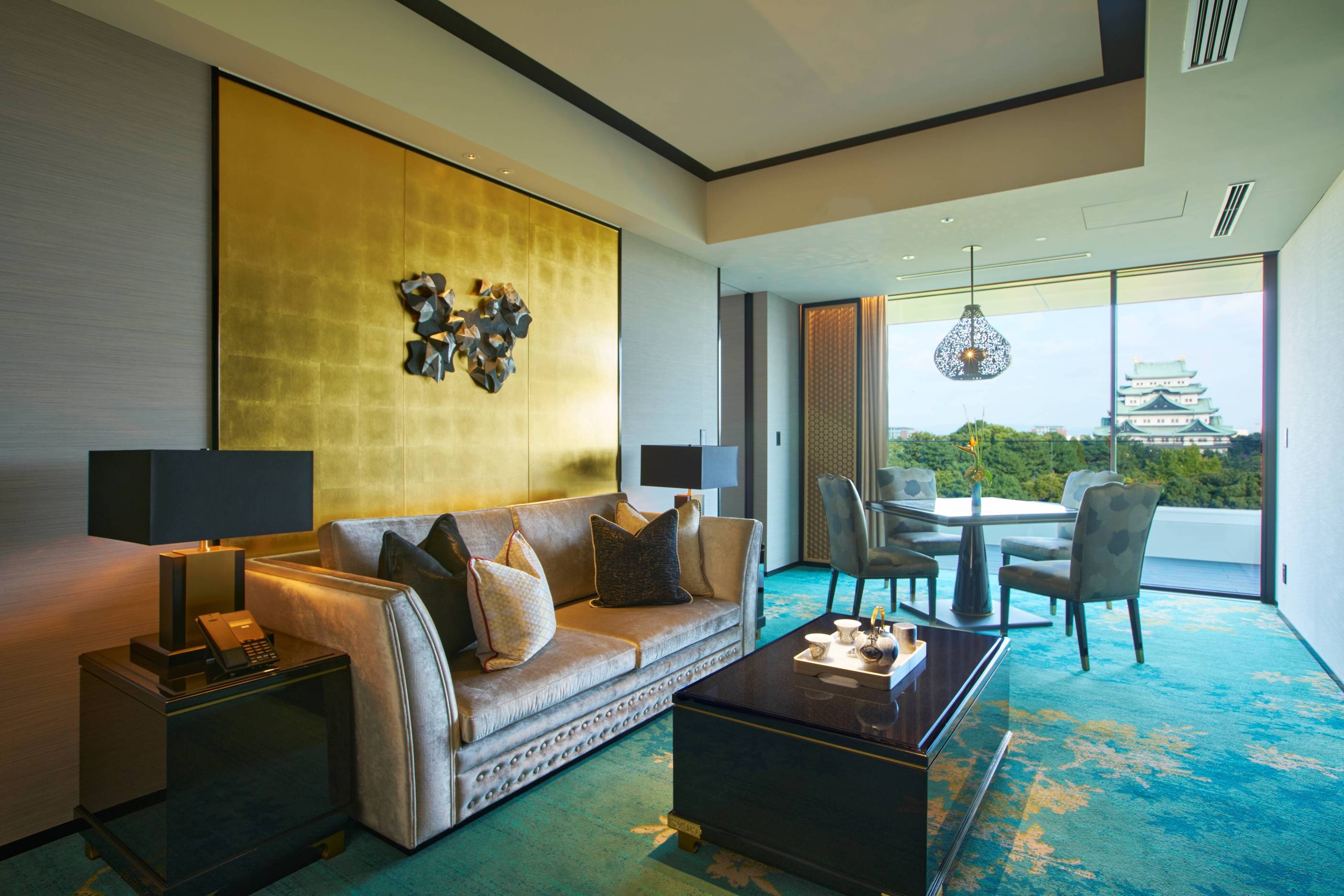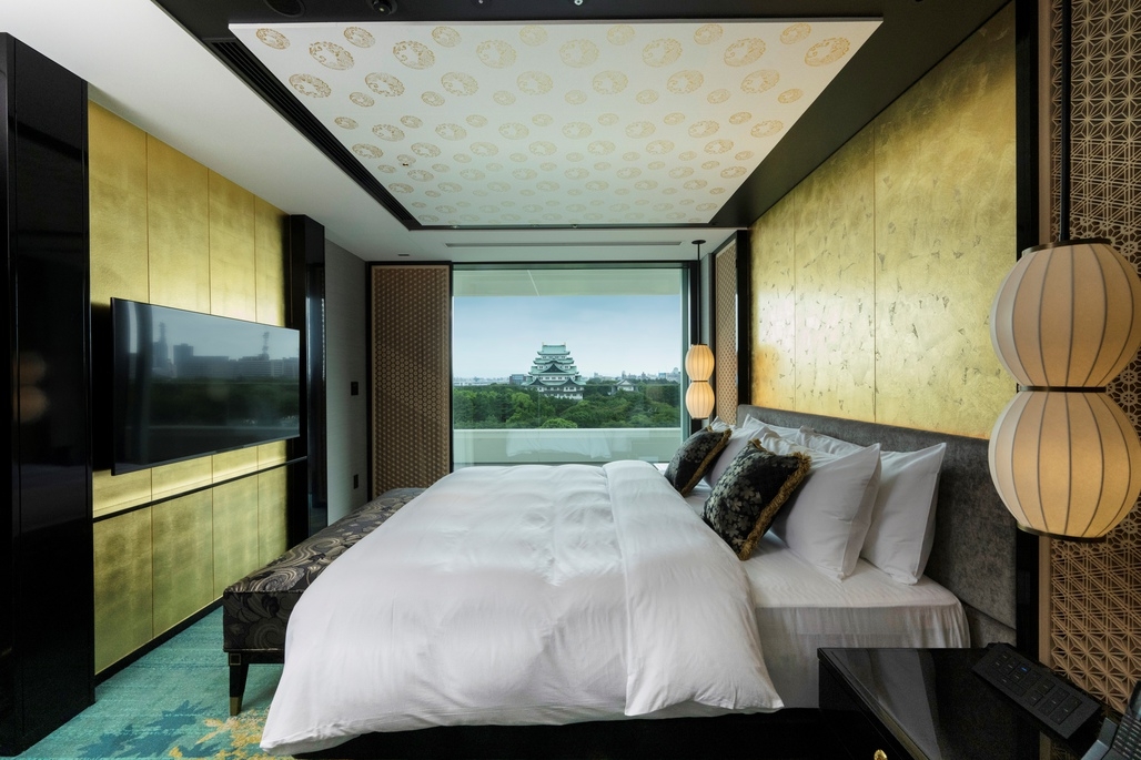 名古屋城を眼前に臨む、ラグジュアリールーム。シャープで重厚な青や紺を基調に、伝統を受け継ぎ現代の匠の技が光る極上のしつらえです。