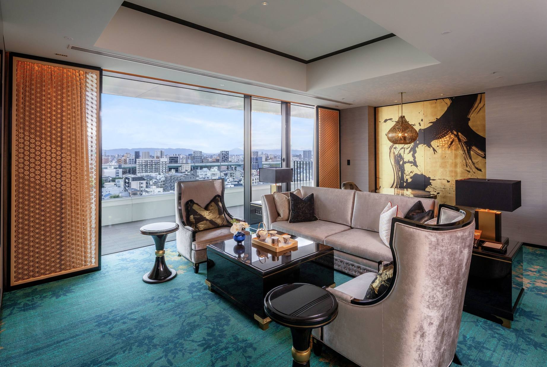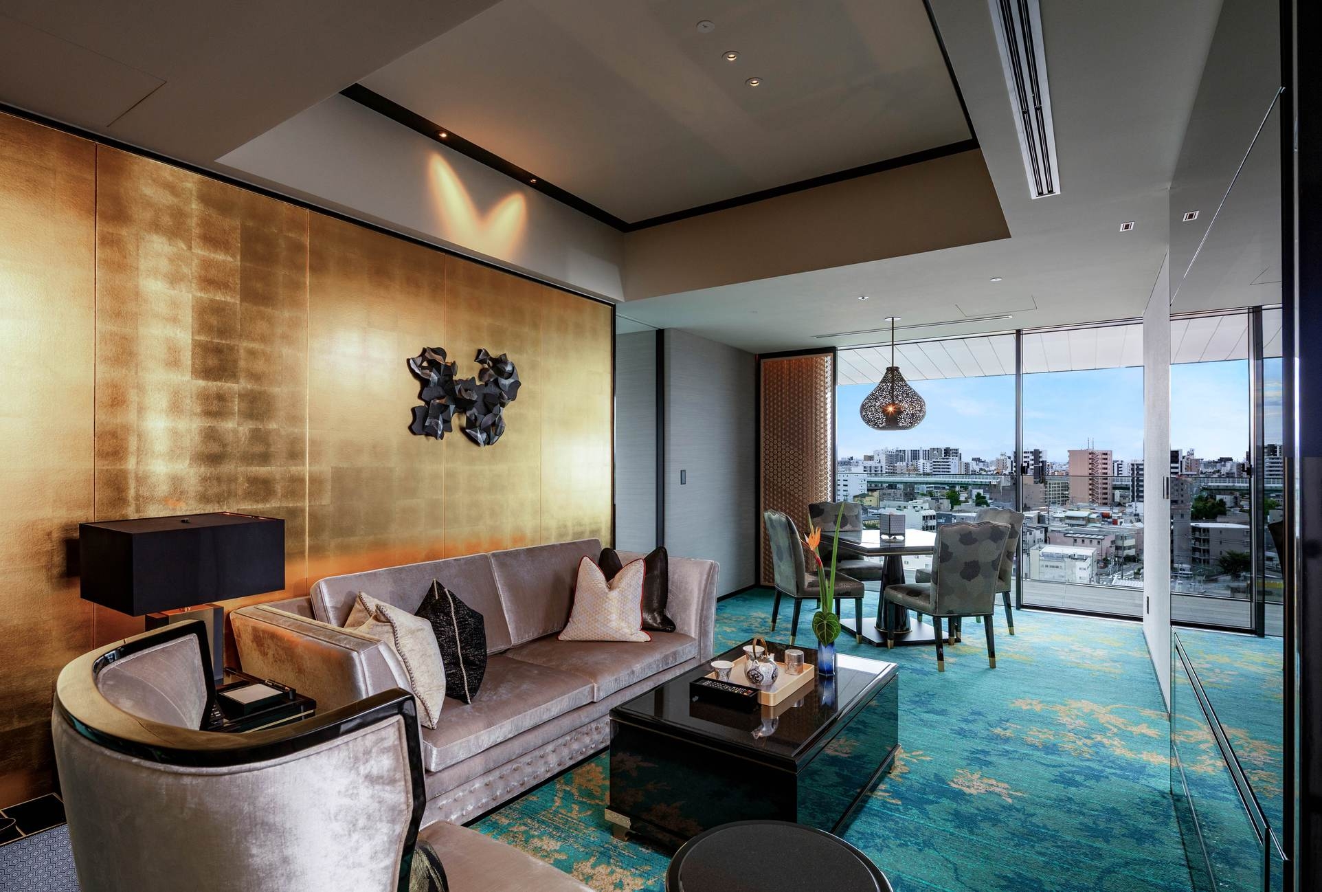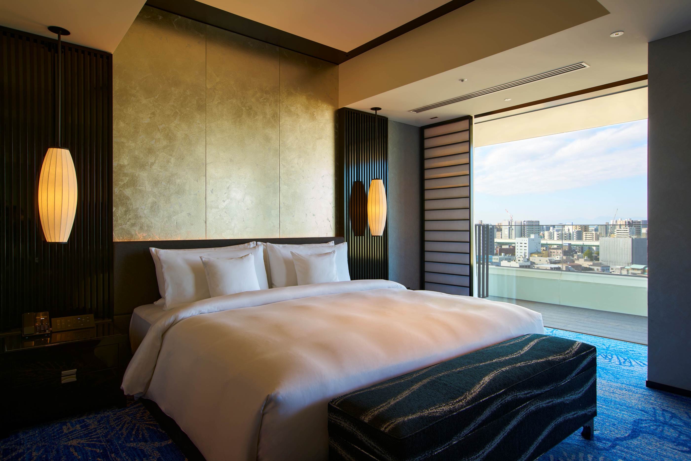 名古屋城を眼前に臨む、ラグジュアリールーム。シャープで重厚な青や紺を基調に、伝統を受け継ぎ現代の匠の技が光る極上のしつらえです。