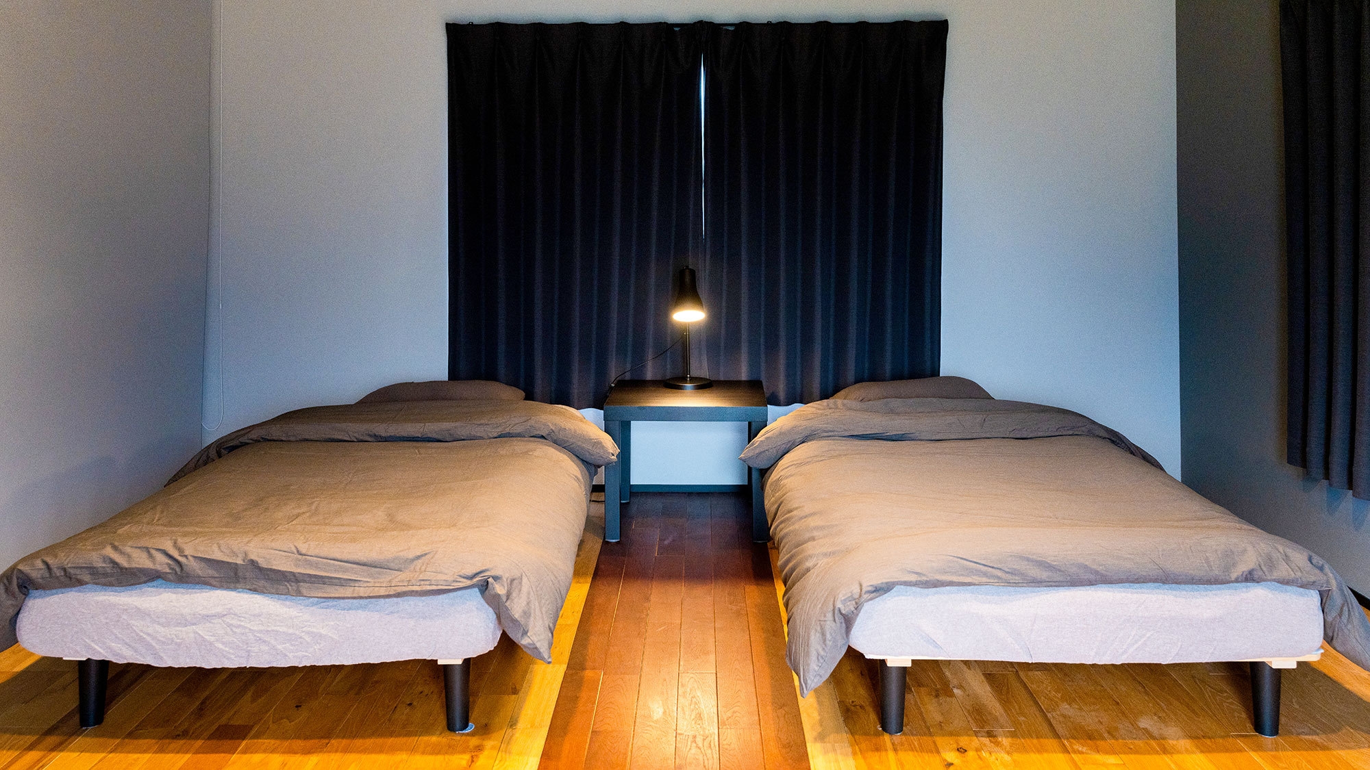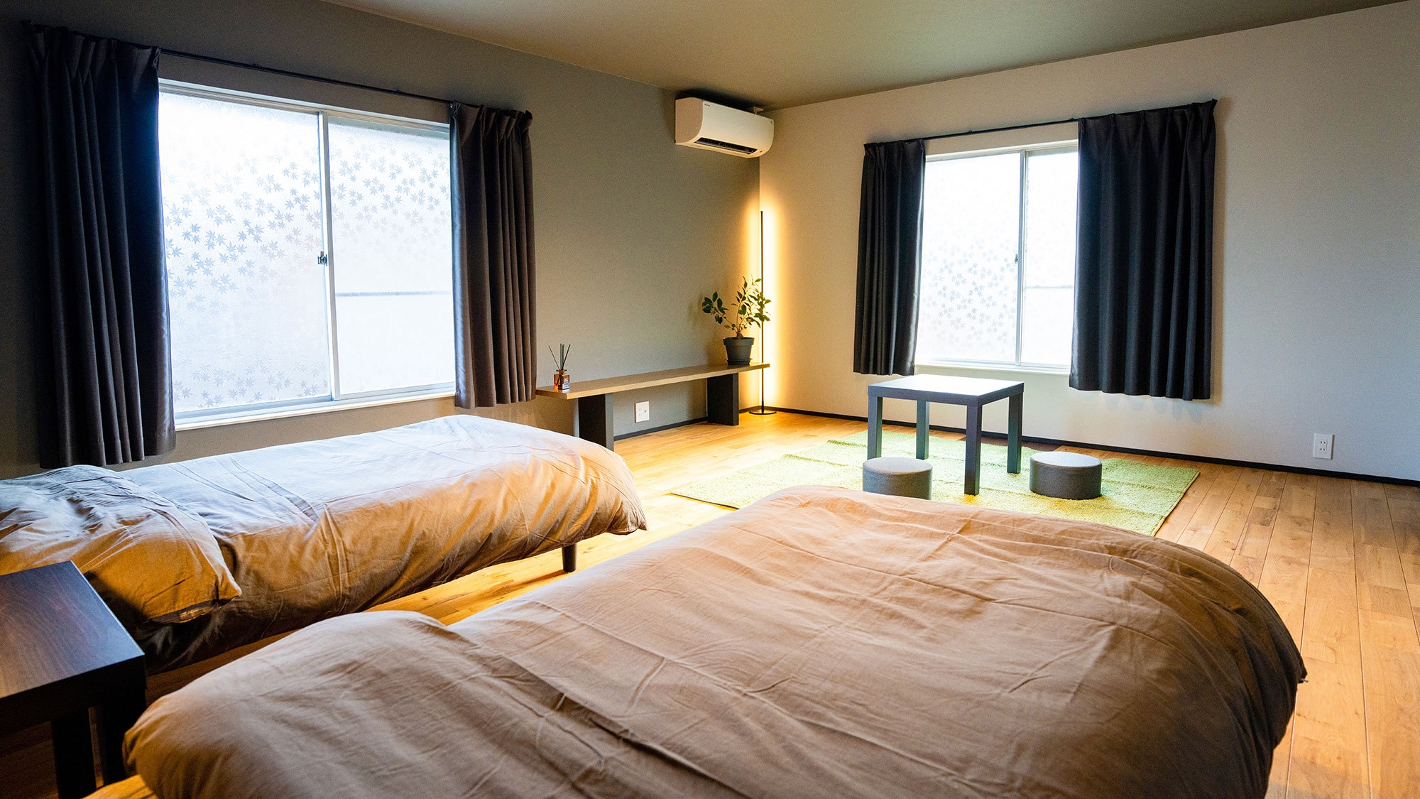 ドアを開けると統一感を大事にリノベーションデザインされた89平米の平家1棟を丸々貸切利用 ベッドルームにはシングルベッド2台と布団2組をご用意