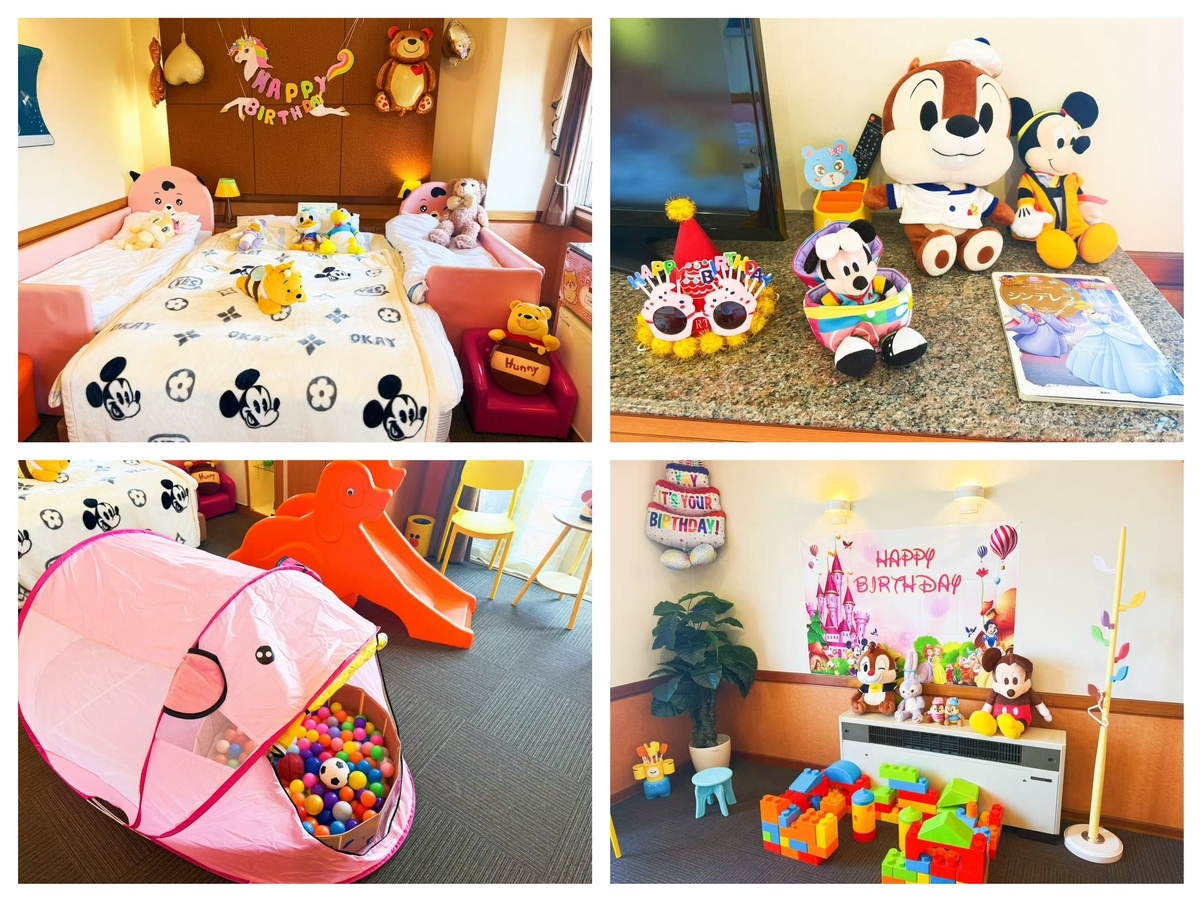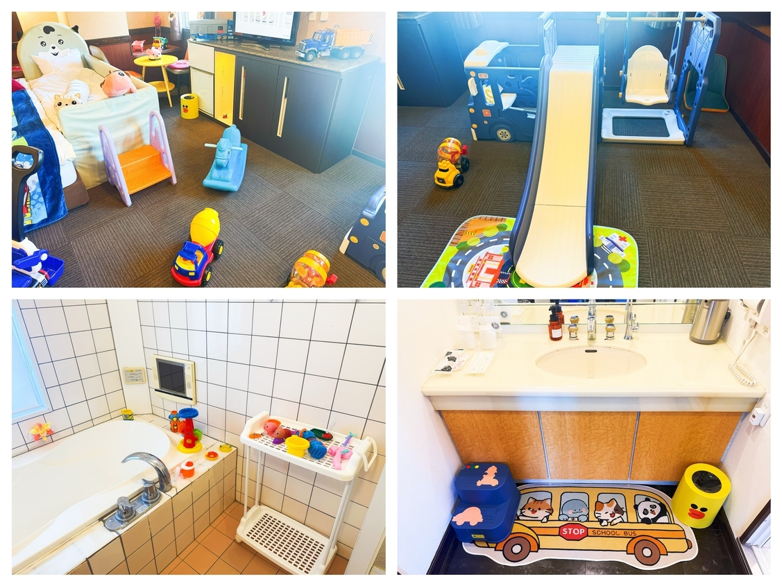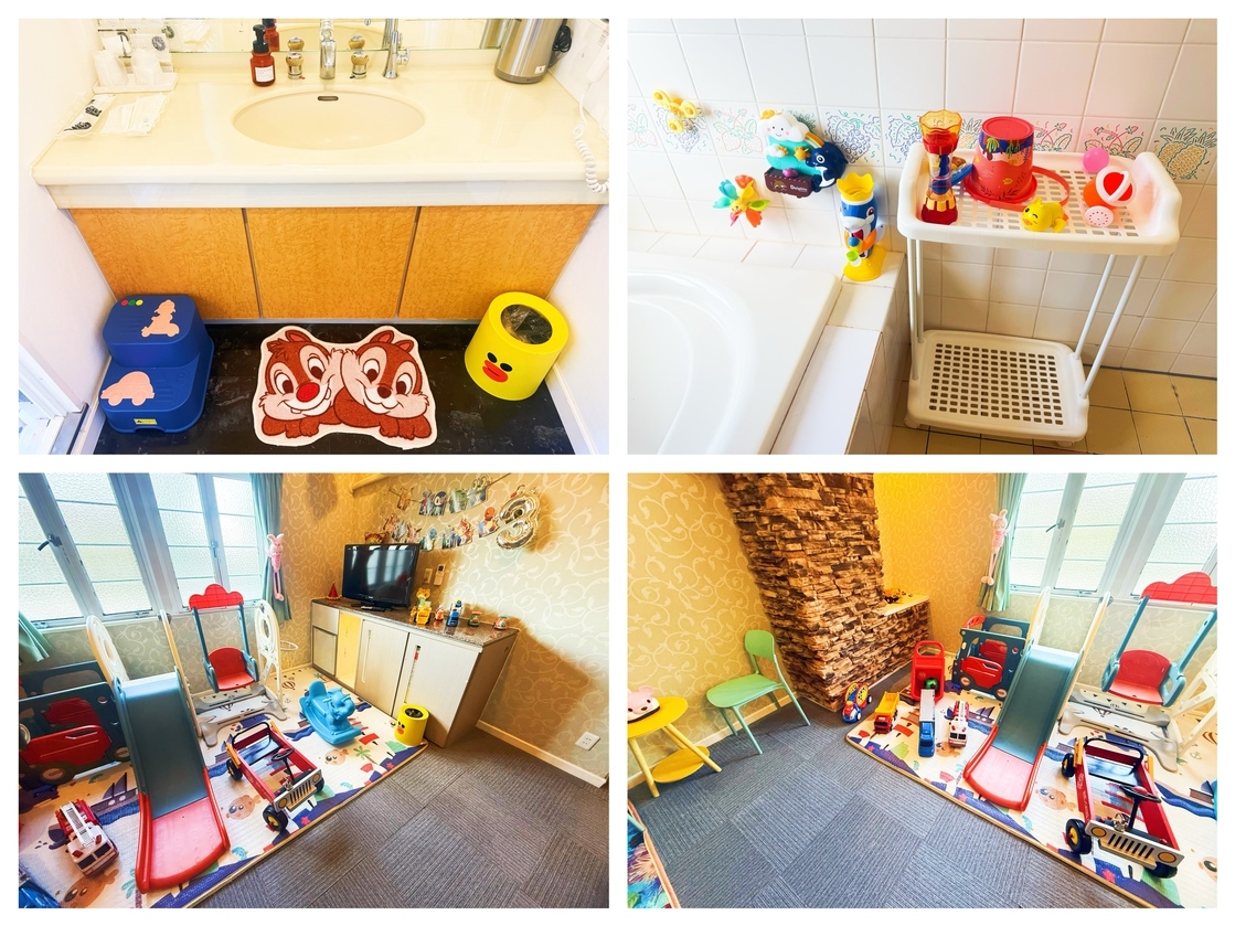 − ディズニーぬいぐるみ&遊具充実 − 踏み台・補助便座・ベビーバス完備 − 家族で安心&快適に過ごせる空間
