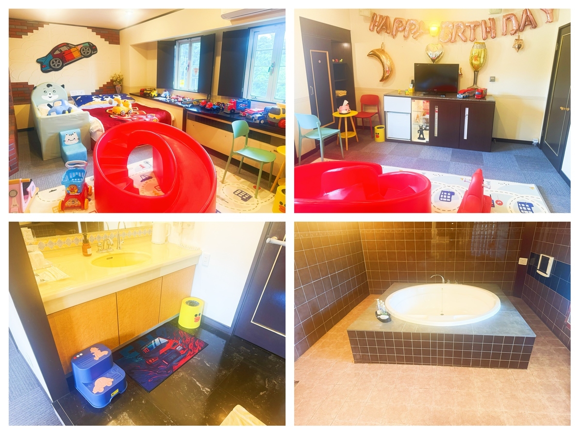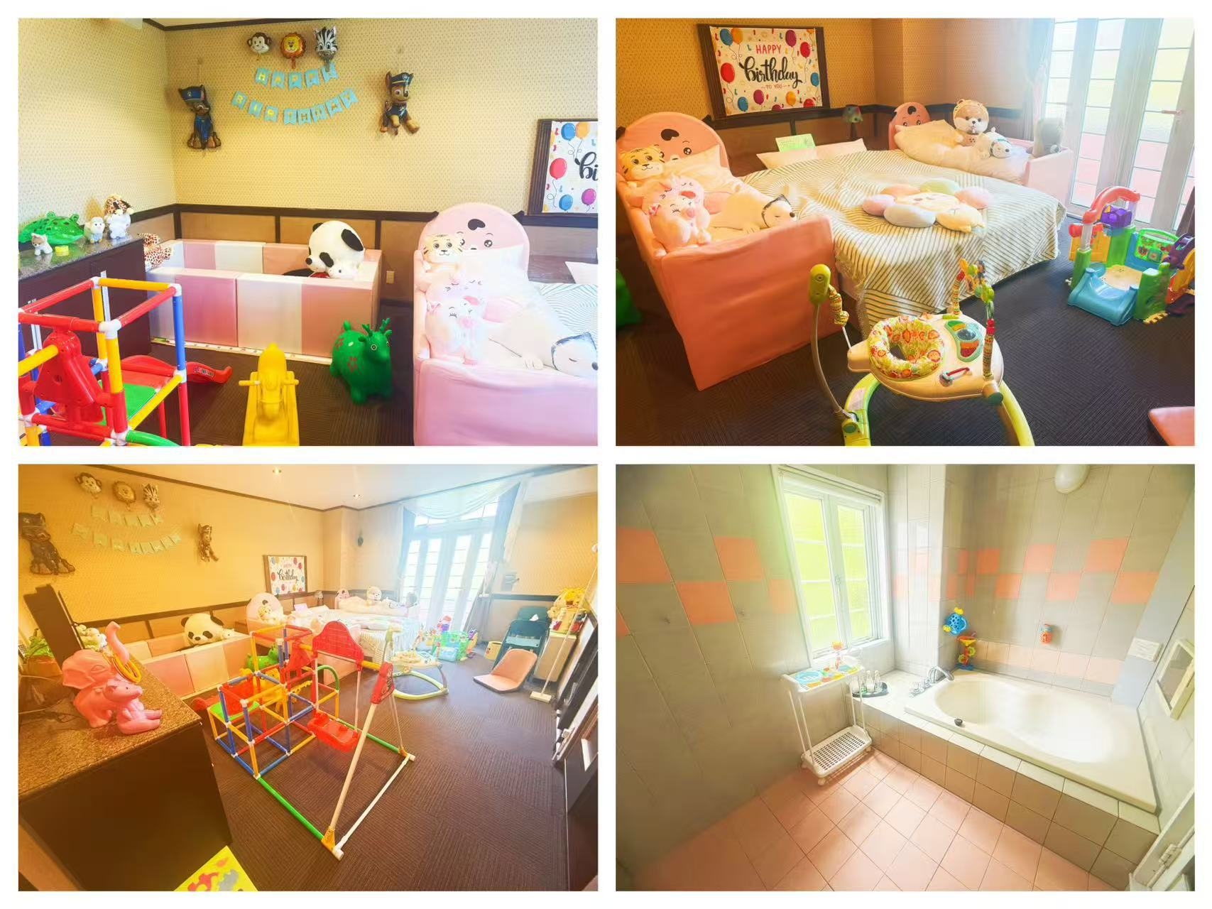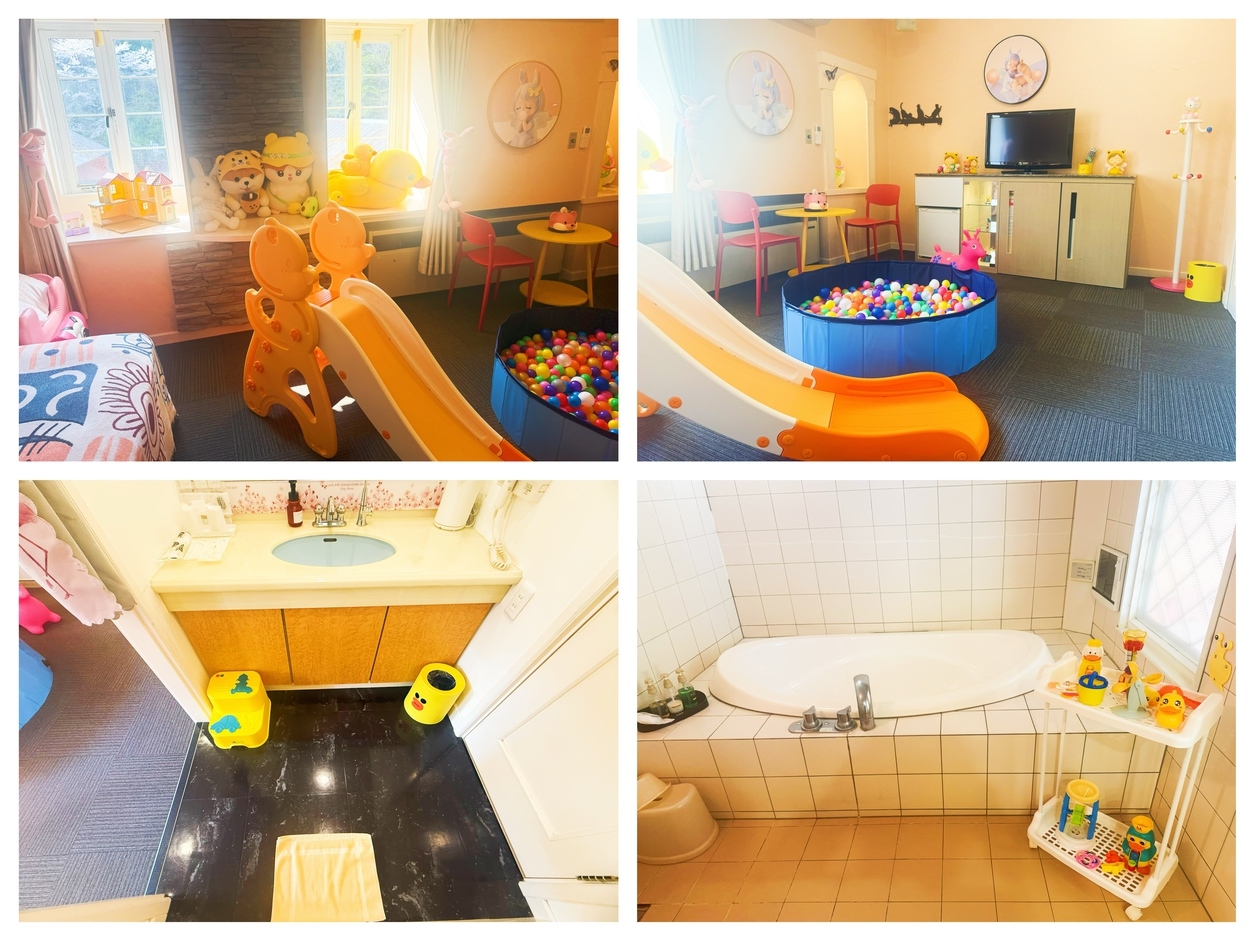 夢の世界のような空間で、ぬいぐるみや滑り台、おもちゃが満載!赤ちゃん用バスタブや子供用ステップも完備し、安心の設備。親子で楽しく過ごせる特別な場所で、素敵な思い
