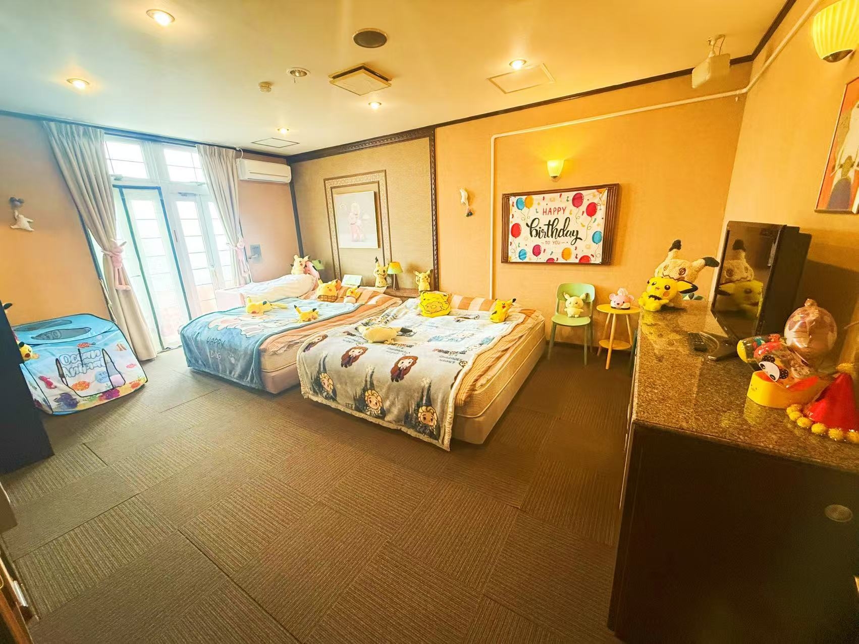 ☆チビアニマル好きなお子様が喜ぶお部屋☆ ぬいぐるみの動物たちと遊べる可愛いお部屋! ボールプール! クイーンベッド1台と子供ベッド2台が設置してあります。