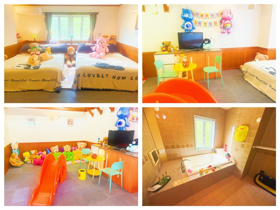 大小さまざまな熊さんに囲まれた、温かい空間!ふわふわのぬいぐるみ、滑り台やおもちゃで遊べる楽しいお部屋。広々としたバスタブや補助便座を完備し、安心設計のベッドで