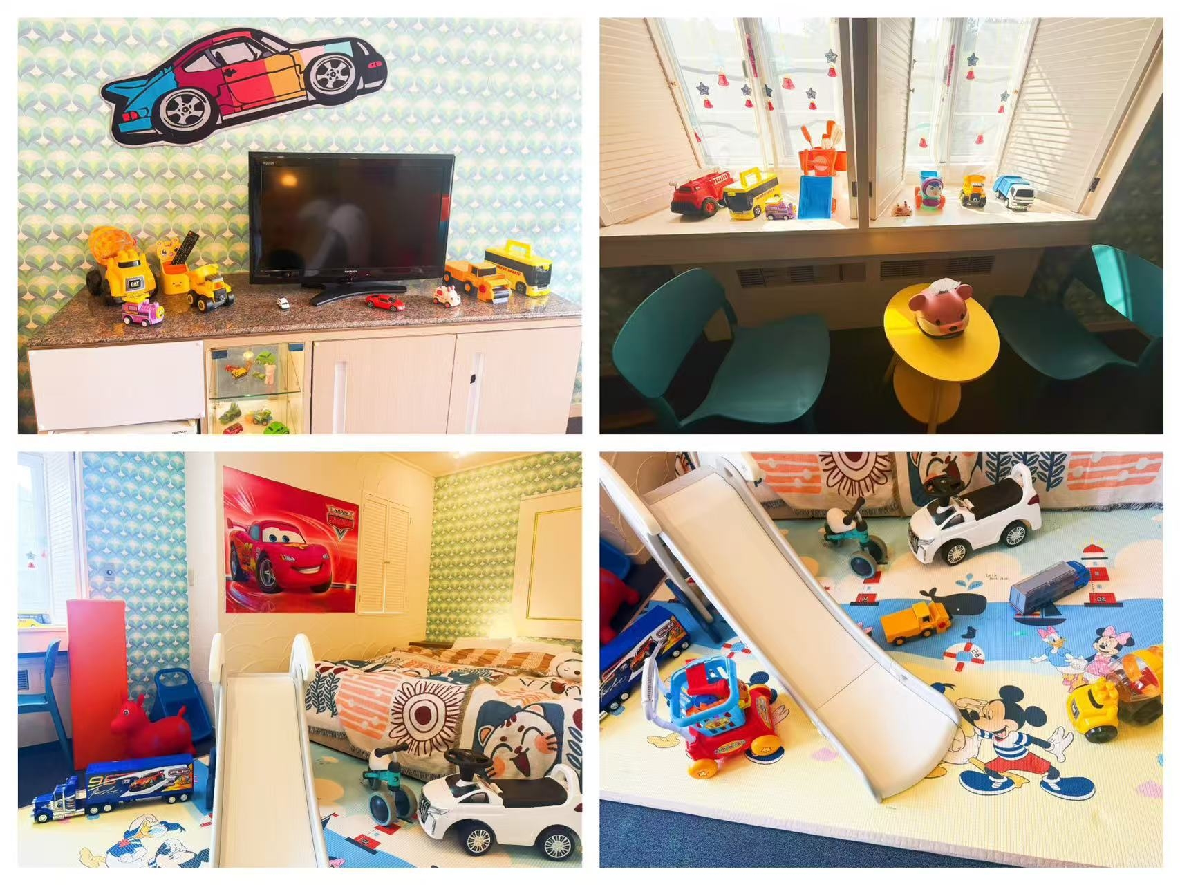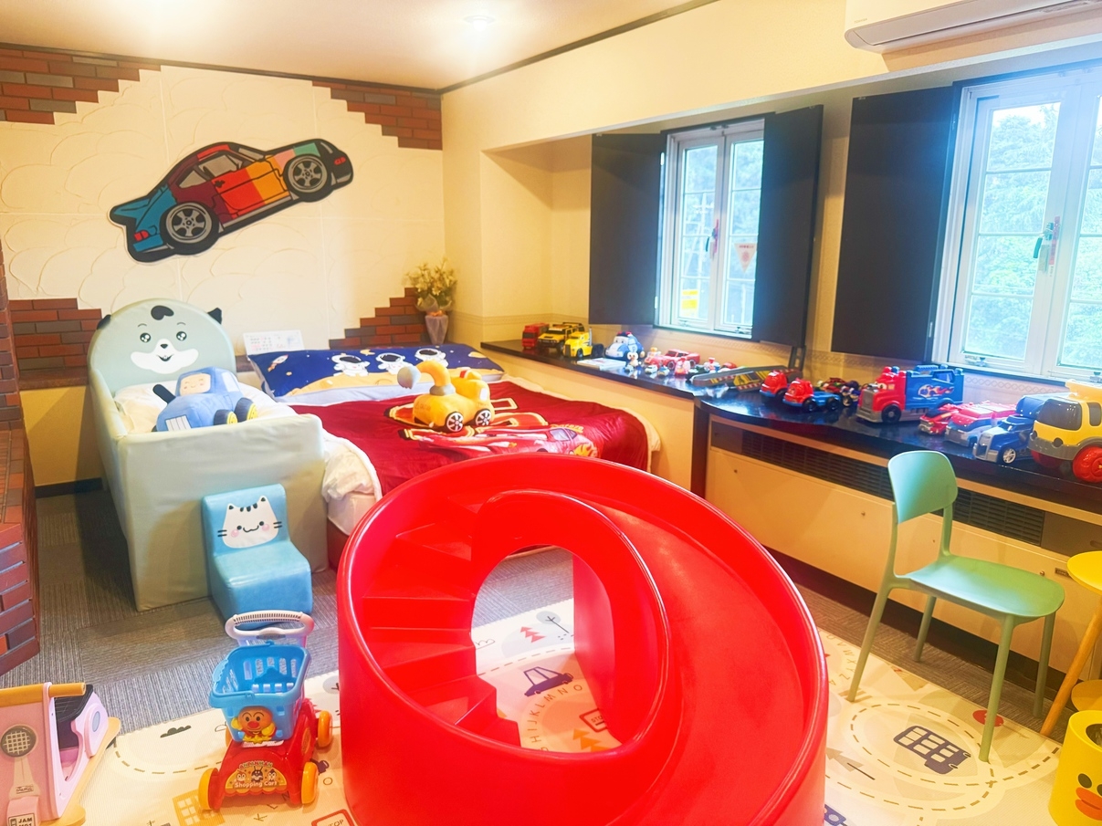 - 車のおもちゃ多数&滑り台付き - 大浴場におもちゃ、補助便座完備 - クイーンベッド2台、壁紙も楽しい -山の景色に癒される開放感のある客室
