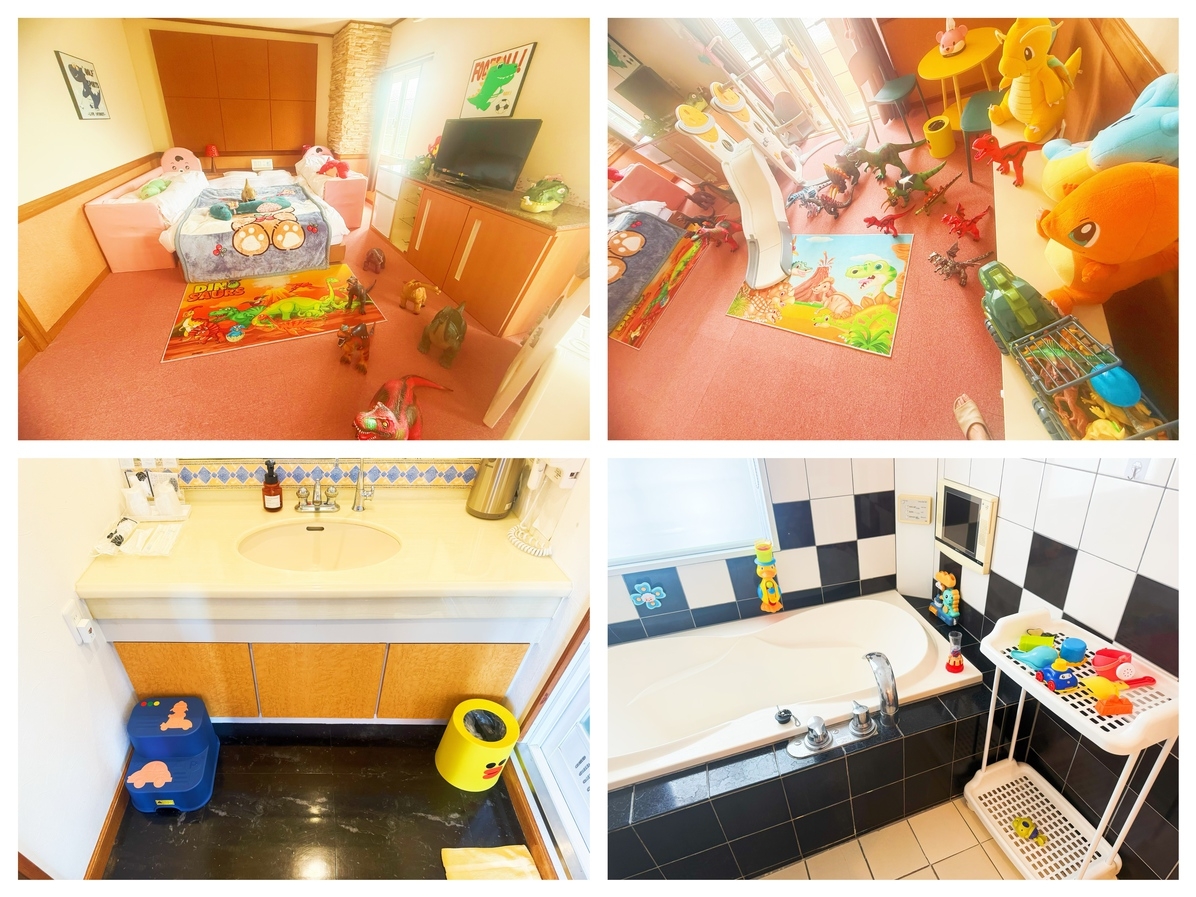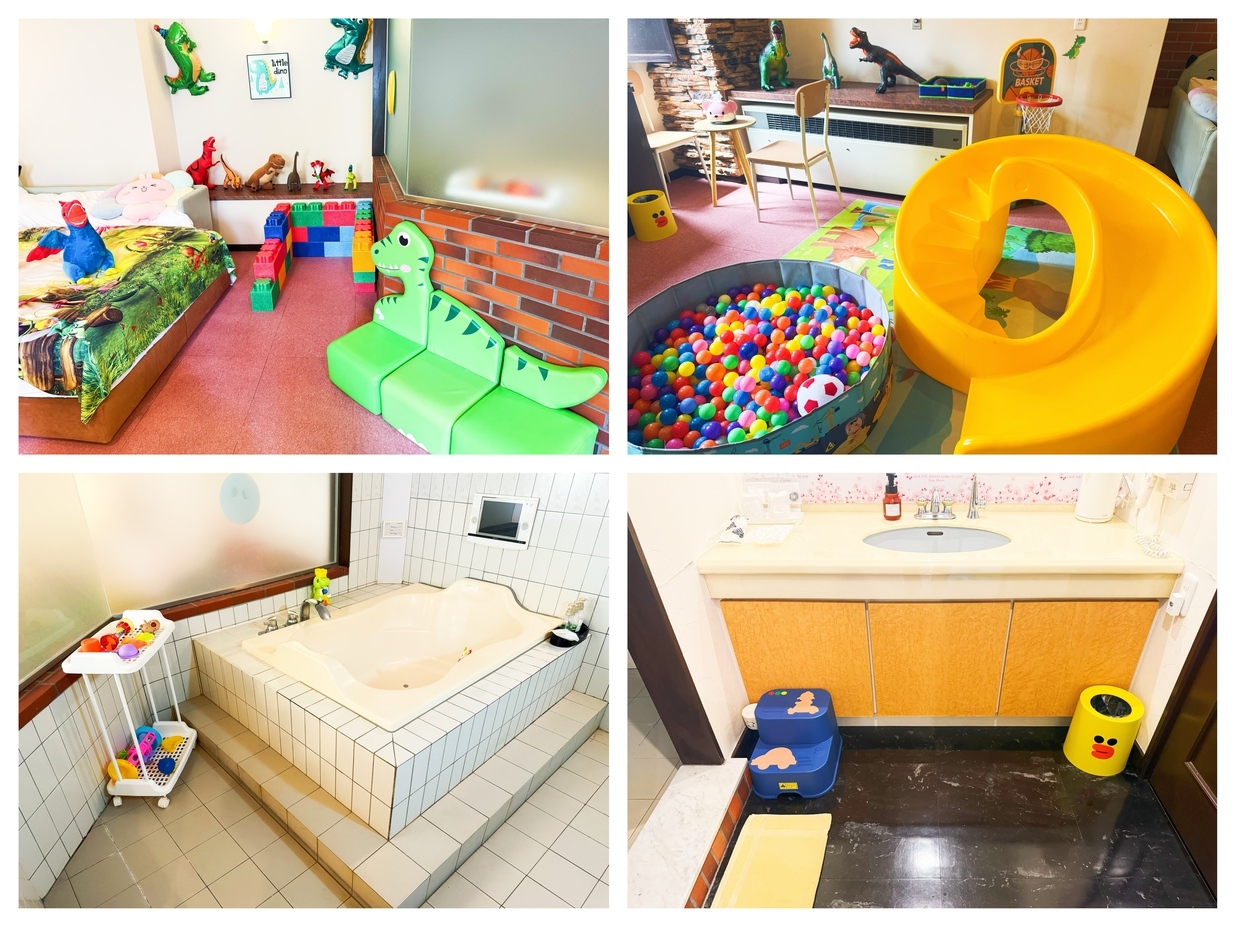 恐竜装飾とぬいぐるみに囲まれた冒険気分の客室 滑り台・ブランコ付きの遊べる空間 − 踏み台・補助便座でお子様も安心 幼児用バスタブとおもちゃ付き